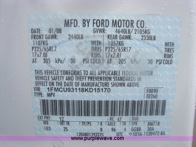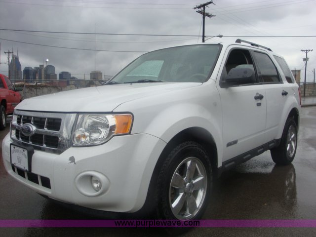 Purple Wave is selling a used Passenger Vehicle in Tennessee. This item is a 2008 Ford Escape XLT SUV with the following: 76,013 miles on odometer, 3.0L V6 DOHC 24V gas engine, Automatic transmission, Four wheel drive, AC, Cruise, AM/FM/CD, Power locks, windows, mirrors, and drivers seat, Cloth interior, Keyless entry, One set of keys provided, Receiver hitch, 225/65R17 tires, Paint scuffs on front and rear bumpers, EIN 753219RA