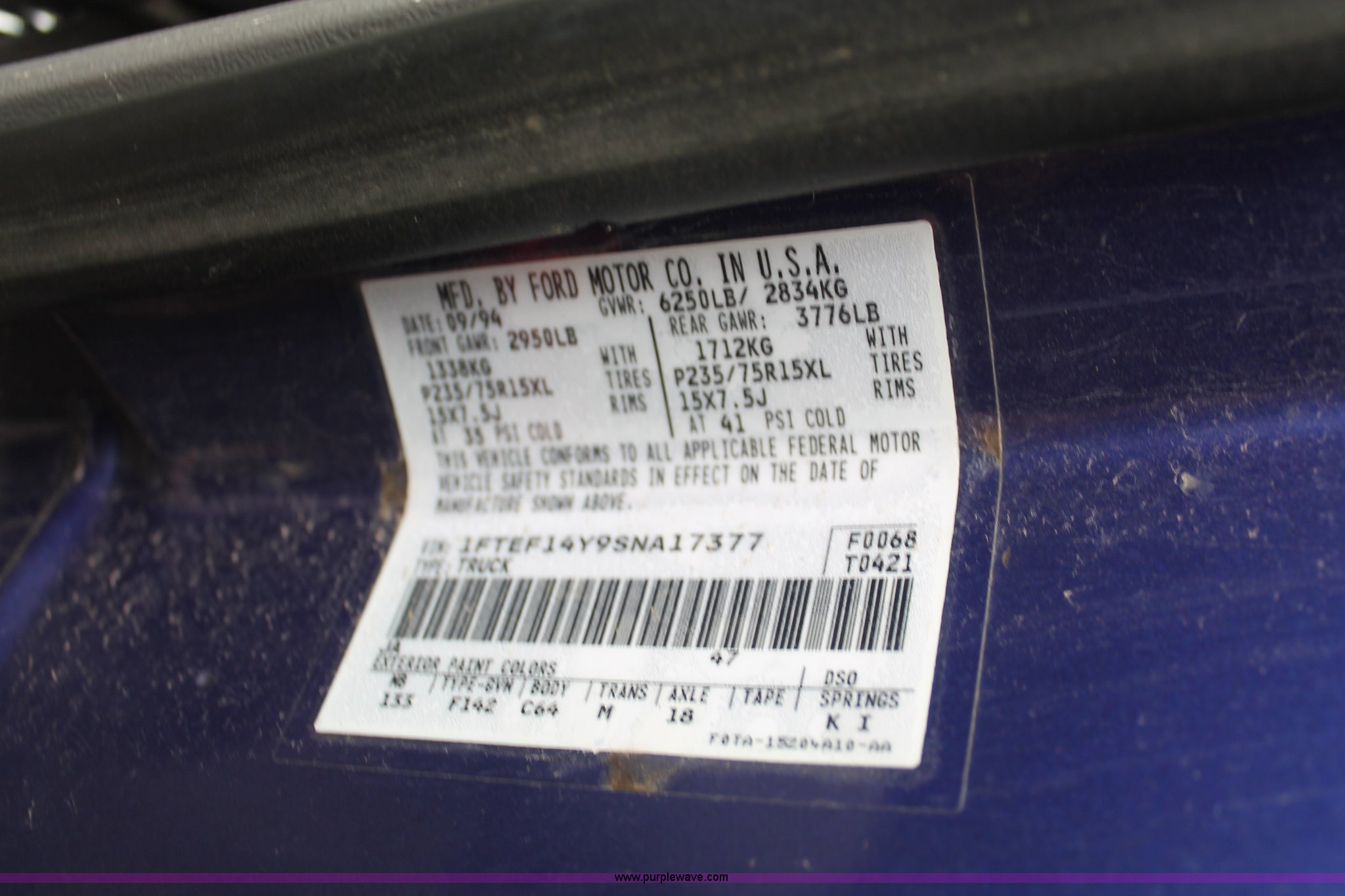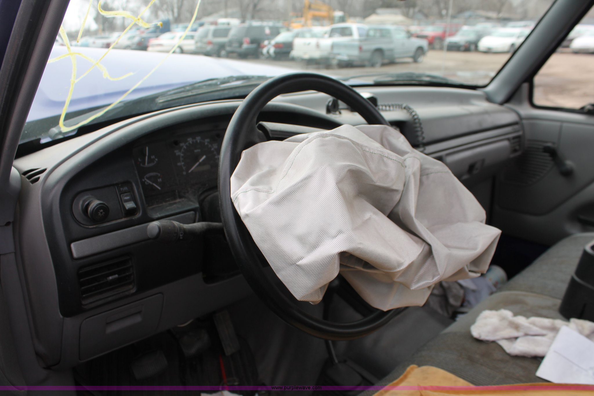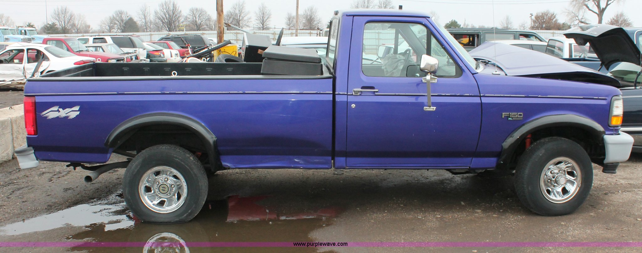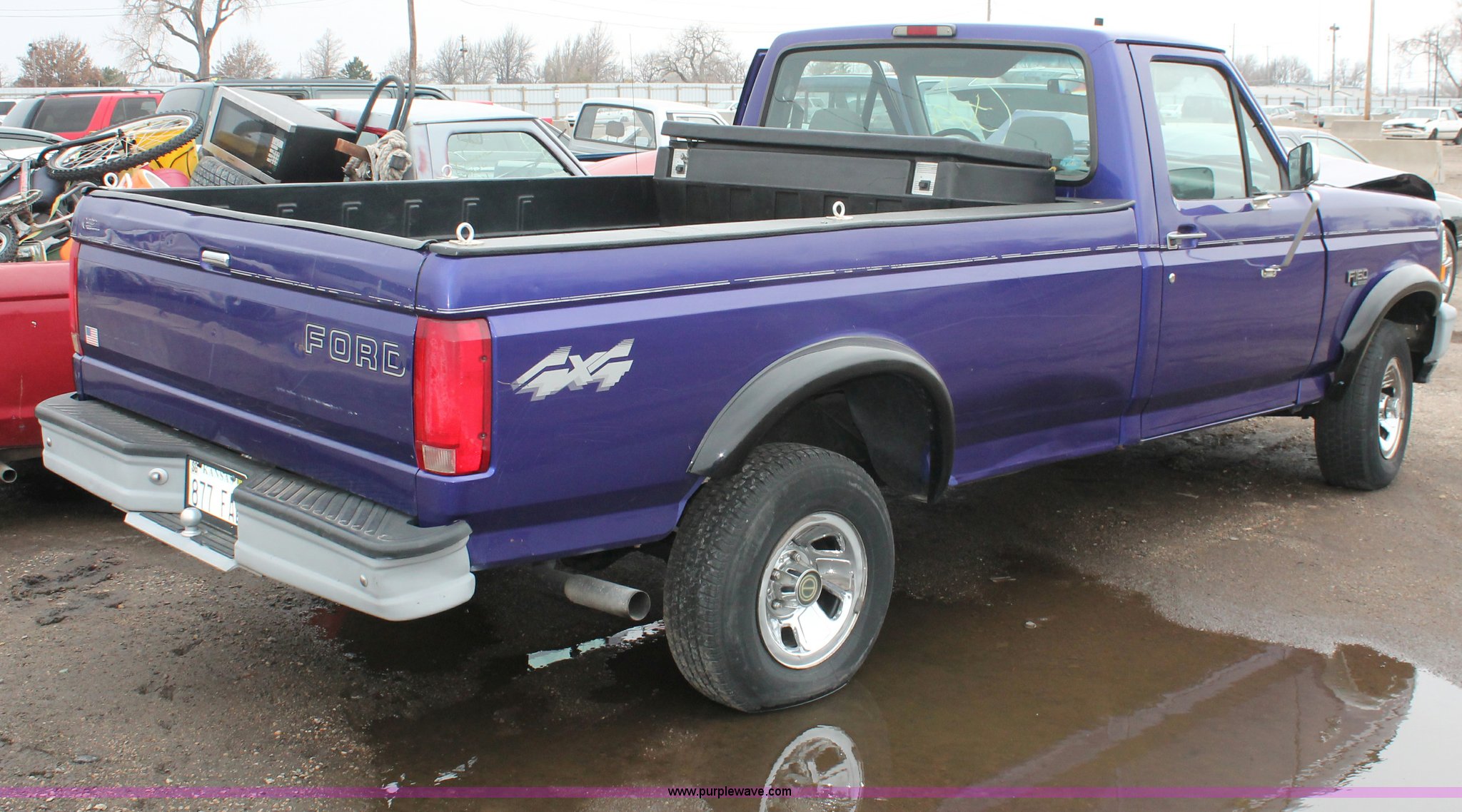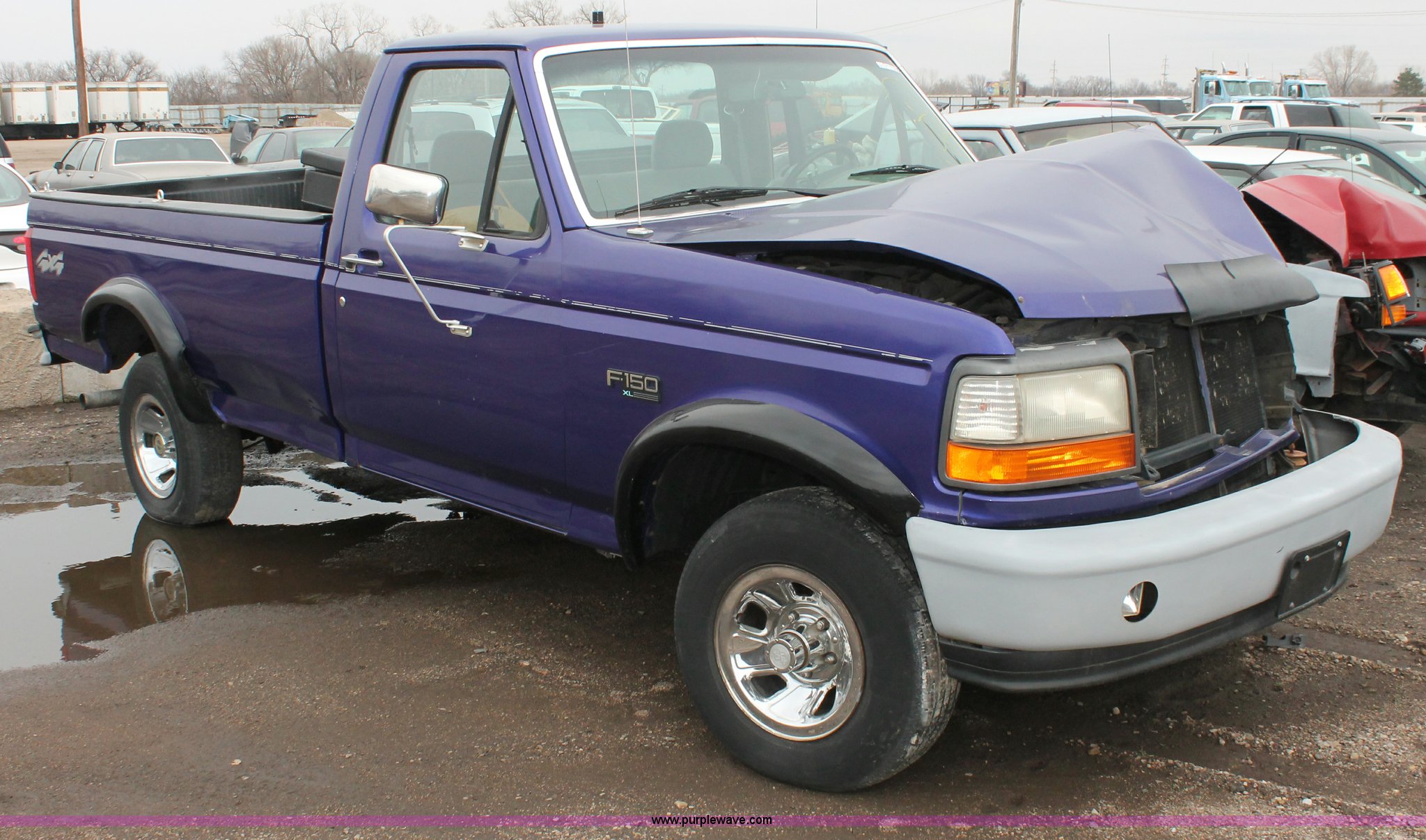 Purple Wave is selling a used Wrecked and Abandoned in Kansas. This item is a 1995 Ford F150 XL pickup truck with the following: Unknown miles on odometer, 4.9L L6 OHV 12V gas engine, Five speed manual transmission, Four wheel drive, AC and heat, Tilt, Cruise, AM/FM/CD, Manual windows and locks, Cloth interior, Receiver hitch, 2" ball, Bed liner, Toolbox, Dual fuel tanks, P235/75R15 tires, Front end damage, Air bags deployed, Interior/exterior cosmetic damage, Case# 12c73966