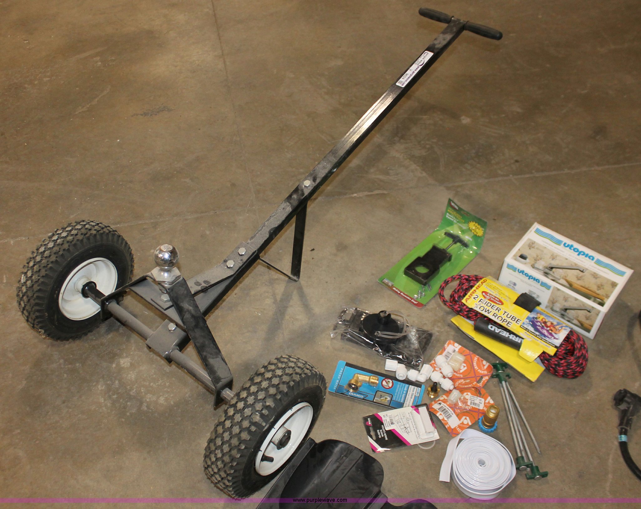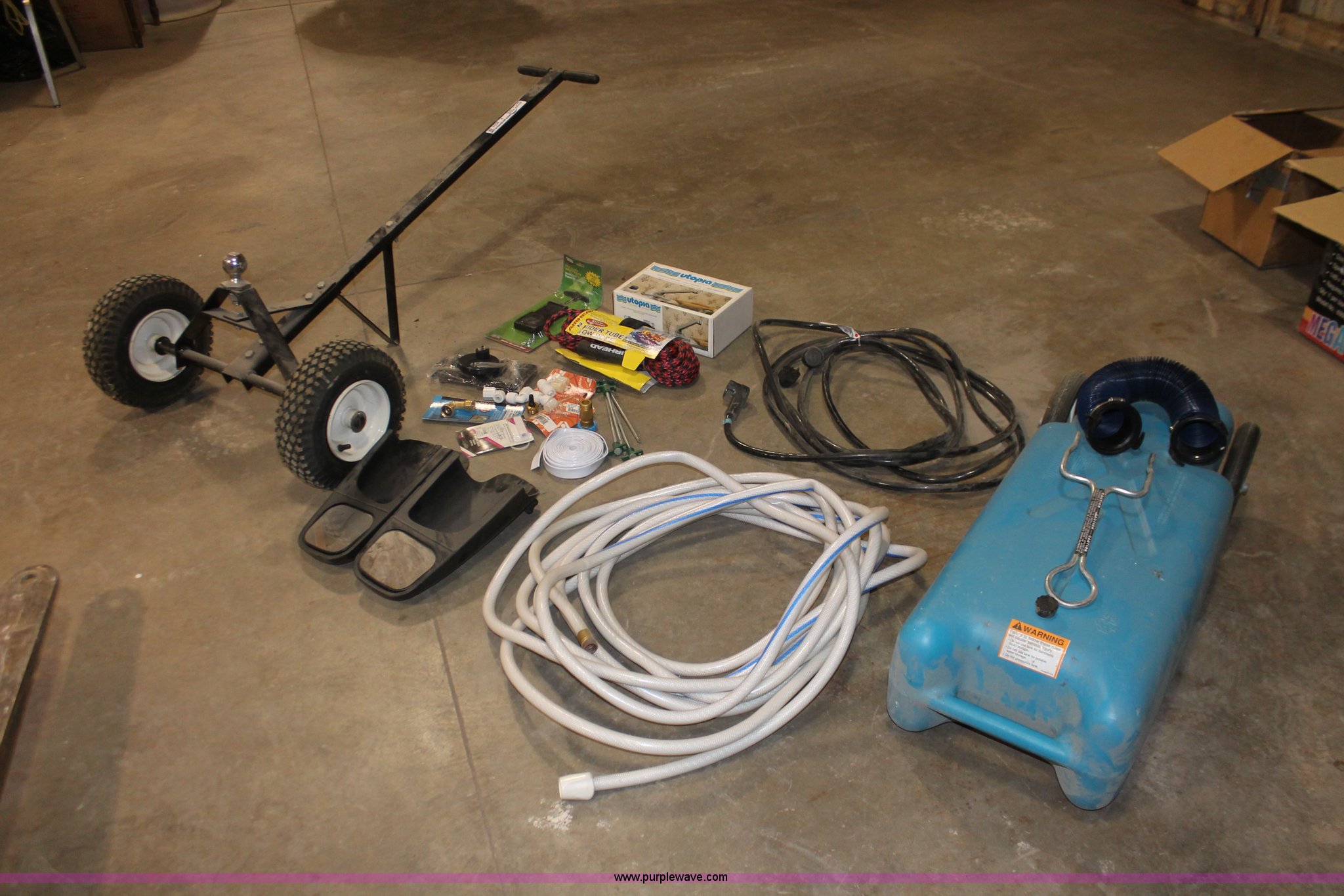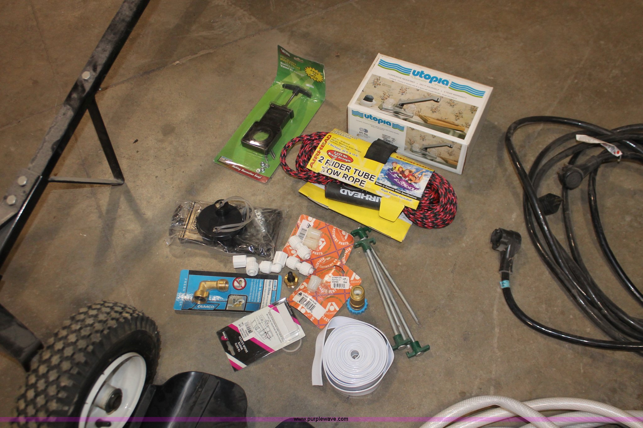 Purple Wave is selling a used Sporting Goods in Kansas. This item is a Assorted camping accessories with the following: 2" ball dolly, Two rider tube tow rope, Hose, 220V extension cord and more