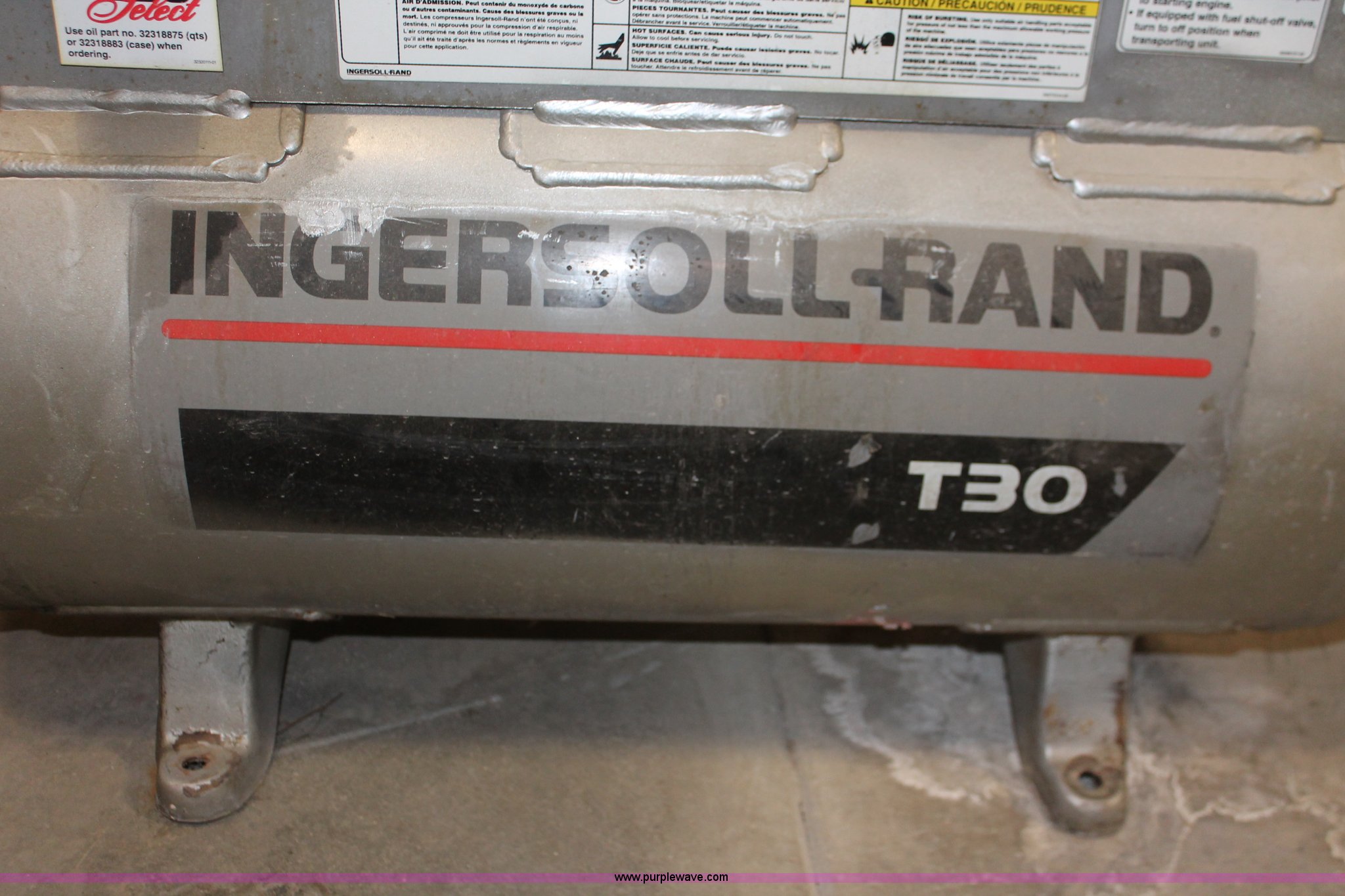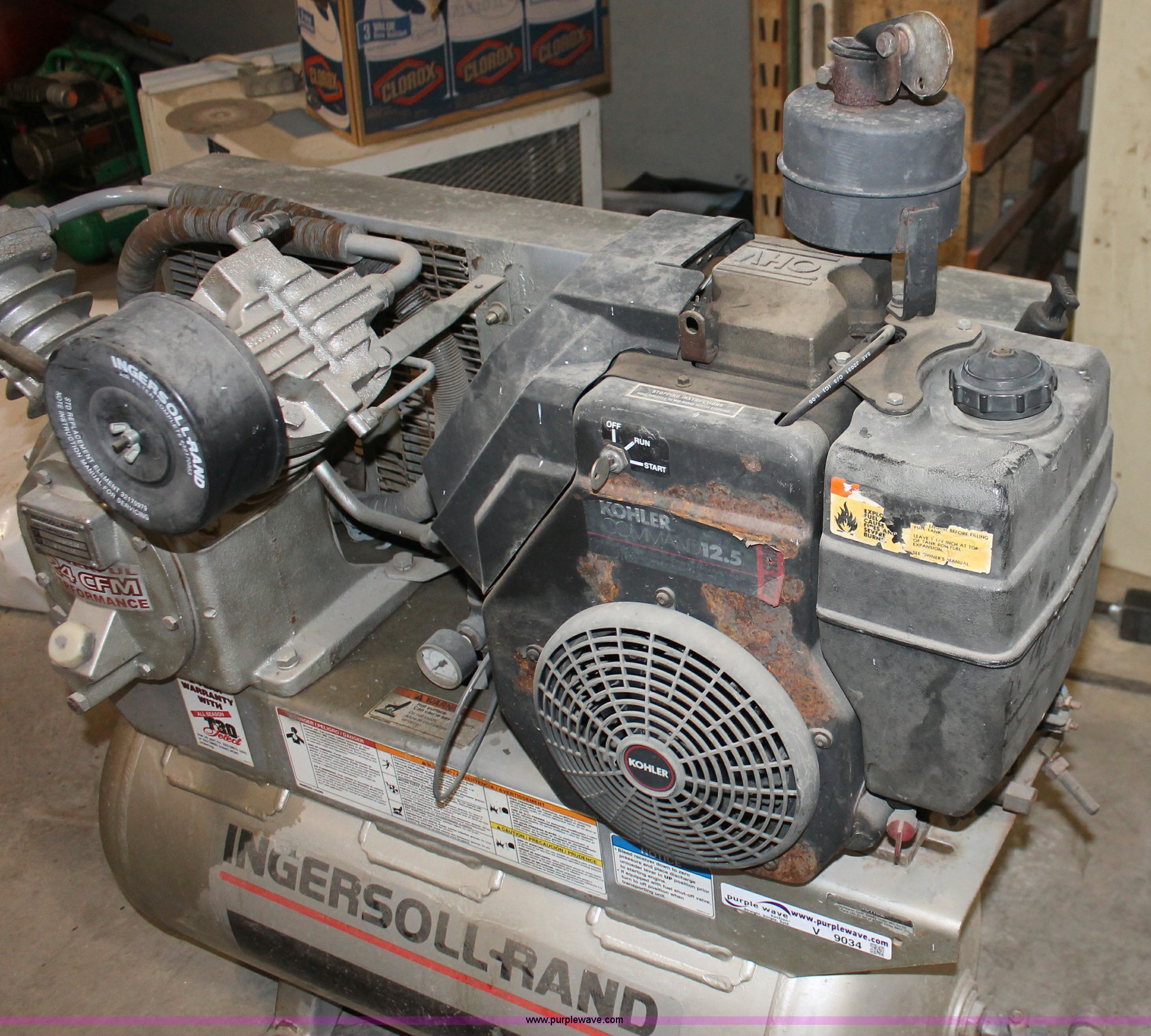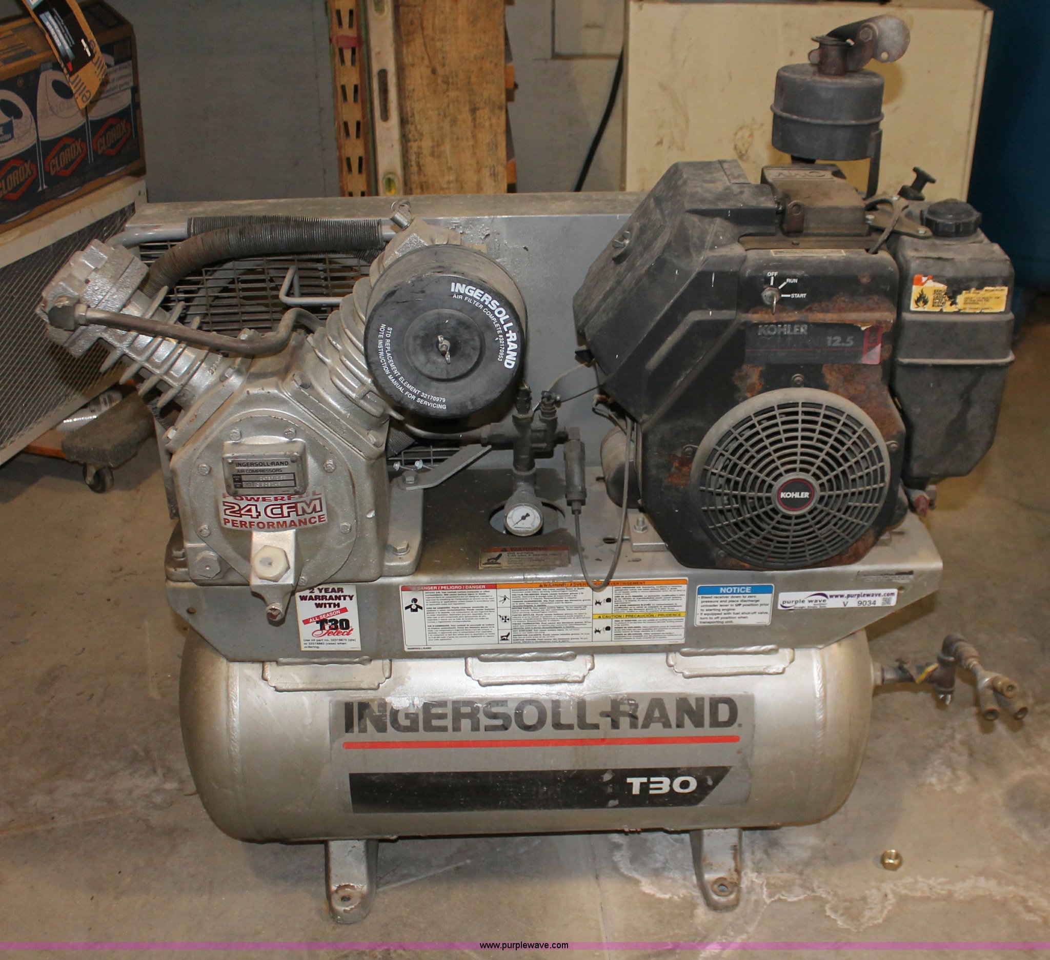 Purple Wave is selling a used Air Compressor in Kansas. This item is a Ingersoll Rand T30 air compressor with the following: Kohler Command 12.5 HP gas engine, 24 cfm, Tri-tip outlet valve, Model 247SF12.5G, Serial 30TC905149