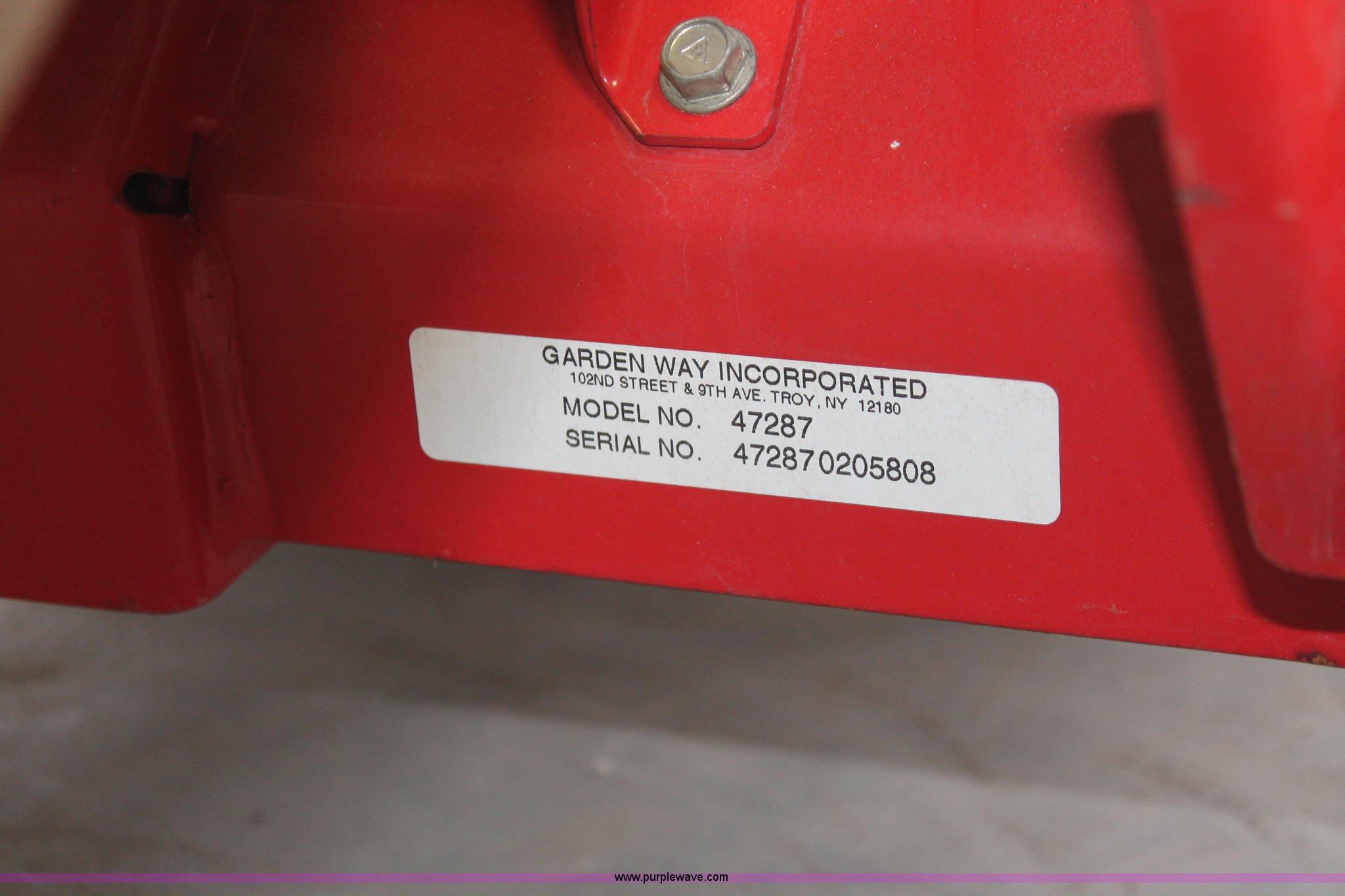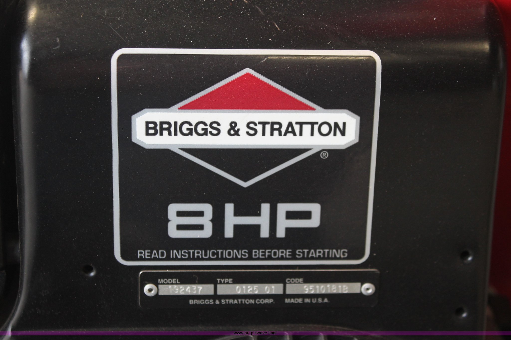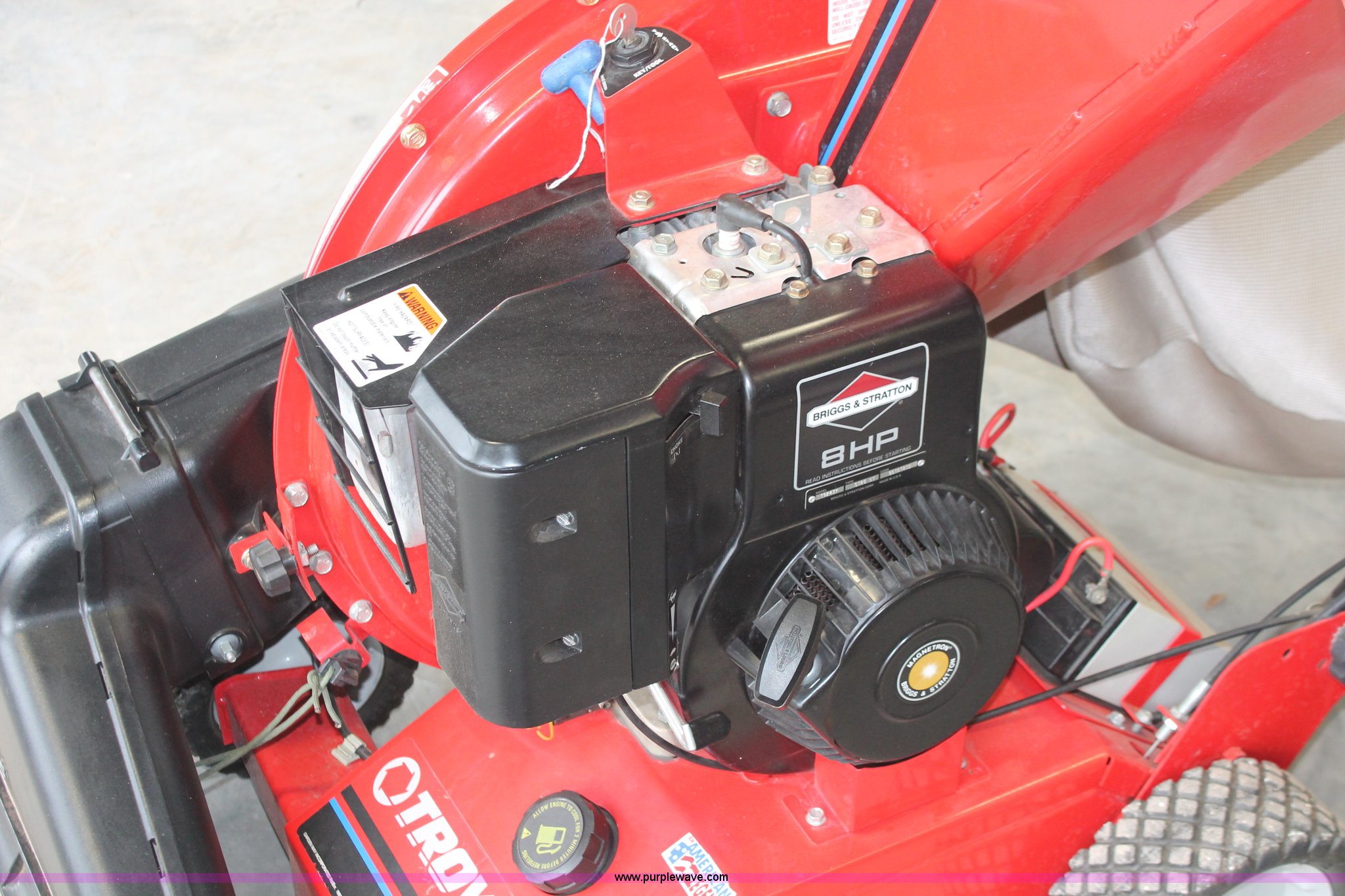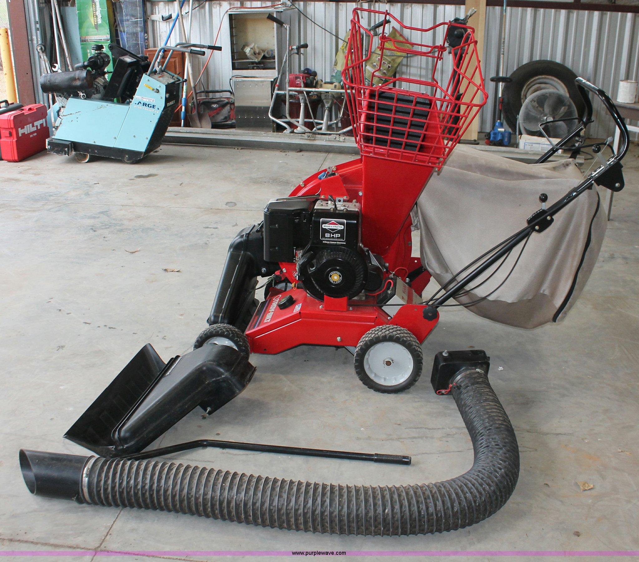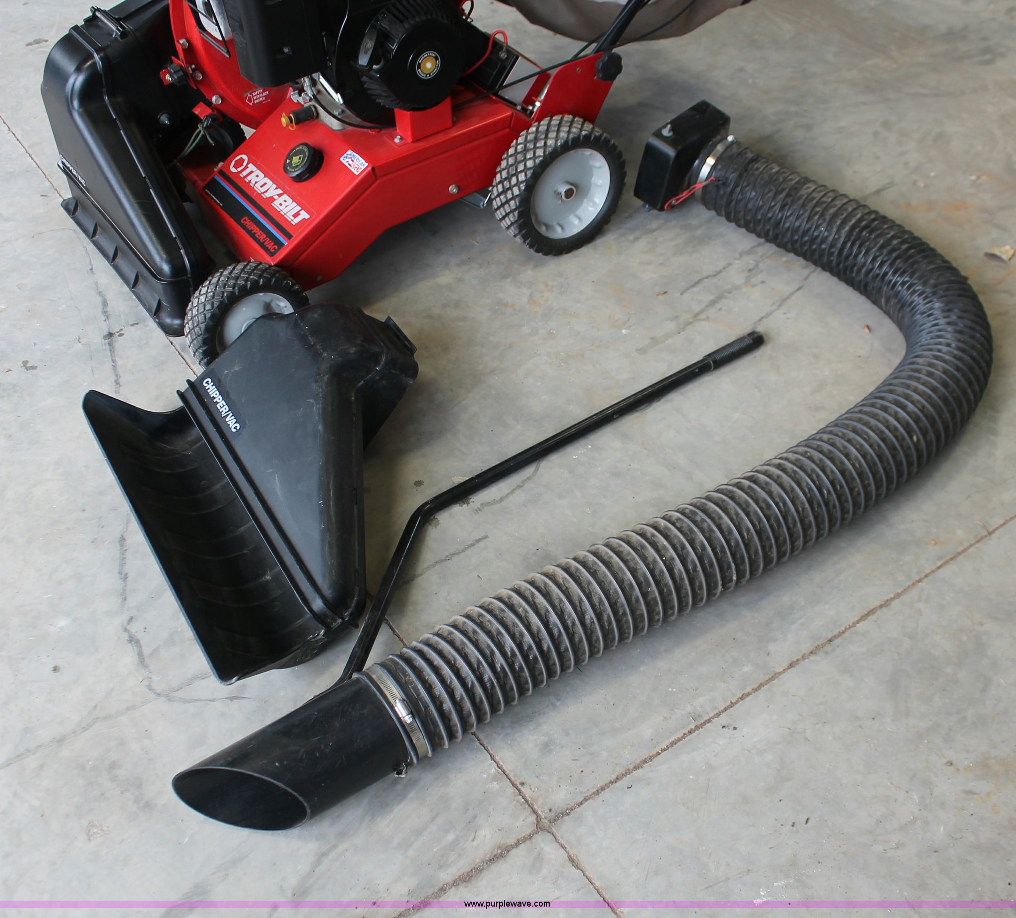 Purple Wave is selling a used Tools in Kansas. This item is a Troy-Bilt chipper vacuum with the following: Model 47287, Briggs & Stratton 8 HP gas engine, Three speed transmission, Reverse, 20" chipper vacuum clearing width, 10" brush chute capacity, Discharge bag, (2) additional sweeper vacuum attachments, Serial 472870205808