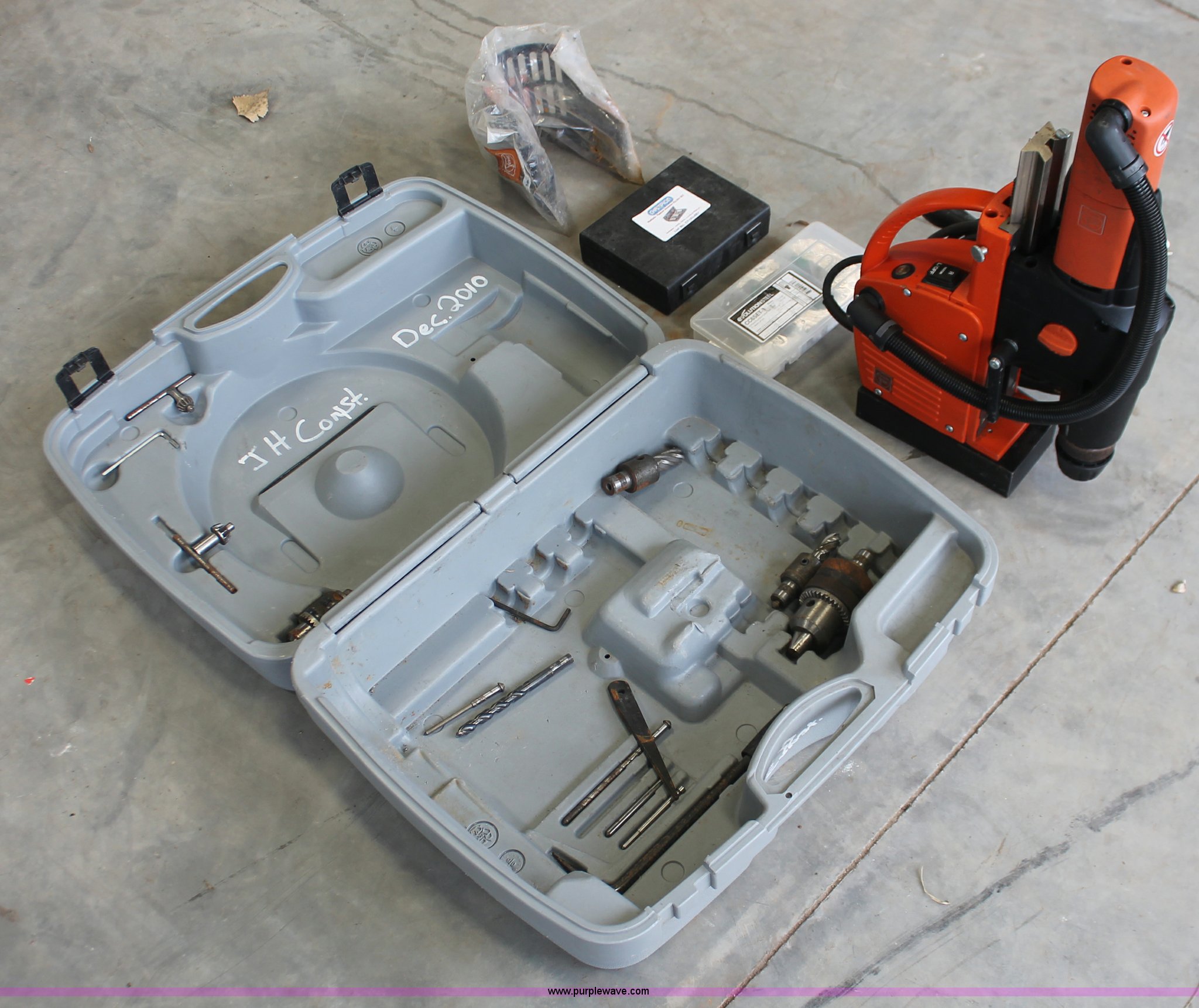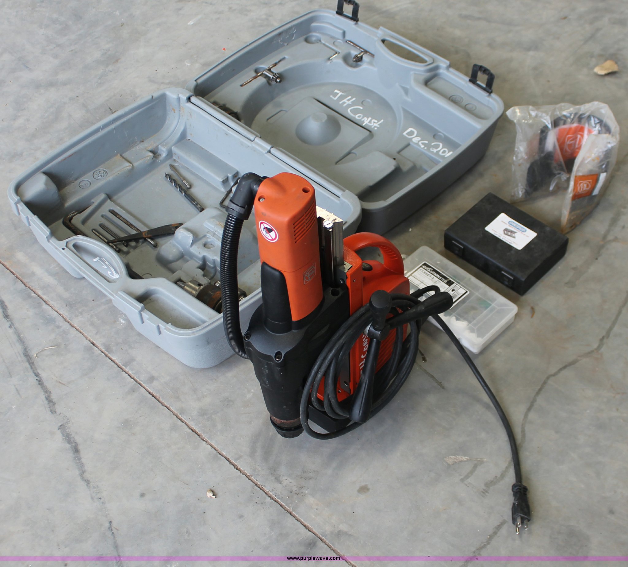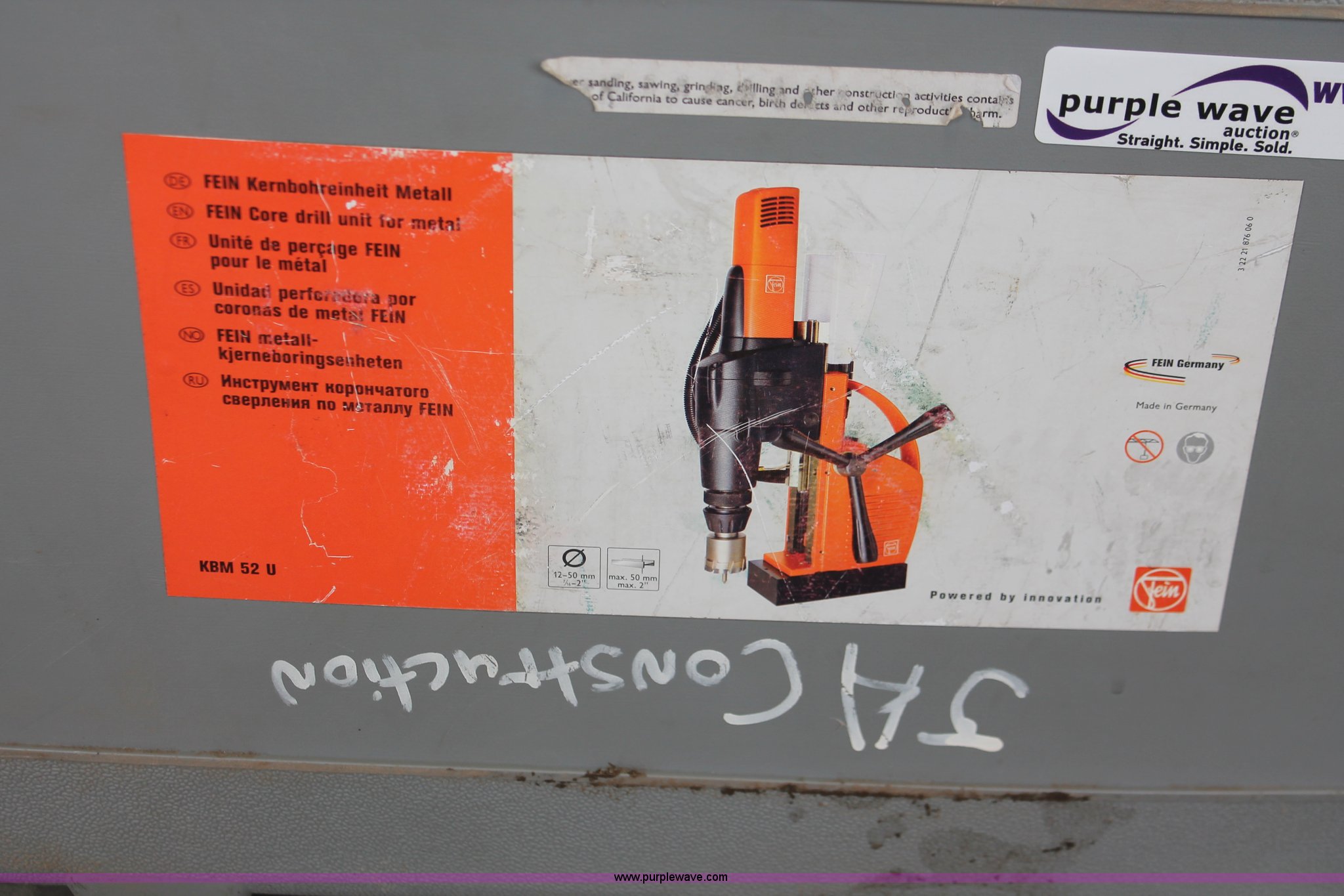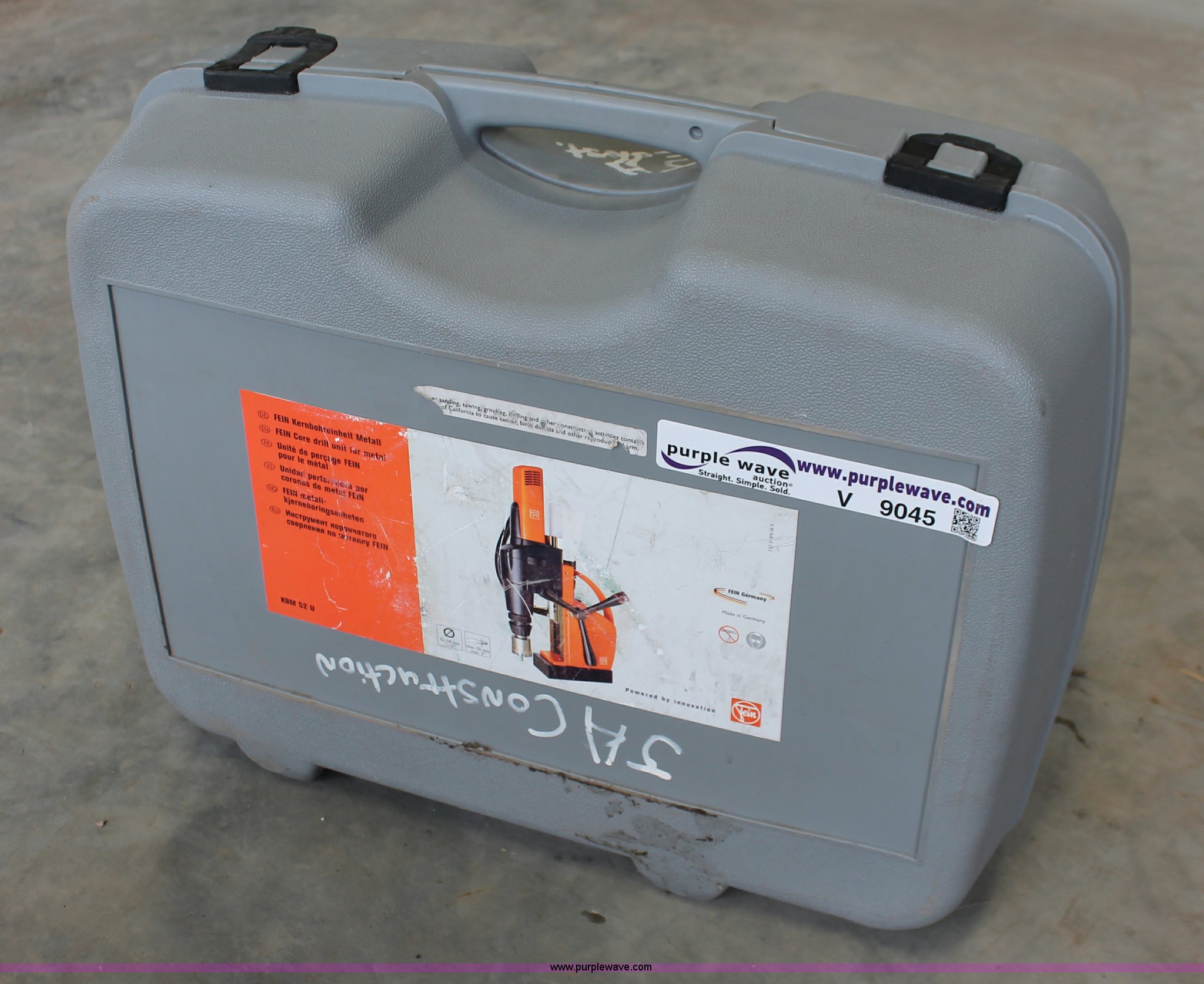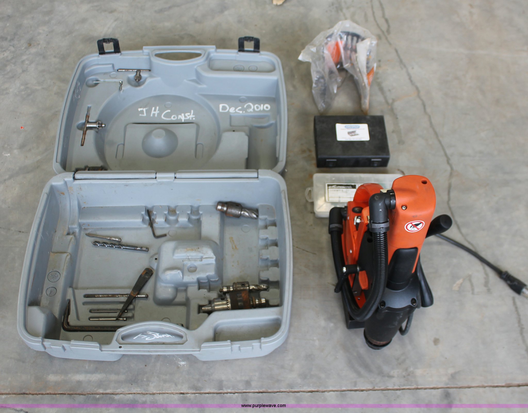 Purple Wave is selling a used Tools in Kansas. This item is a Fein portable magnetic drill with the following: 120V, 1,200 watt, KBM 524, Champion carbide tipped annular gutter kit, Evluation steel CL6SET-1 Cyclone cutter set, Cutting oil attachment, Additional drill bits and accessories included