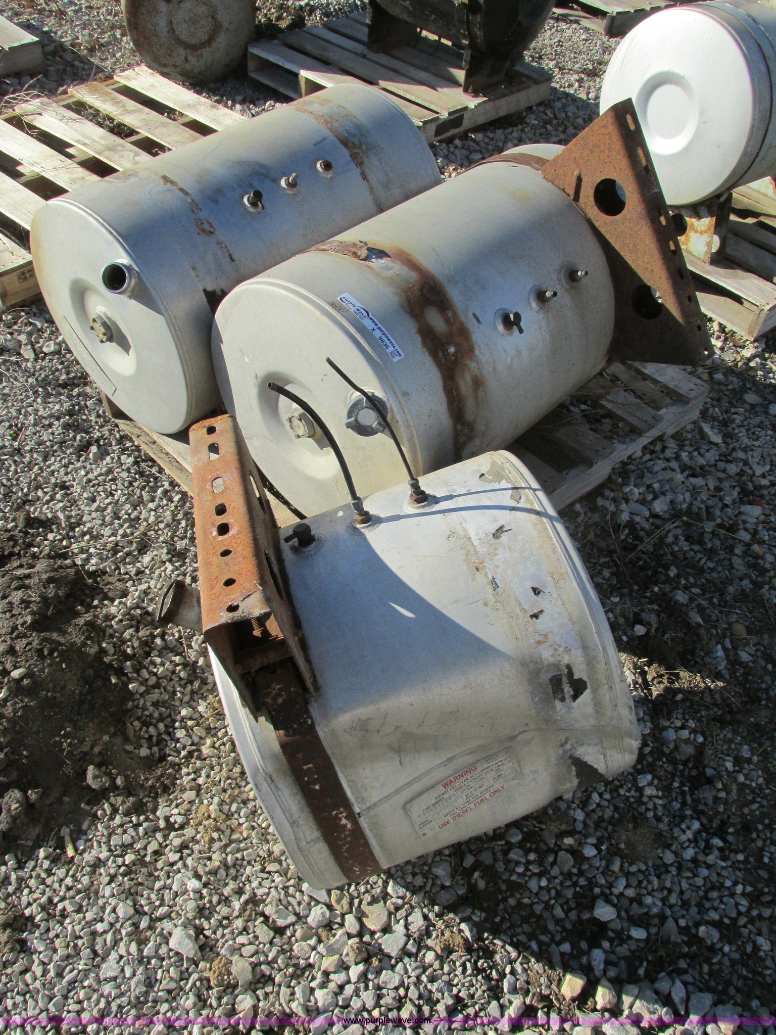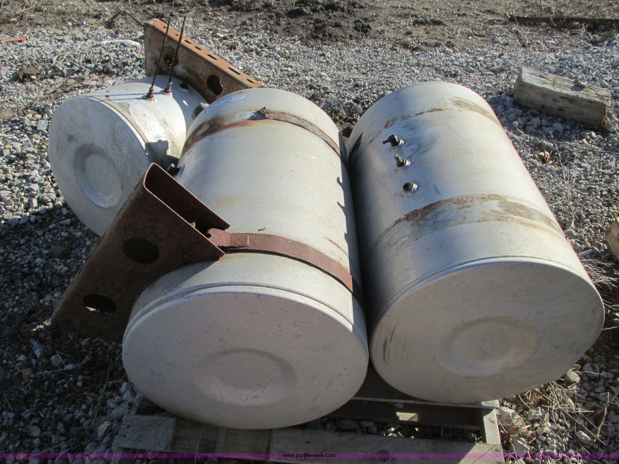Purple Wave is selling a used Automotive Parts or Acces. in Missouri. This item is a (3) aluminum fuel tanks with the following: (2) 50 gallon, Cosmetic damage, Dent on bottom side of one tank, 30 gallon, Cosmetic damage, Dent on side of tank