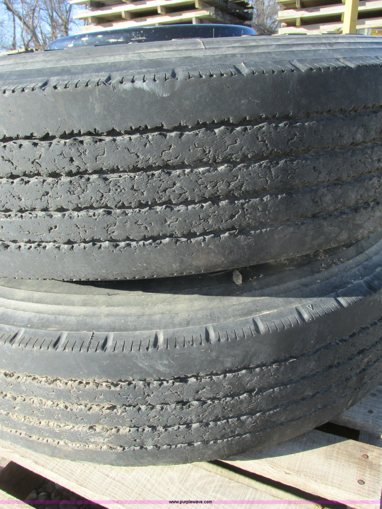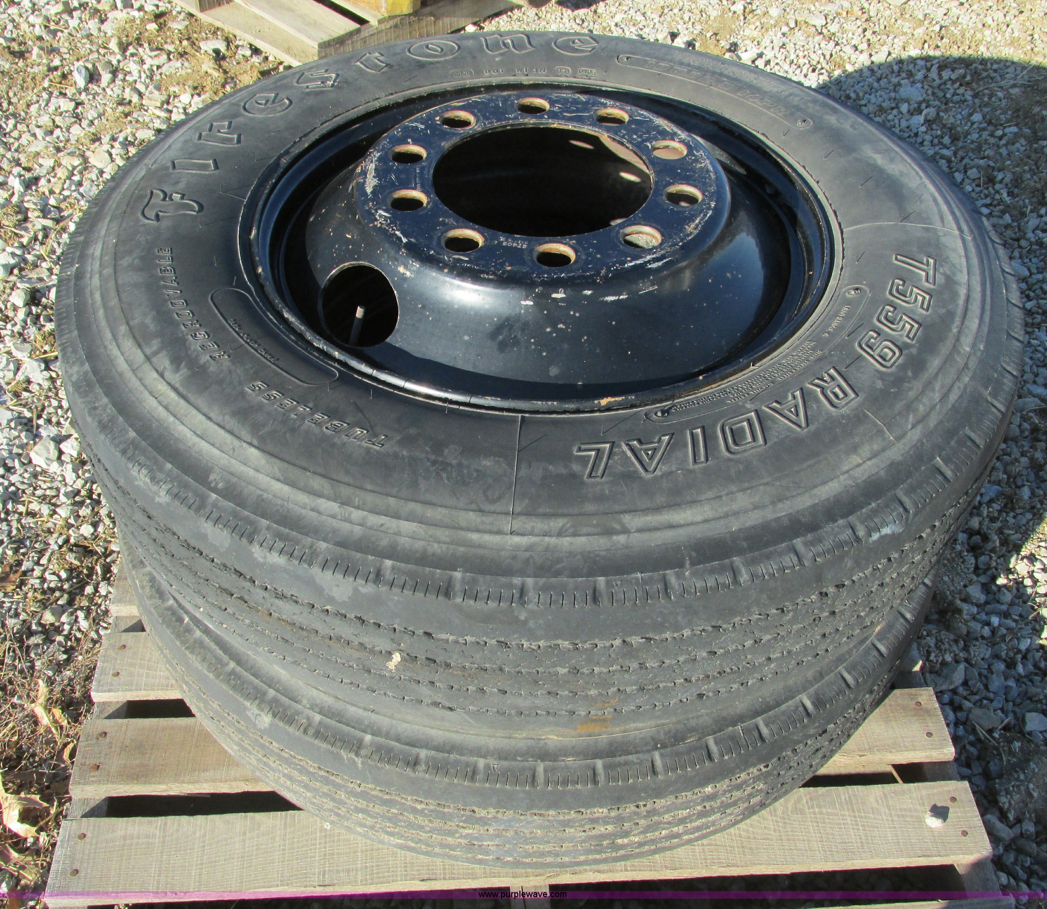 (2) 10R-22.5 tires and steel wheels. Firestone T559 Radial tires. Shipping quotes available. 19495 Bell Rd. Higginsville, MO 64037