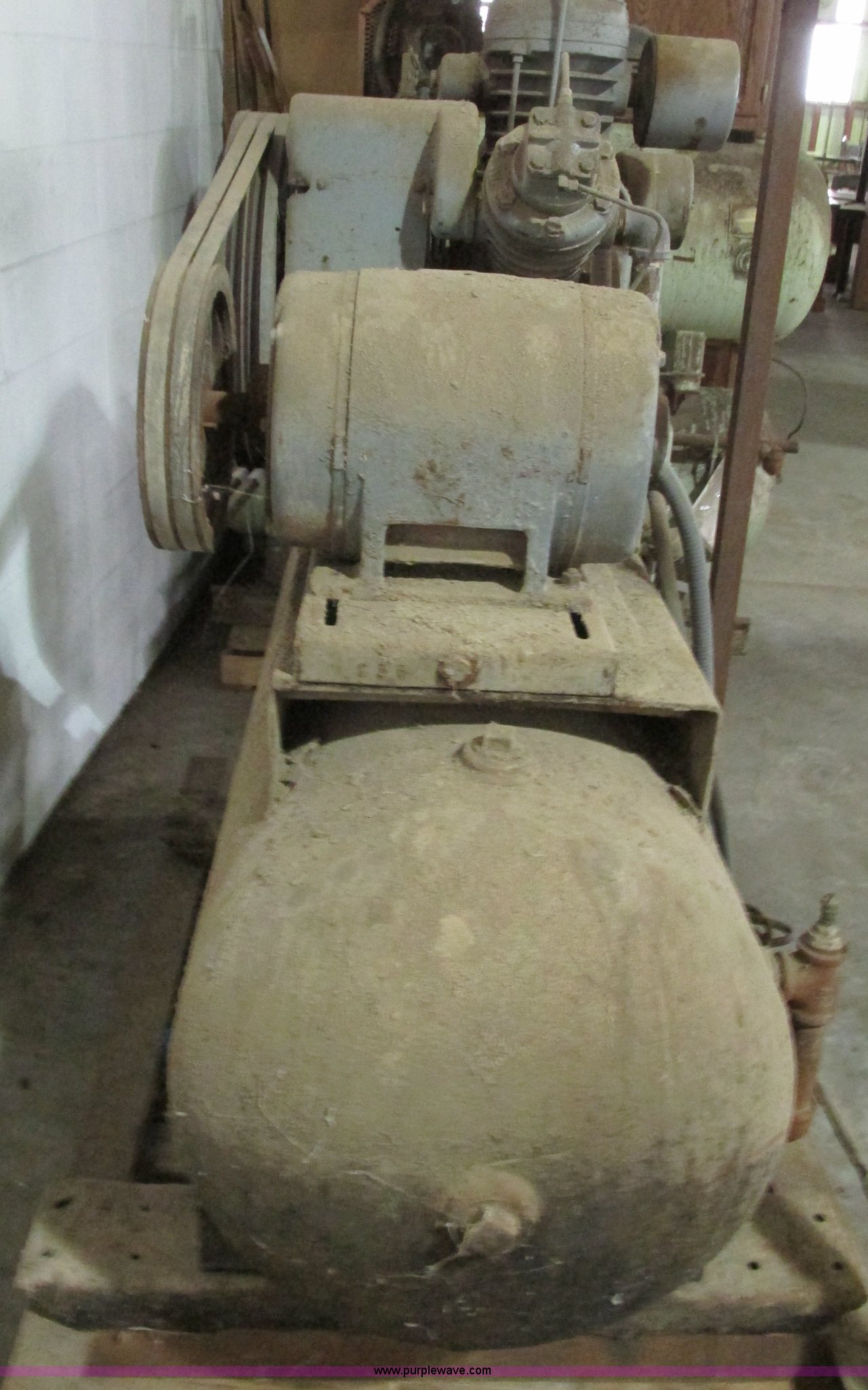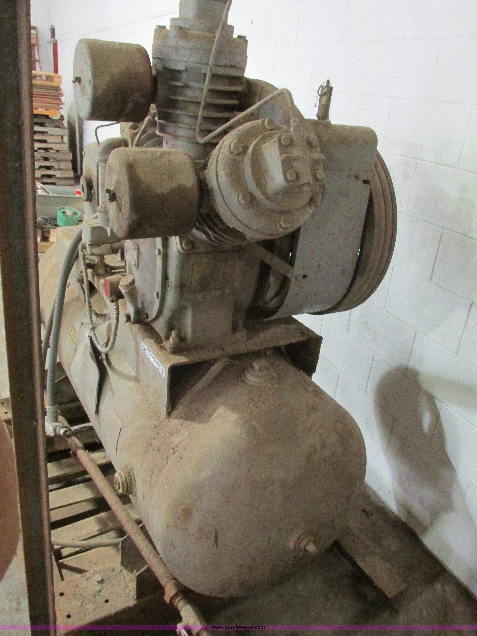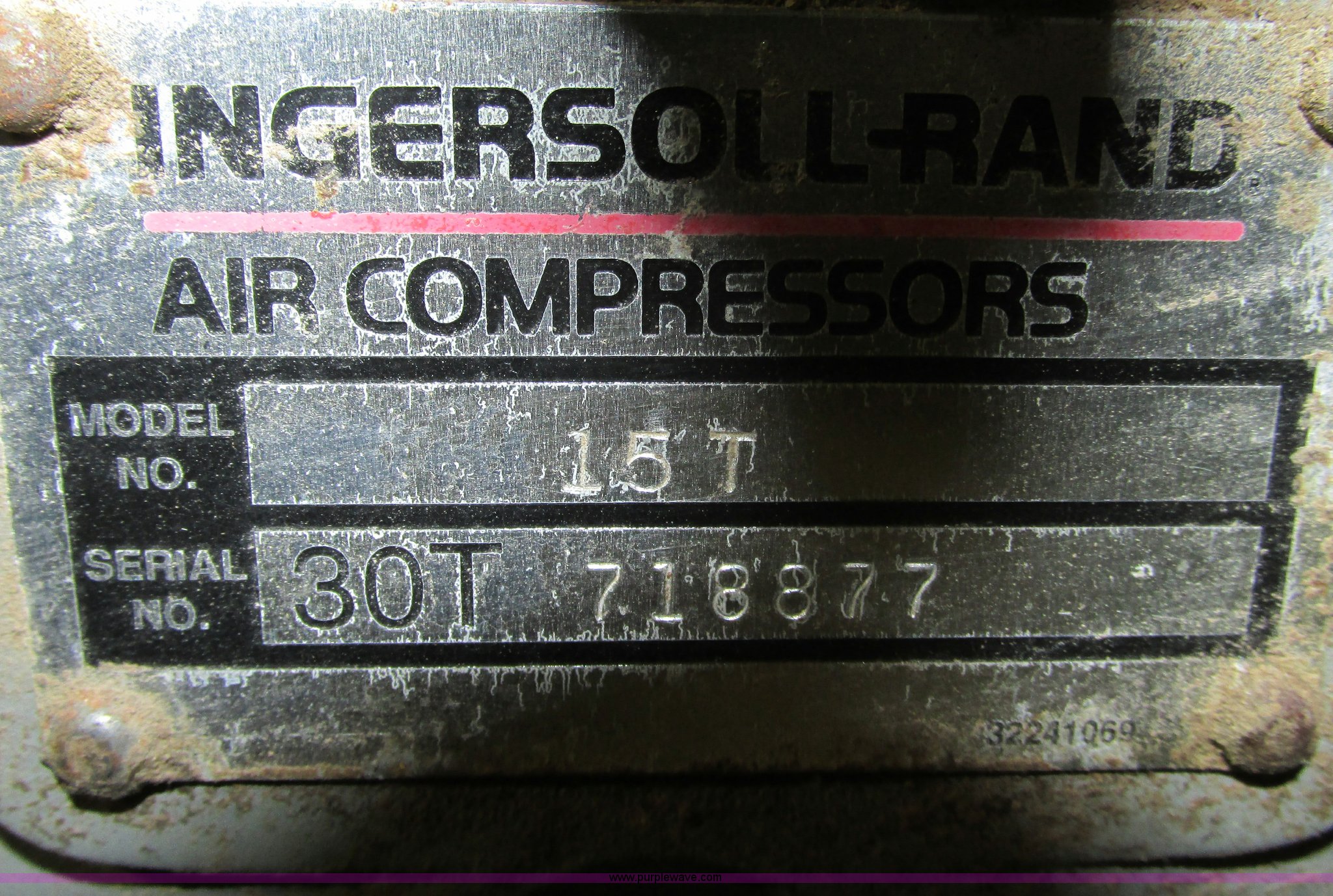 Purple Wave is selling a used Air Compressor in Missouri. This item is a Ingersoll Rand 15T three phase air compressor and tank with the following: Tank is approx. 5'L x 2" diameter, Serial 718877