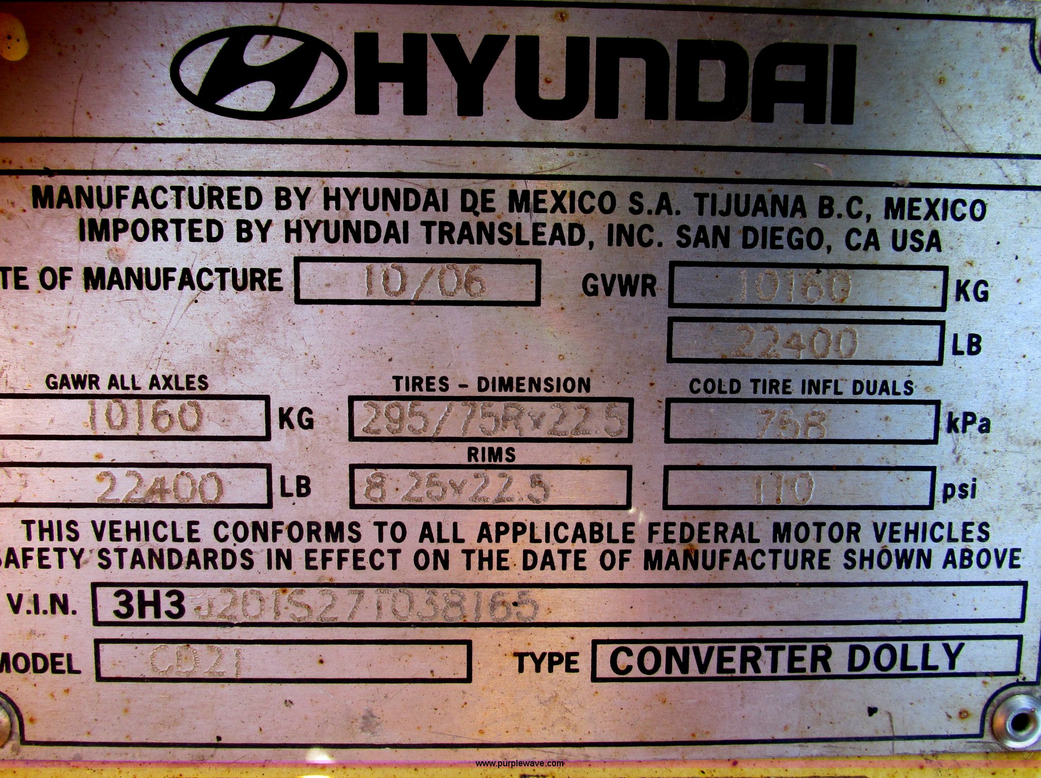 2007 Hyundia converter dolly. Model CD21, Pintle hitch, 295/75R22.5 tires, GVWR 22,400 lbs, Frame is damaged. 3H3J201527T038165. Shipping quotes available. 19495 Bell Rd. Higginsville, MO 64037