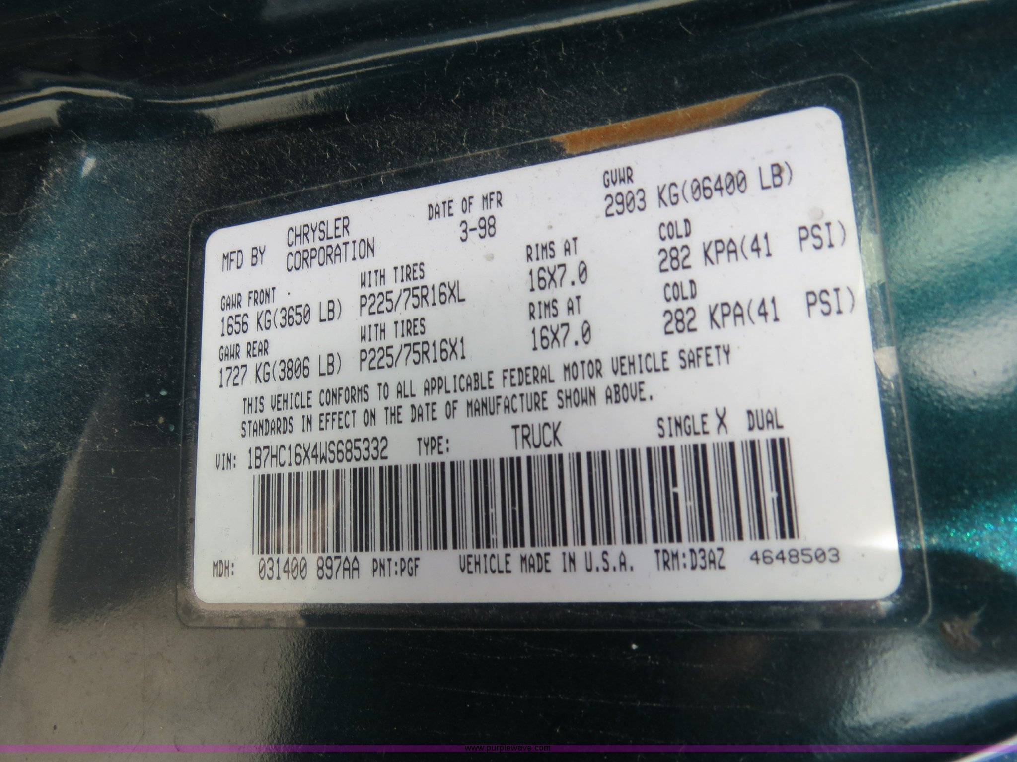 1998 Dodge Ram 1500 pickup truck. 198,939 miles on odometer, 3.9L V6 OHV 12V gas engine, Automatic transmission, AC and heat, Tilt, Cruise, AM/FM/cassette, Cloth interior, BetterBuilt cross bed aluminum toolbox, Receiver hitch, Trailer wiring, 225/75R16 tires, MoDOT ID B4497. 1B7HC16X4WS685332. Shipping quotes available. Missouri Department of Transportation (MODOT). 3901 E 32nd St. Joplin, MO 64804