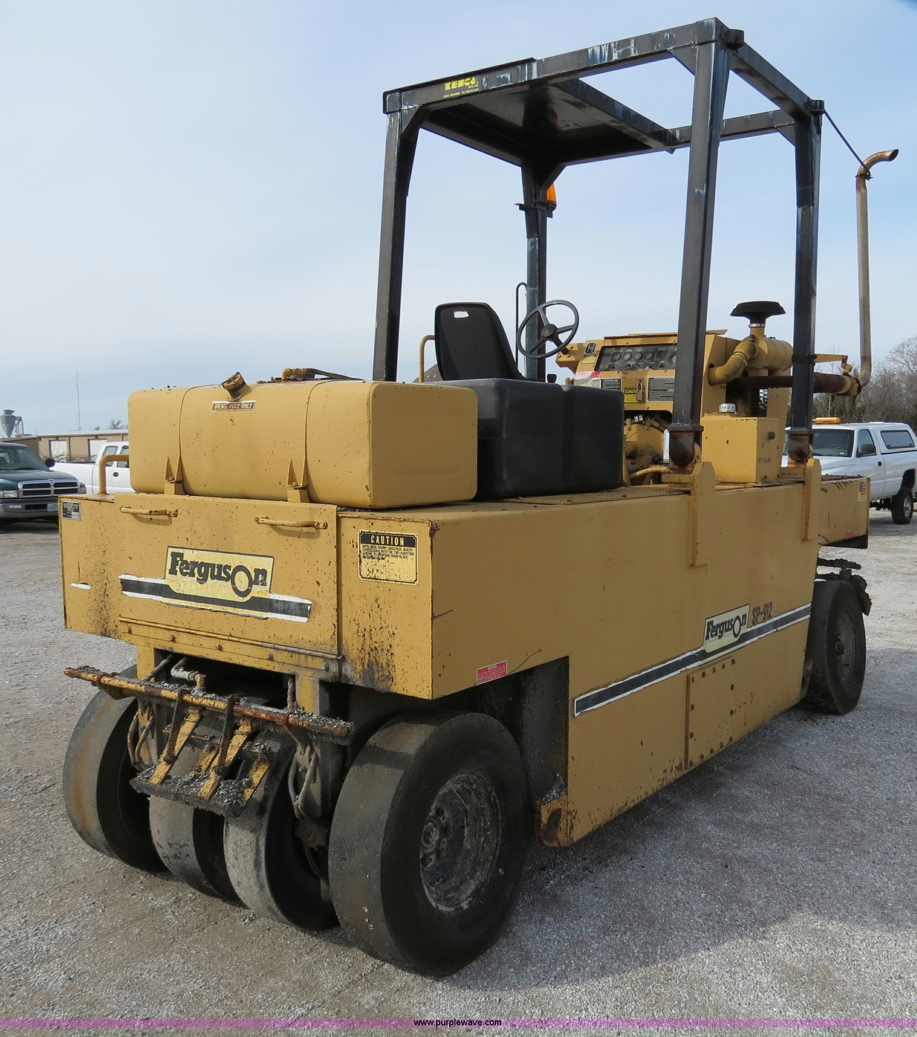Purple Wave is selling a used Pneumatic Roller in Missouri. This item is a 1996 Ferguson SP912 pneumatic roller with the following: 1,382 hours on meter, John Deere four cylinder diesel engine, Model 4039, Hydrostatic transmission, 67"W, Water tank, (9) wheels, 7.50-15NHS tires, Serial 1434