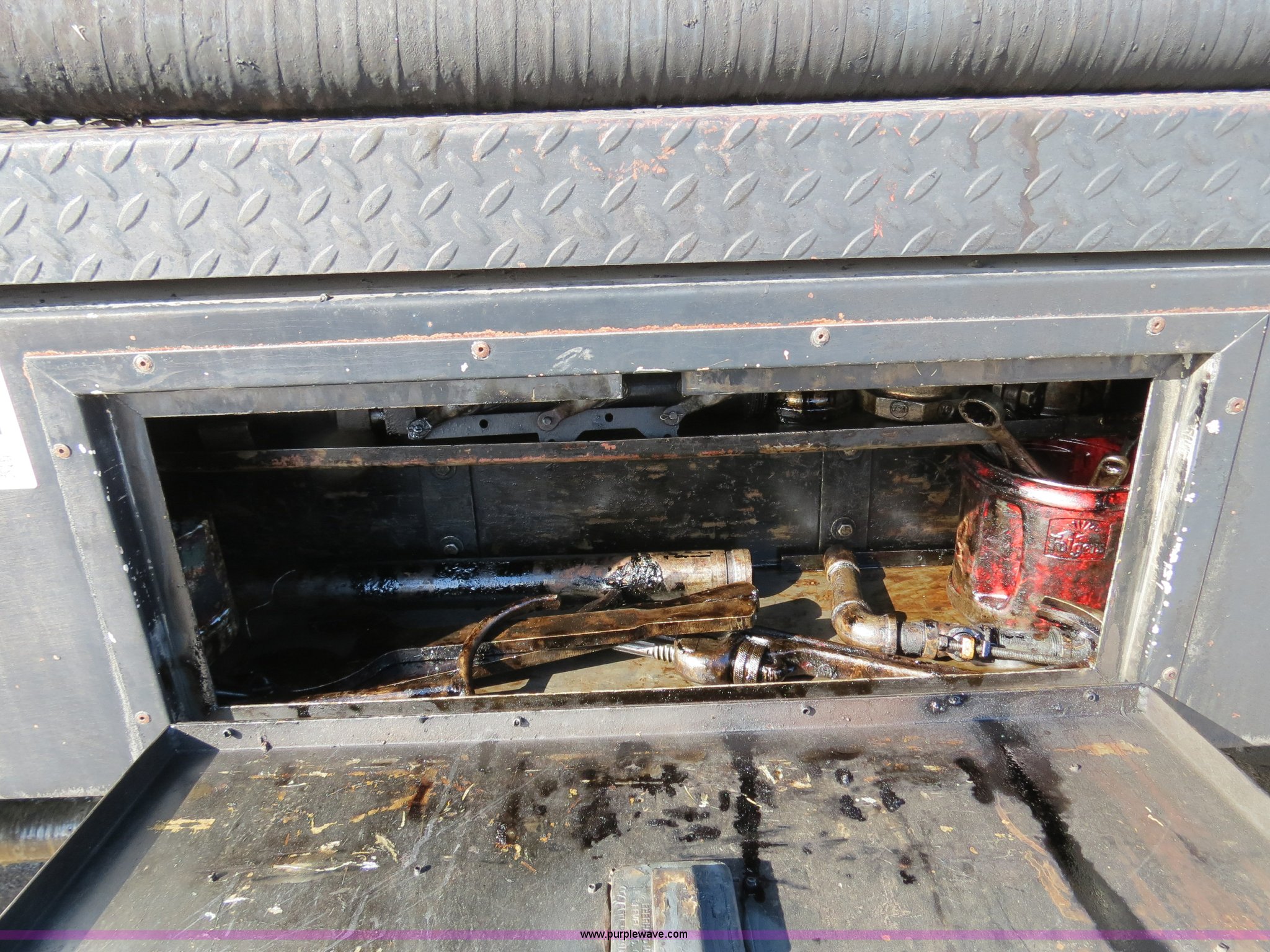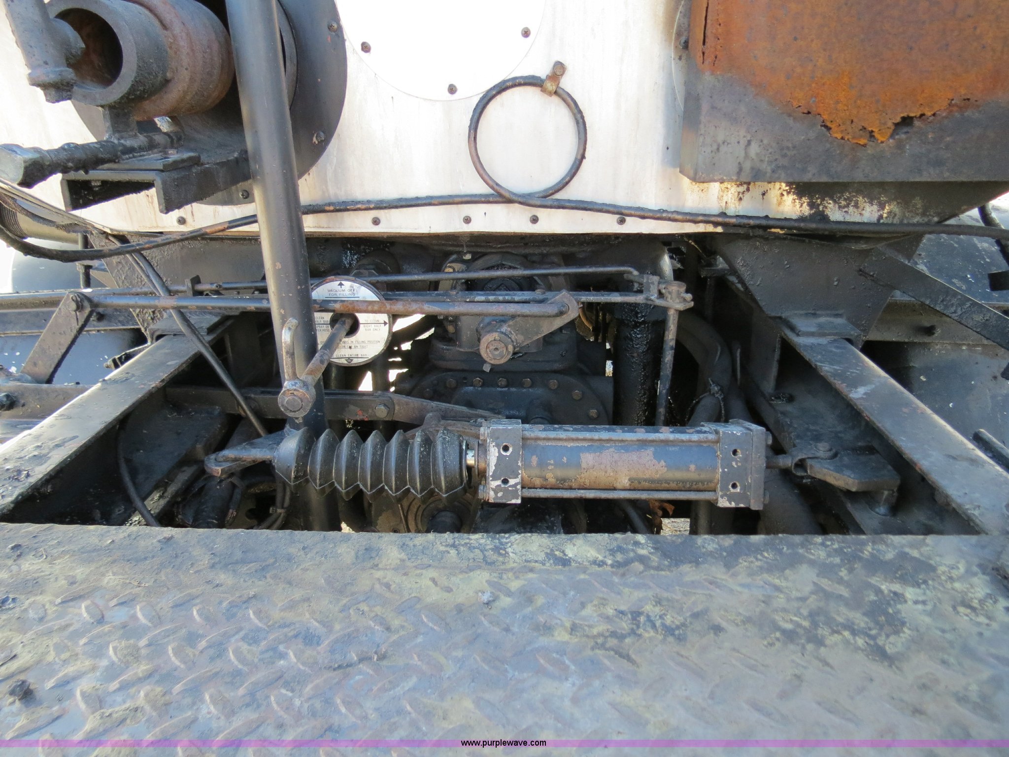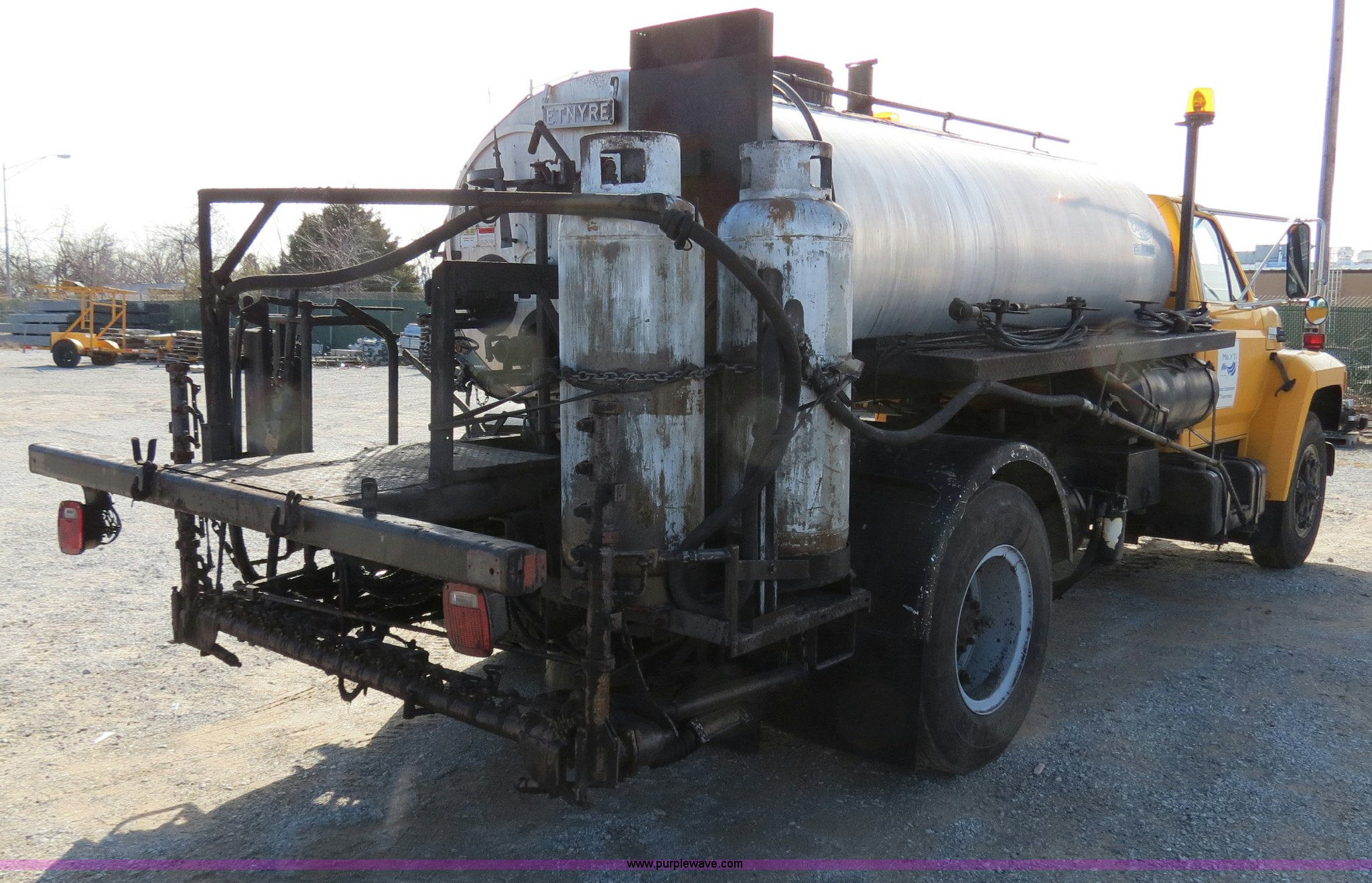 Purple Wave is selling a used Oil Distributor Truck in Missouri. This item is a 1991 Ford F800 oil distributor truck with the following: 80,880 miles on odometer, 7,820 hours on meter, Ford 7.8L L6 turbo diesel engine, Model 190, 190 HP, Six speed manual transmission, Heat, AM/FM, Air suspension seat, Etnyre BX-HL Black-Topper bed, 1,090 gallon capacity, 14' oil spreader, 8'W base, 3' hydraulic wings, 4" nozzle spacing, Etnyre cab mounted controls, Serial C1079, 50 gallon fuel tank, Single rear exhaust stack, PTO, Spring suspension, Air brakes, 171" wheelbase, 9.00R20 tires, GVWR 27,080 lbs, CB radio will be removed, MoDOT ID G7673