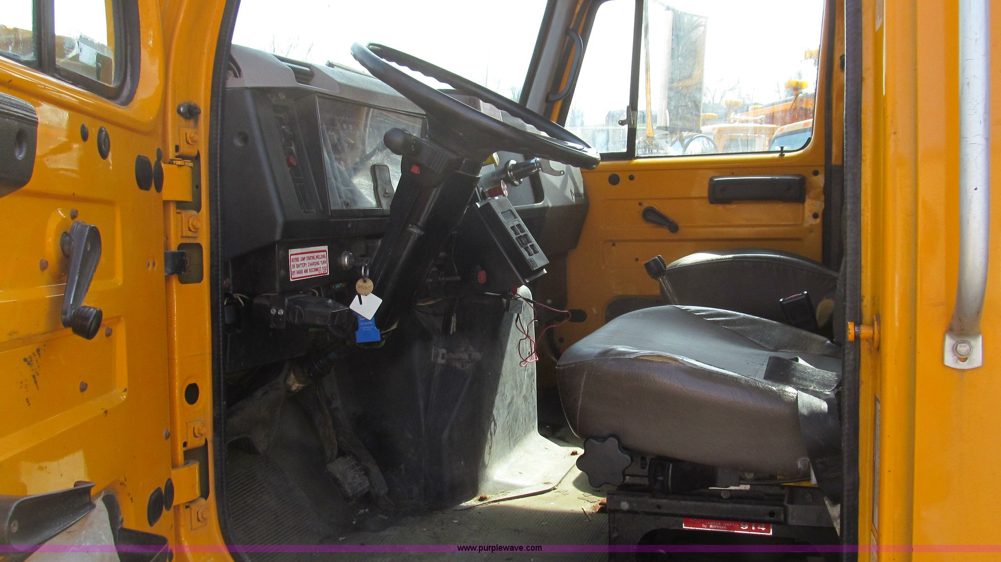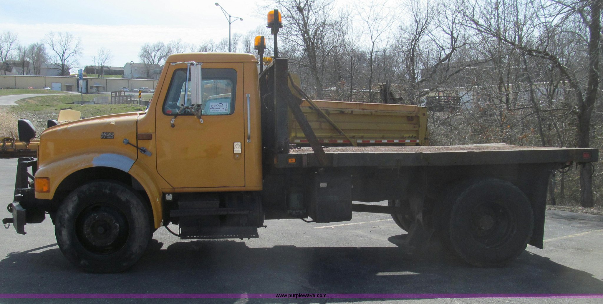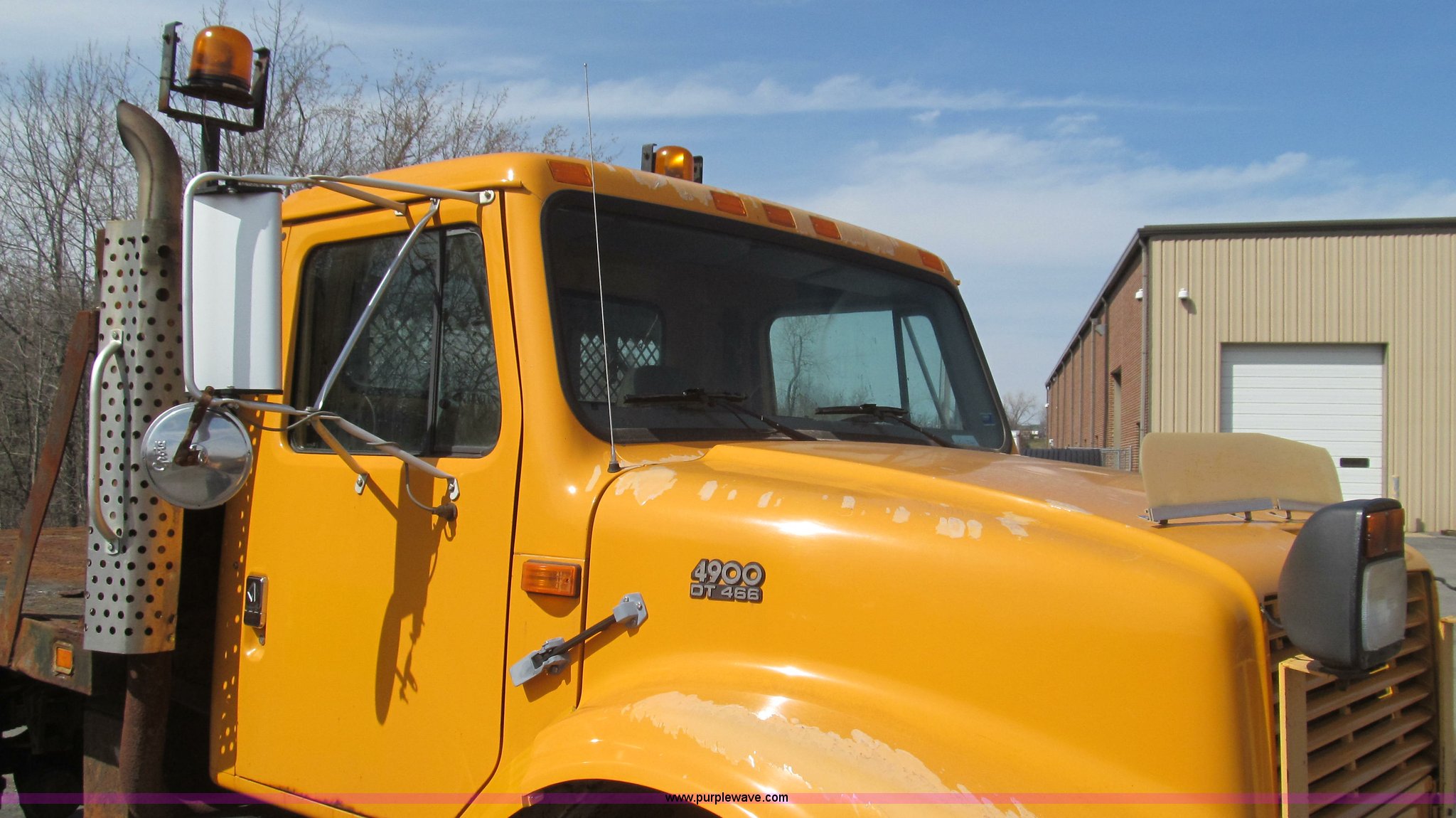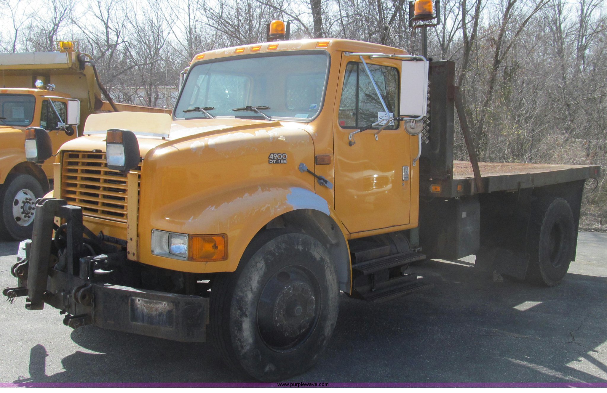 Purple Wave is selling a used Construction Dump Truck in Missouri. This item is a 1997 International 4900 dump truck with the following: 107,012 miles on odometer, 4,903 hours on meter, International DT466 7.6L L6 diesel engine, Allison five speed automatic transmission, Heat, AM/FM, Air suspension seat, Trailer brake controller, 12'L flatbed, Single ram hoist, Headache rack, Equipped for snow plow, Plow lights, Dual beacon lights, 50 gallon fuel tank, Trailer wiring, Pintle hitch, PTO, Spring suspension, Air brakes, 170" wheelbase, 11R22.5 tires, Windshield chipped, Clear coat peeling, Bad steering drag link, Driver's seat worn, Unit# 5674