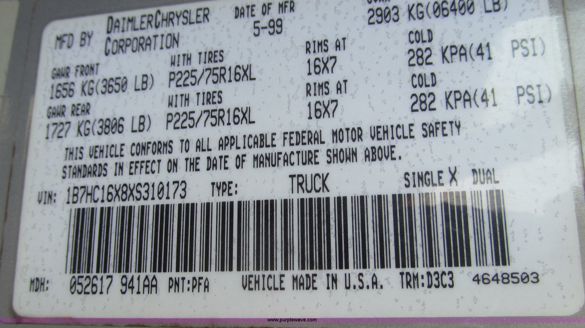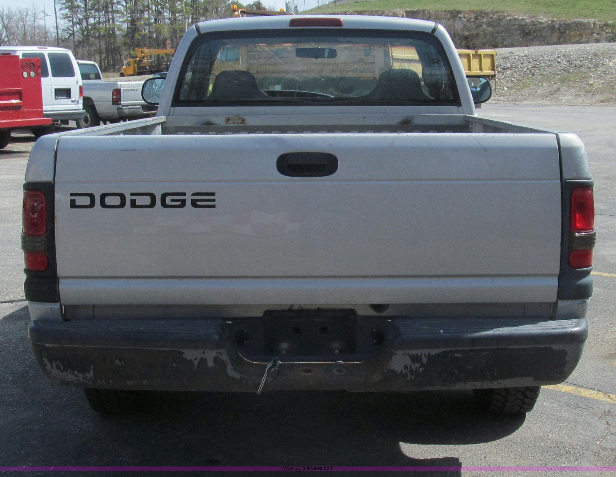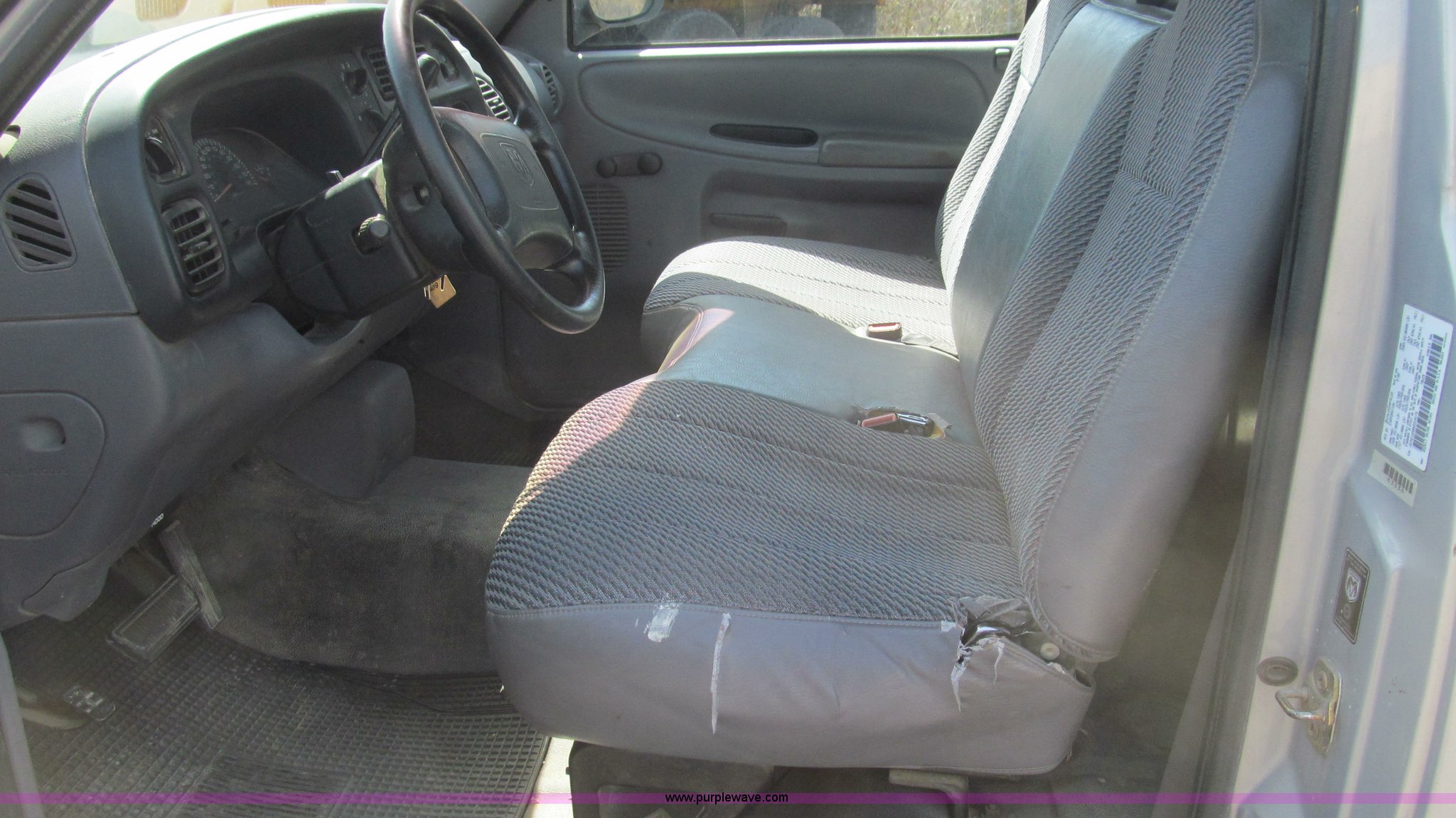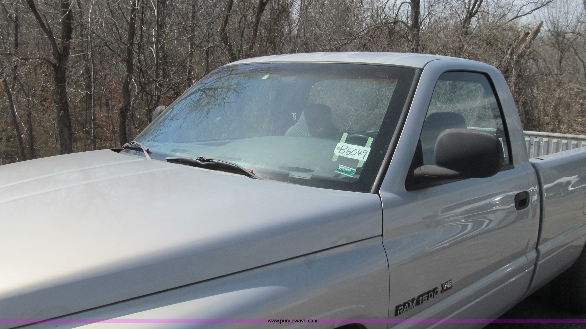 Purple Wave is selling a used Passenger Vehicle in Missouri. This item is a 1999 Dodge Ram 1500 pickup truck with the following: 118,052 miles on odometer, 3.9L V6 OHV 12V gas engine, Automatic transmission, AC and heat, AM/FM/cassette, Manual windows and locks, Cloth interior, Bed mat, Dual air bags, Long bed, Trailer wiring, P235/75R16 tires, Exterior cosmetic damage, Damage to passenger cab corner, Headliner bad, Driver's seat worn, Unit# B6049