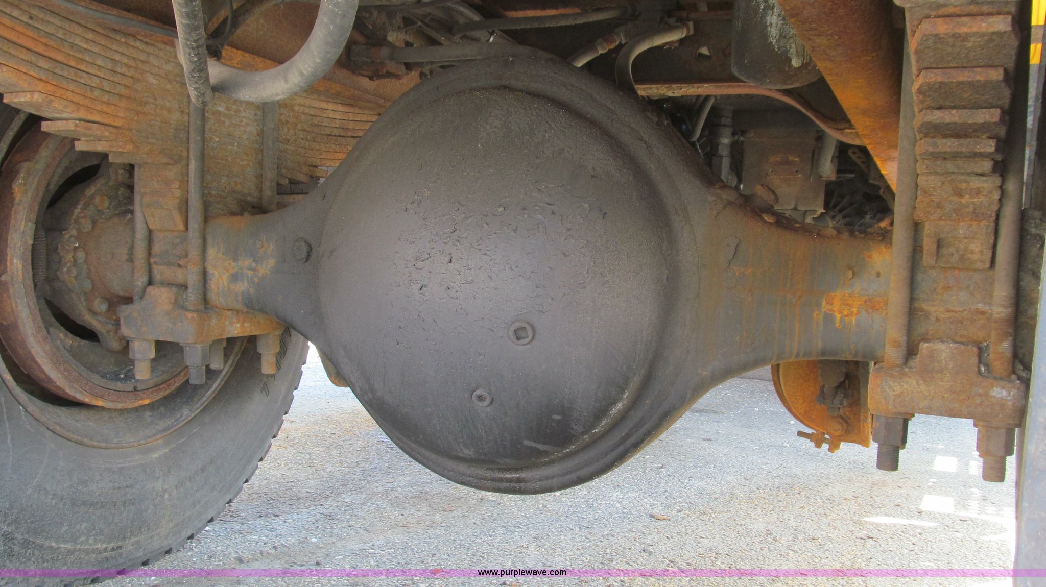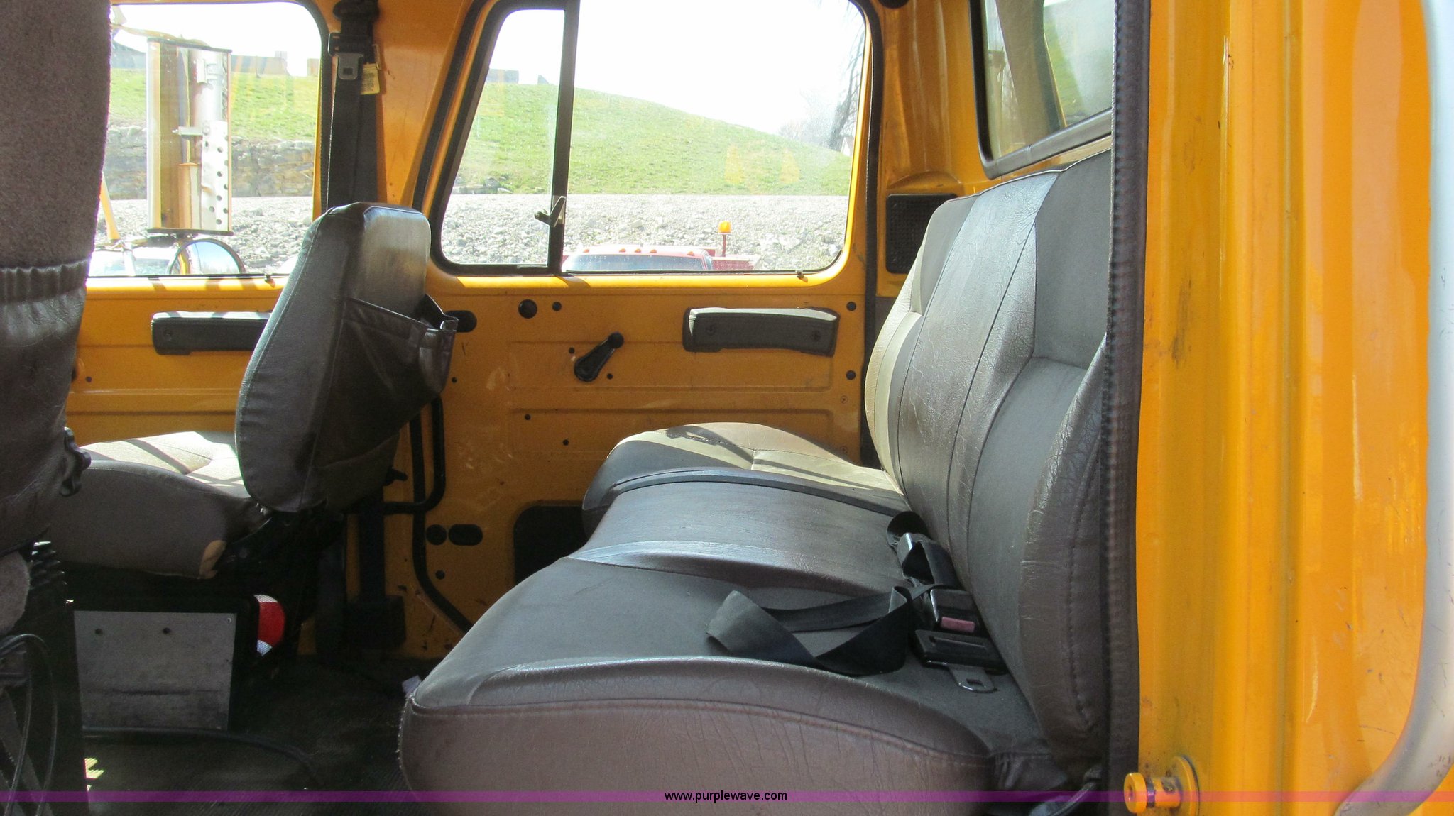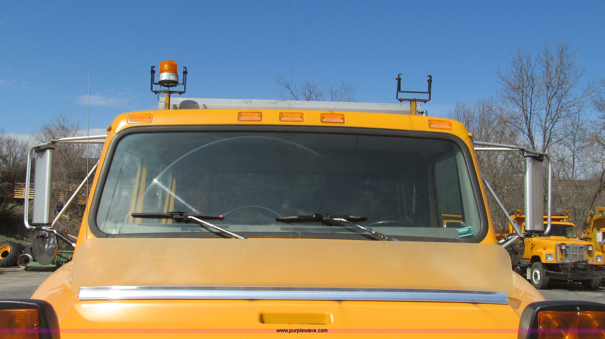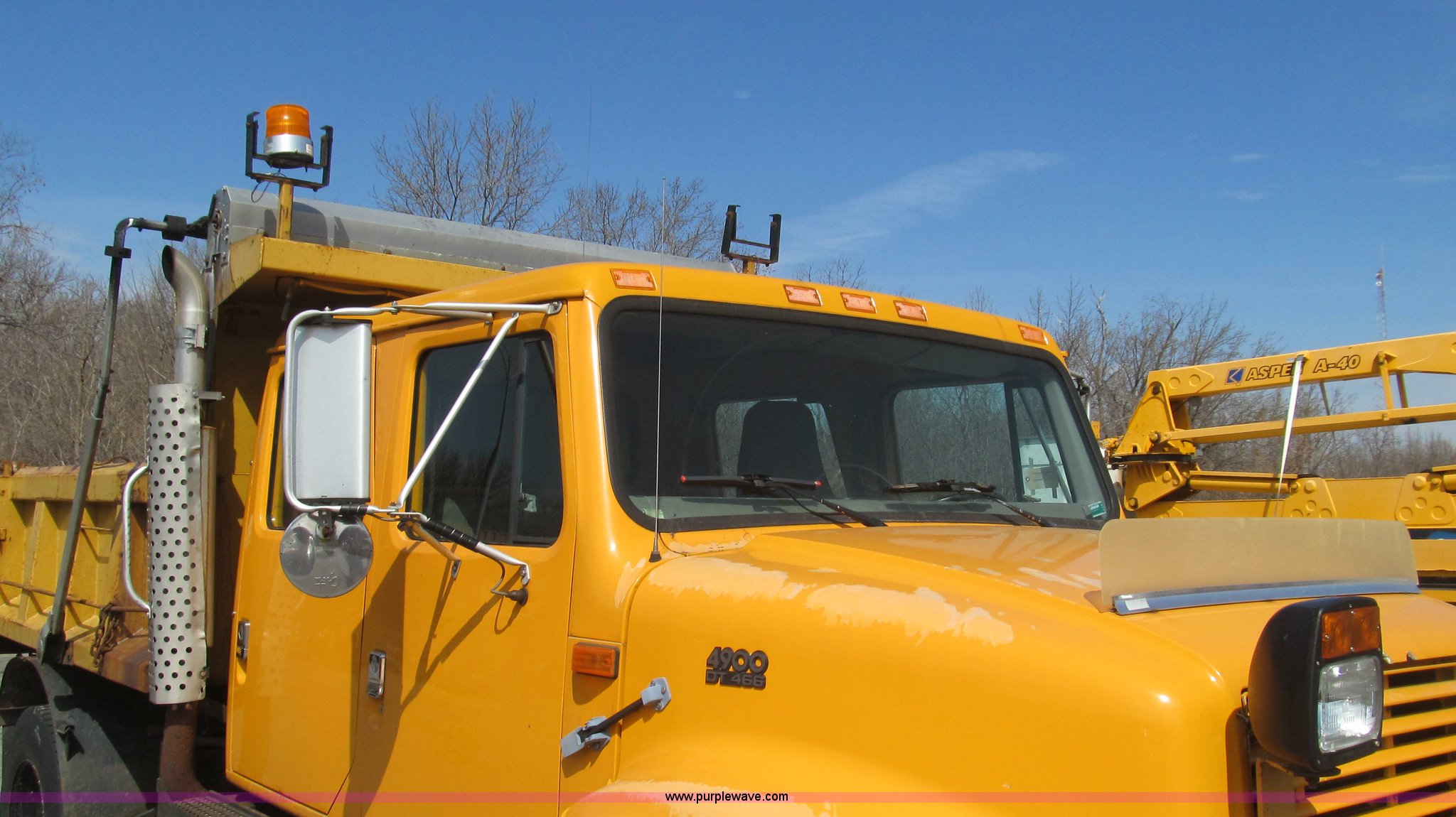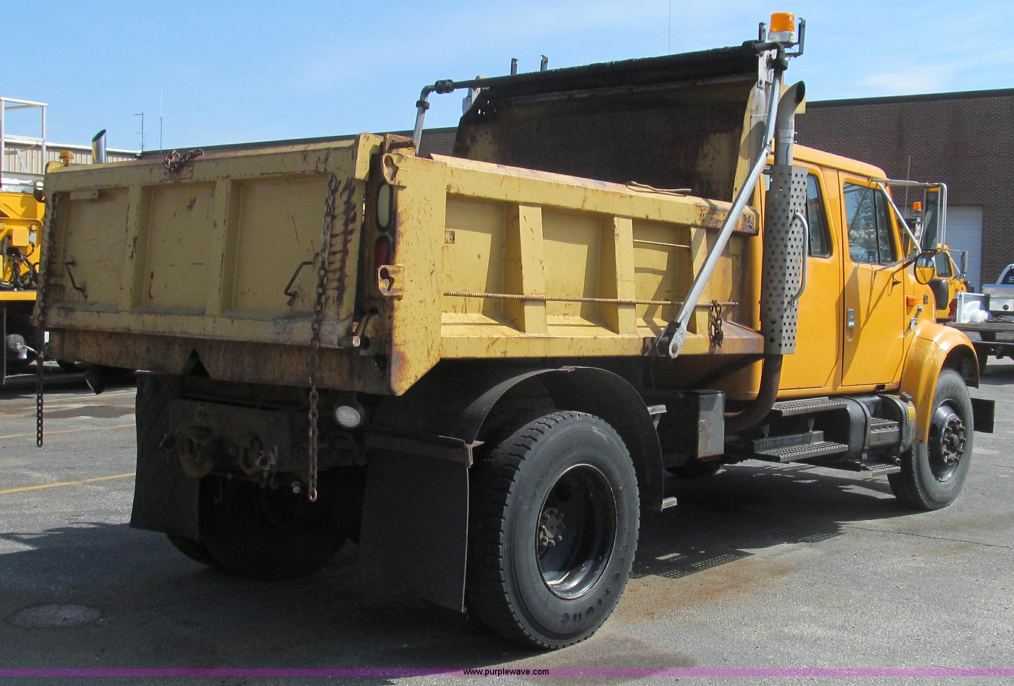 Purple Wave is selling a used Construction Dump Truck in Missouri. This item is a 1997 International 4900 CrewCab dump truck with the following: 160,540 miles on odometer, 9,433 hours on meter, International DT466 7.6L L6 diesel engine, Allison six speed automatic transmission, Heat, AM/FM, Heated mirrors, Bug deflector, Fink 9'L cinder bed, Electric rollover tarp, Beacon light, Equipped for snow plow, In-cab plow controls, Front mounted plow lights, 55 gallon fuel tank, Pintle hitch, Trailer wiring, PTO, Air brakes, 176" wheelbase, 11R22.5 tires, Exterior cosmetic damage, Unit# 5635