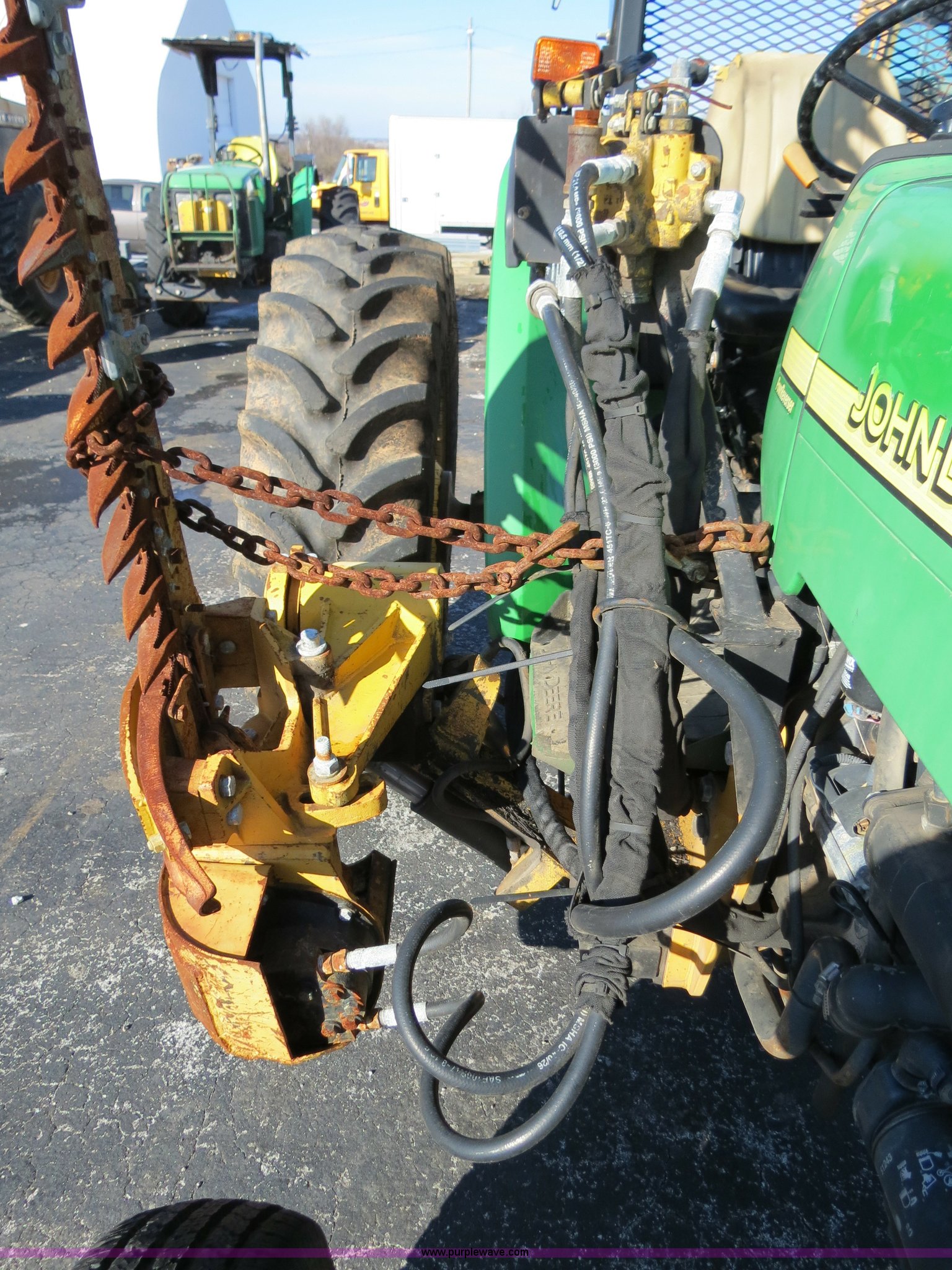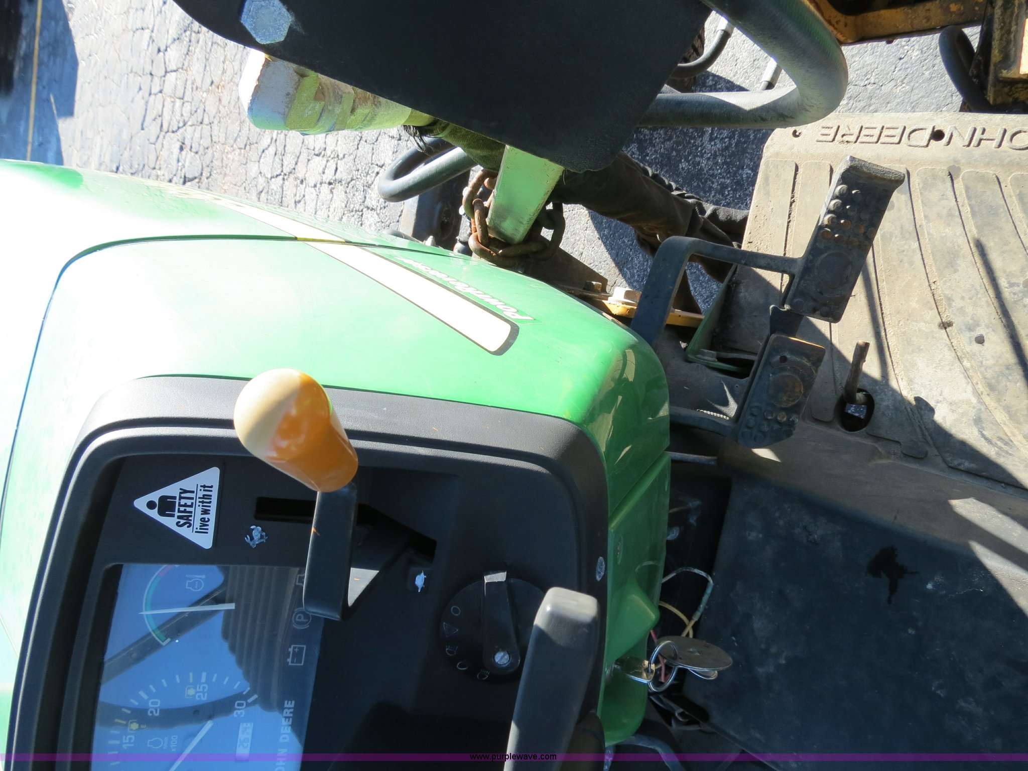 Purple Wave is selling a used Tractor in Missouri. This item is a 2002 John Deere 5320 tractor with the following: 2,610 hours on meter, John Deere Powertech 2.9L three cylinder diesel engine, Manual transmission, 12F-12R gears, Canopy, (8) front suitcase weights, 235/85R16 front tires, 380/85R28 rear tires, 6' sickle mower, Serial LV5320P236034, MoDOT ID 05839