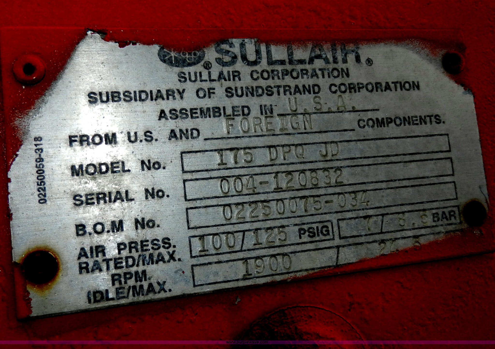 1996 Sullair 175 DPQ air compressor has sold in Topeka, Kansas for $4620. Item A3922 sold on March 21st, 2013.