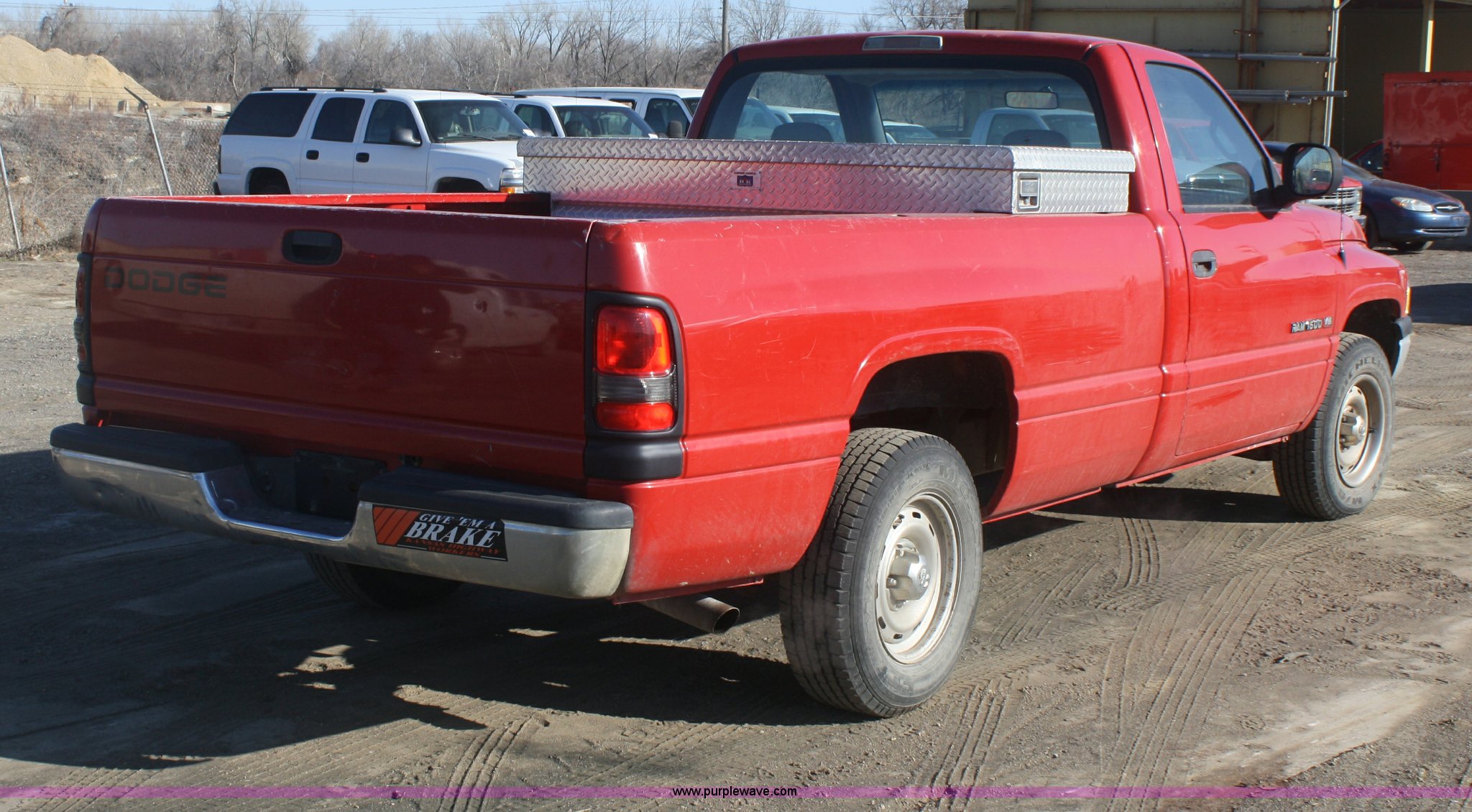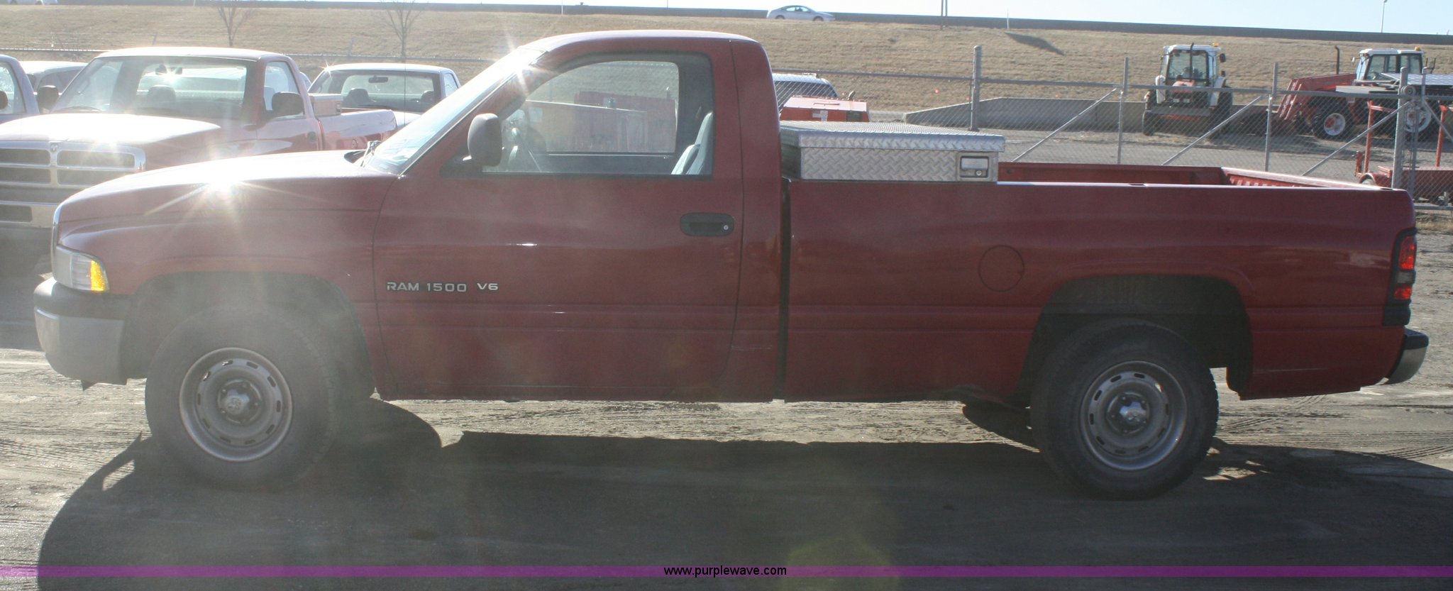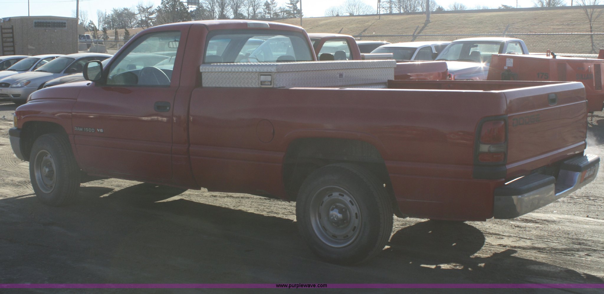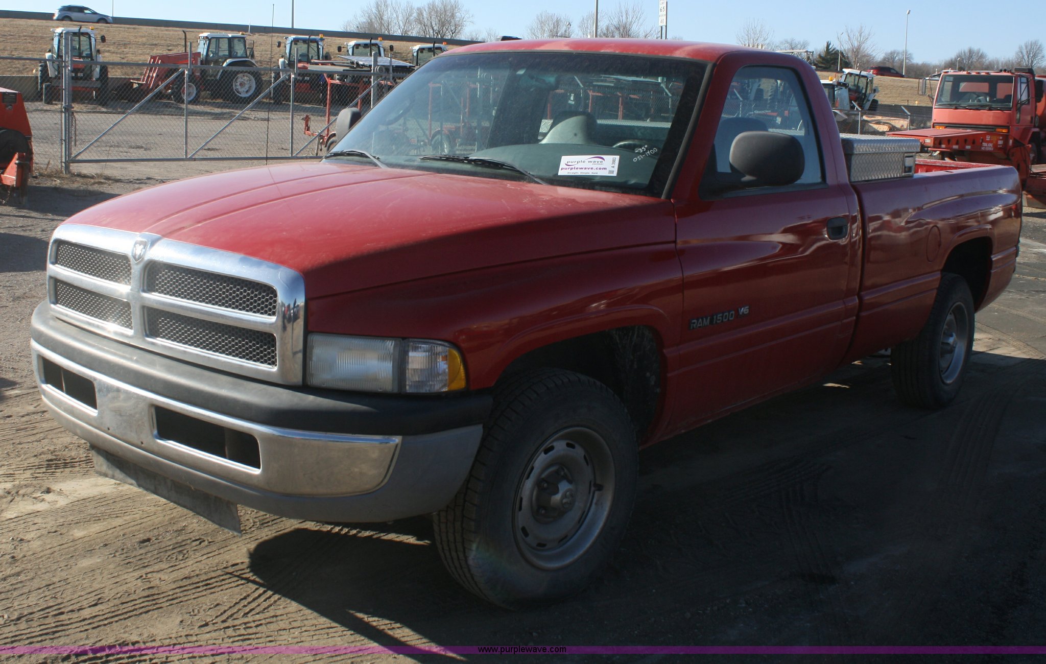 Purple Wave is selling a used Passenger Vehicle in Kansas. This item is a 1999 Dodge Ram 1500 pickup truck with the following: 203,910 miles on odometer, 3.9L V6 gas engine, Automatic transmission, AC and heat, Tilt, Cruise, AM/FM, Manual windows and locks, Vinyl interior, Toolbox, 225/75R16 tires, Dead battery, Paint faded and scratched, KDOT ID 051-1400
