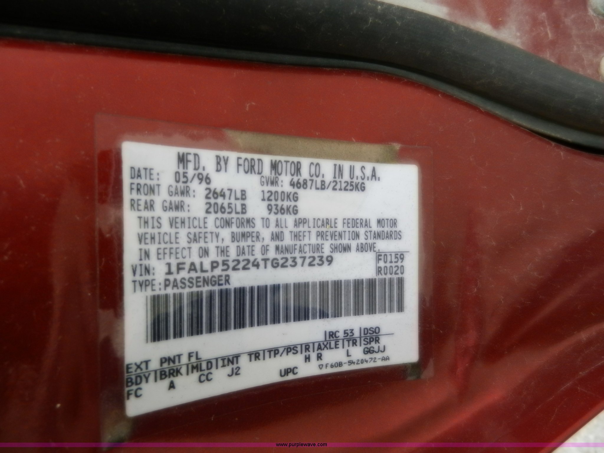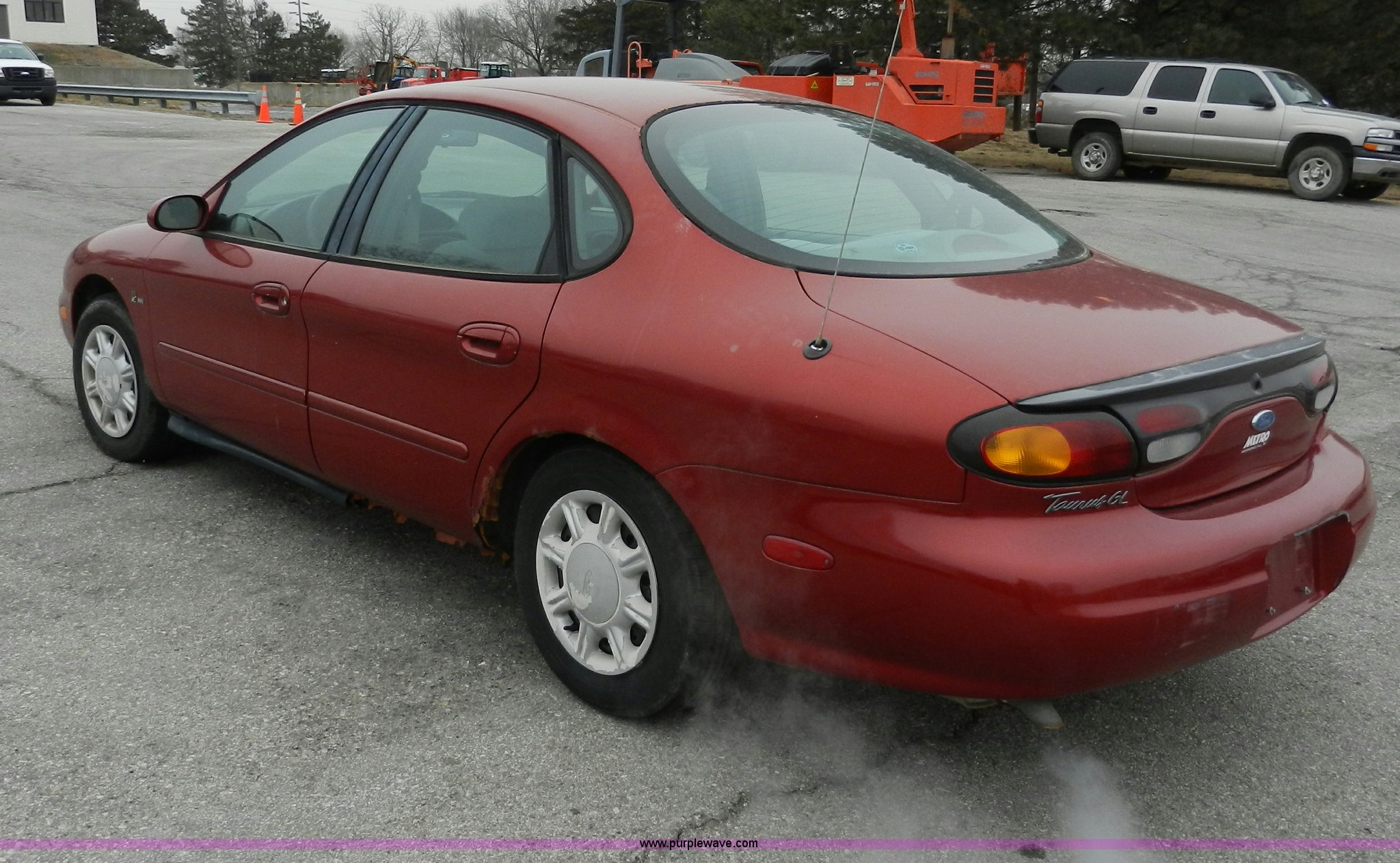 1996 Ford Taurus GL. 115,127 miles on odometer, 3.0L V6 OHV 12V FFV gas engine, Automatic transmission, AC and heat, Tilt, Cruise, AM/FM, Power windows, locks, and mirrors, Cloth interior, 205/65R15 tires, Dead battery, Rust, Paint faded and scratched, KDOT ID 003-1026. 1FALP5224TG237239. View equipment video. Shipping quotes available. KDOT Topeka. 121 SW 21st Street. Topeka, KS 66604