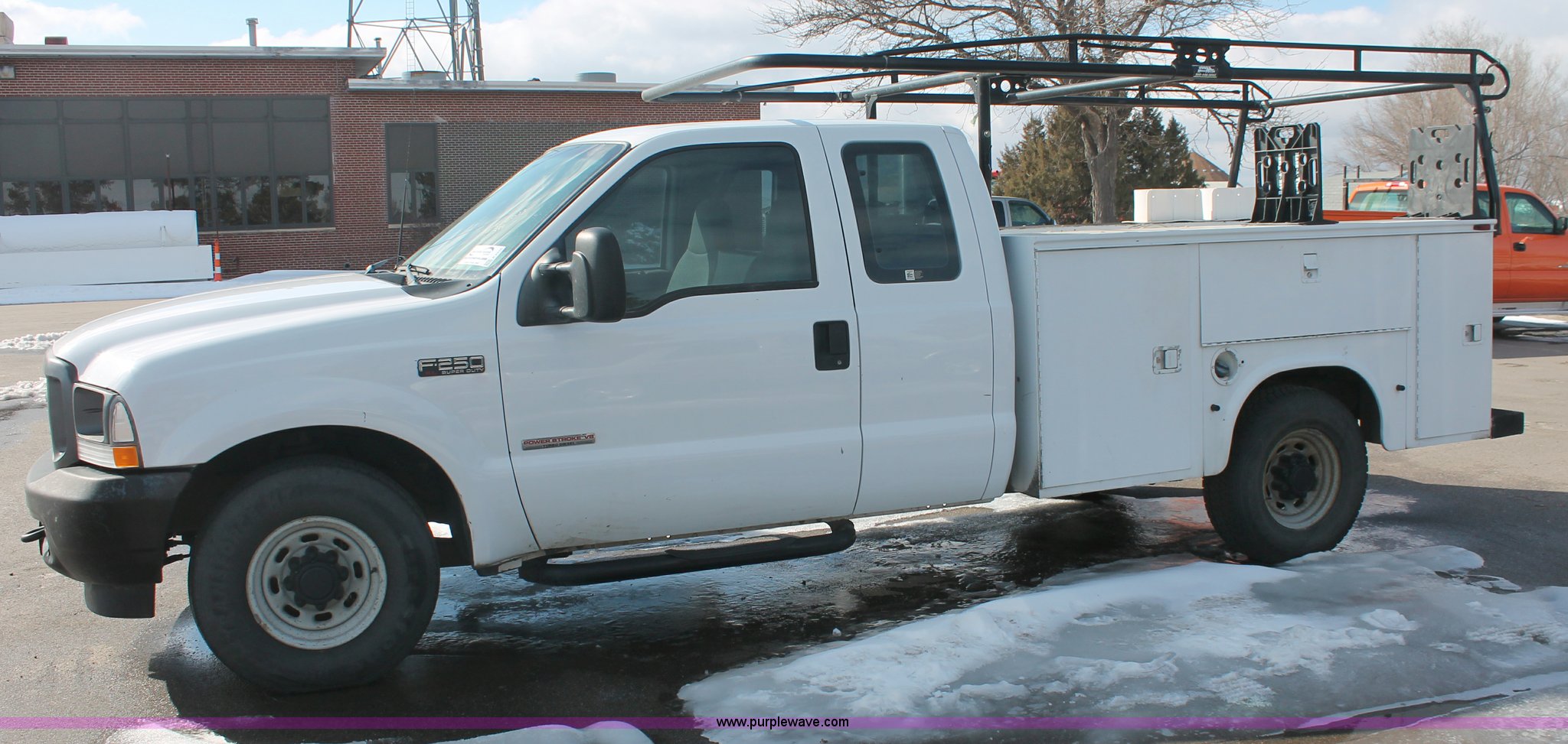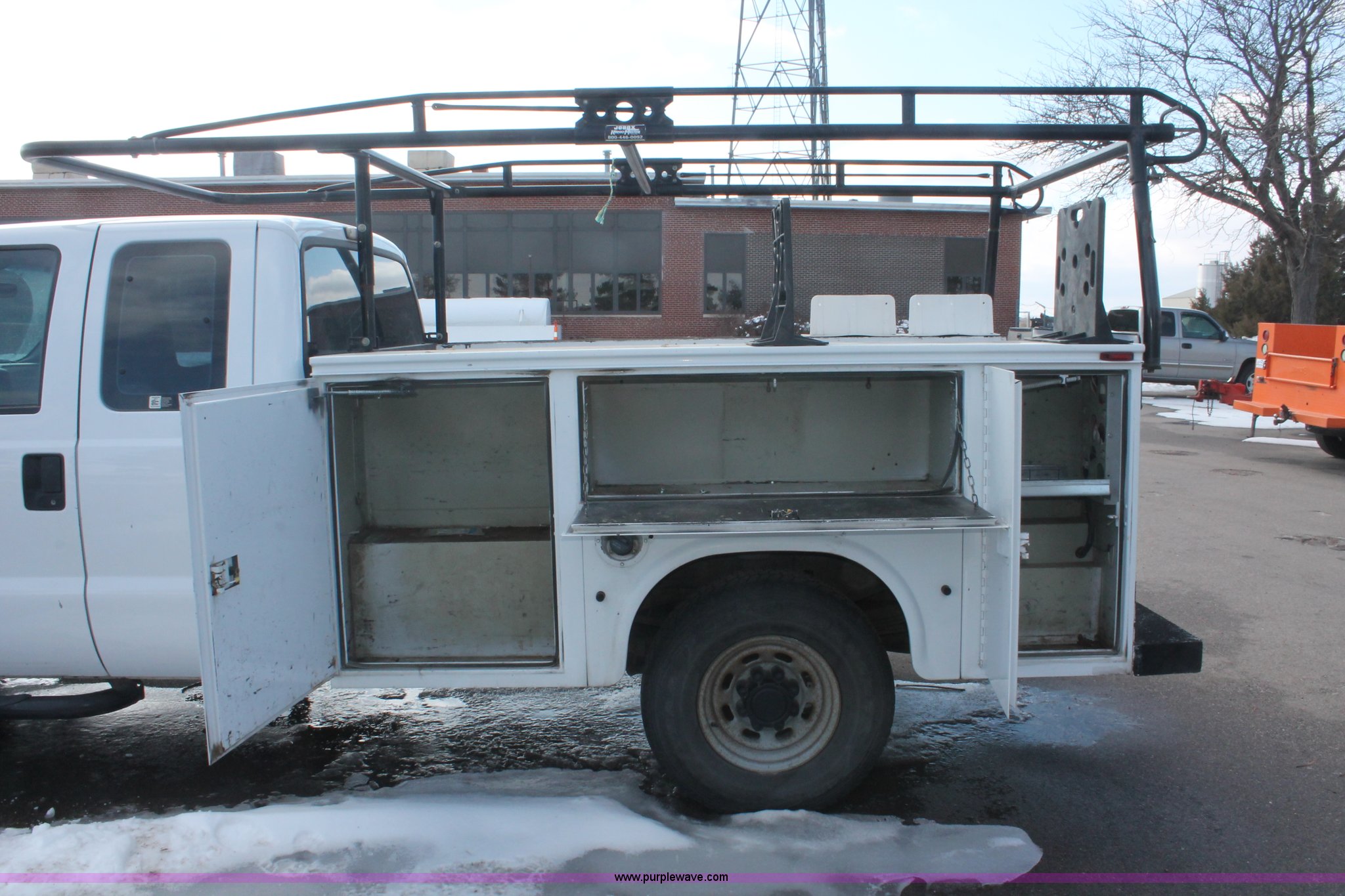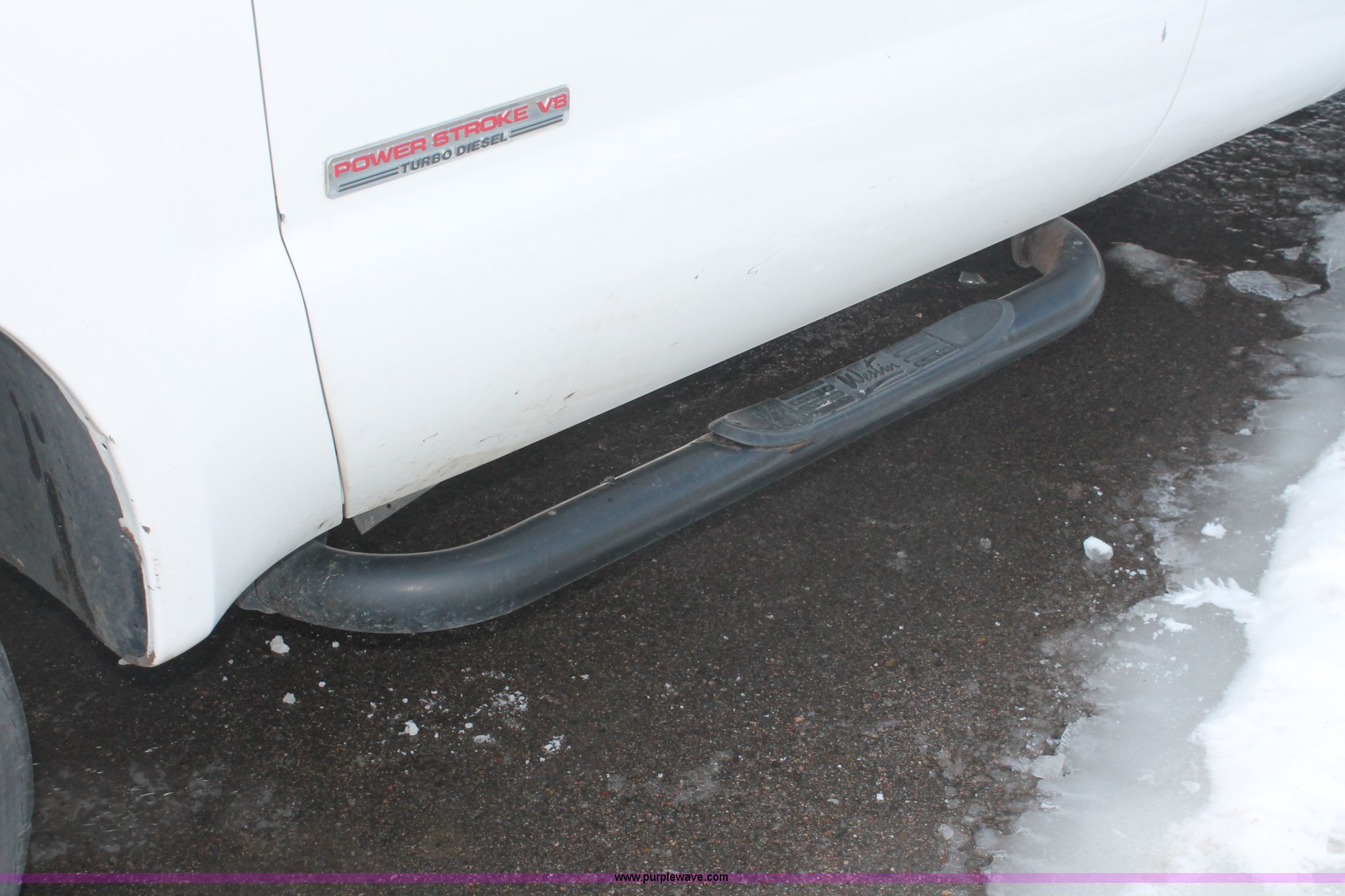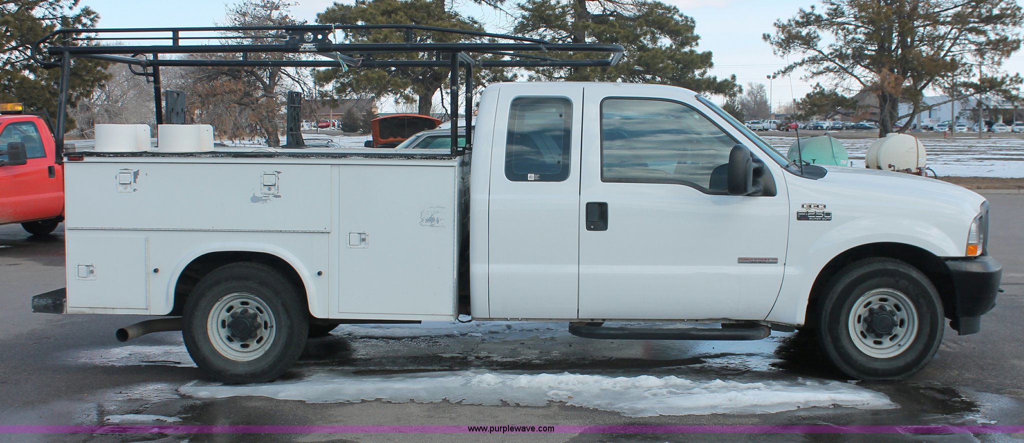 Purple Wave is selling a used Passenger Vehicle in Kansas. This item is a 2003 Ford F250 XL SuperCab pickup truck with the following: 171,701 miles on odometer, 6.0L V8 OHV 32V turbo diesel engine, Automatic transmission, AC and heat, Tilt, Cruise, AM/FM, Manual windows and locks, Cloth and vinyl interior, Knapheide 8'L utility bed, (6) compartments, Ladder racks, Westin nerf bars, Receiver hitch, Trailer wiring, 235/85R16 tires, Needs injectors, Misses badly, Vehicle must be towed, KDOT ID 163-6013