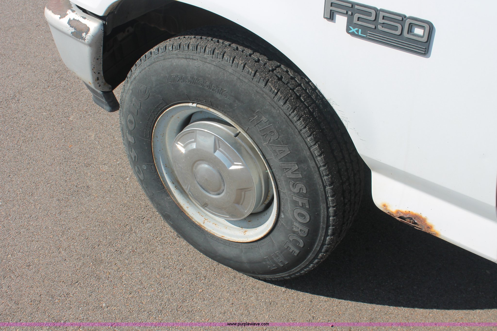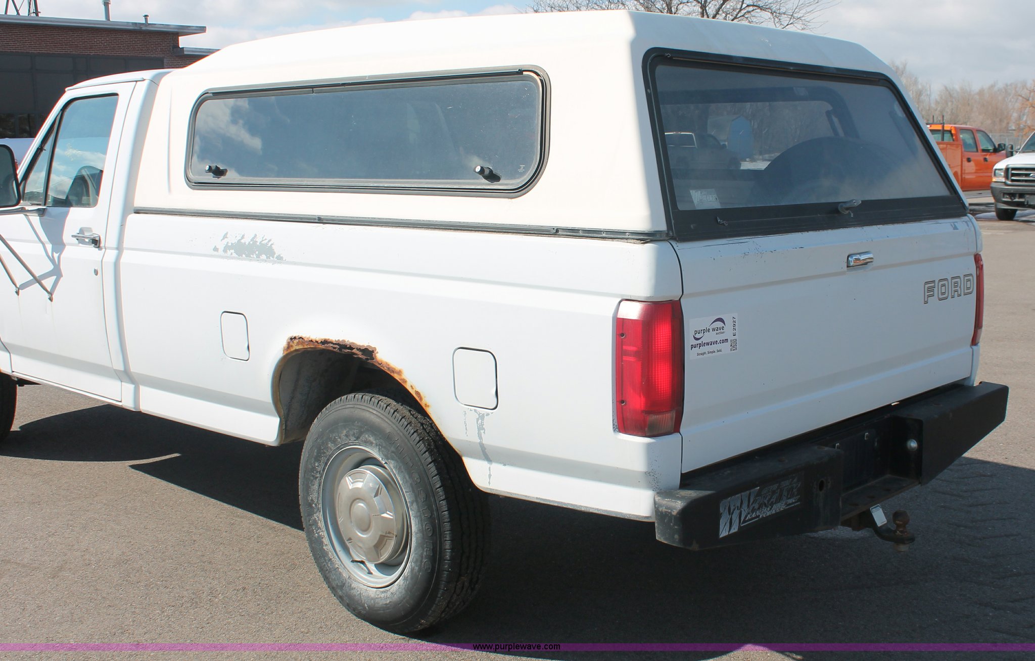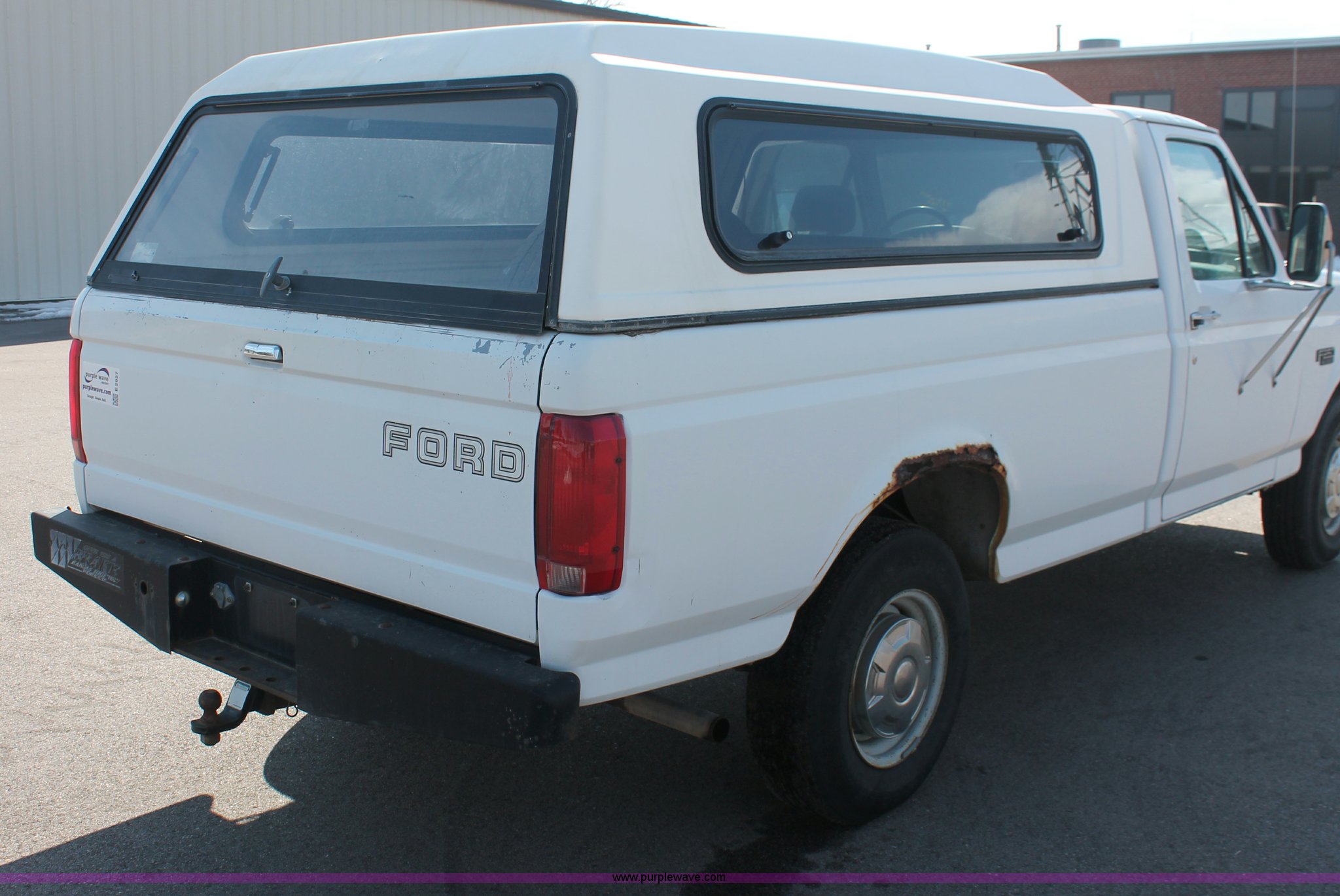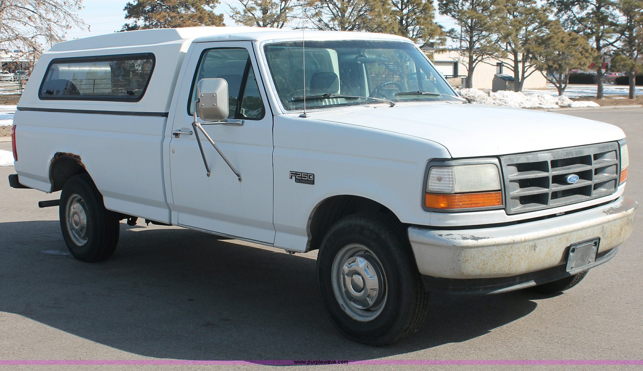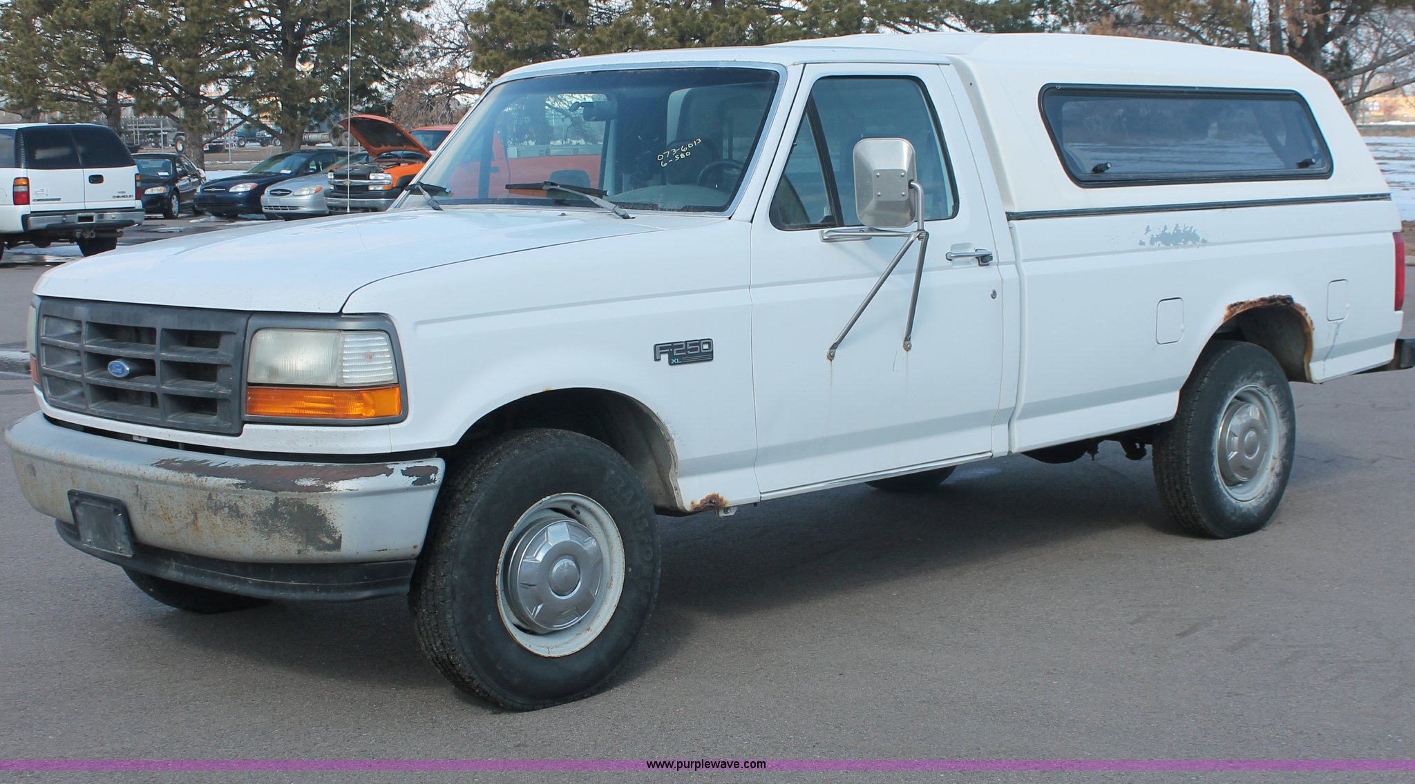 Purple Wave is selling a used Passenger Vehicle in Kansas. This item is a 1993 Ford F250 XL pickup truck with the following: 165,427 miles on odometer, 4.9L L6 OHV 12V gas engine, Automatic transmission, AC and heat, AM/FM, Vinyl interior, Receiver hitch, Trailer wiring, 215/85R16 tires, Weak battery, Hail damage, Rust, Oil leaks, Paint faded and scratched, KDOT ID 073-6013