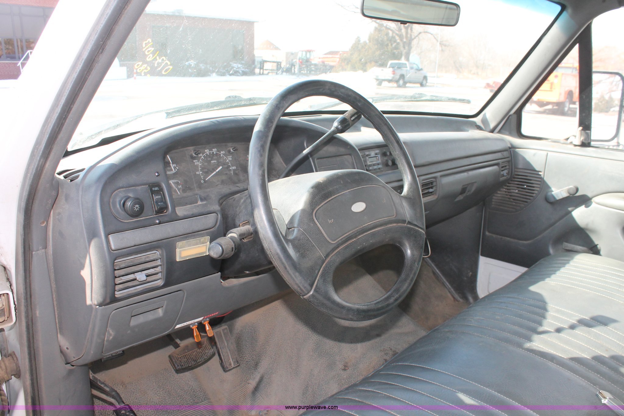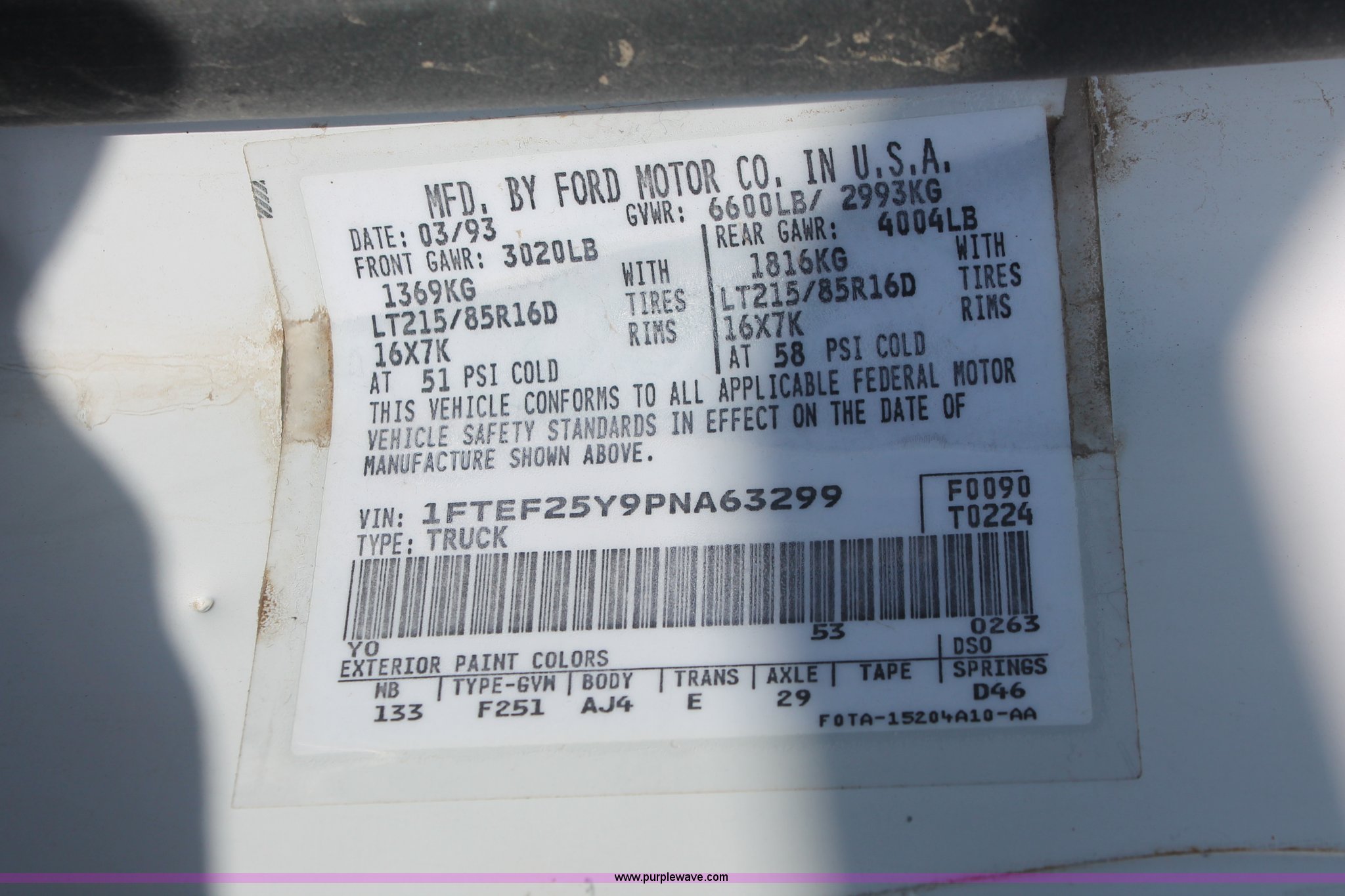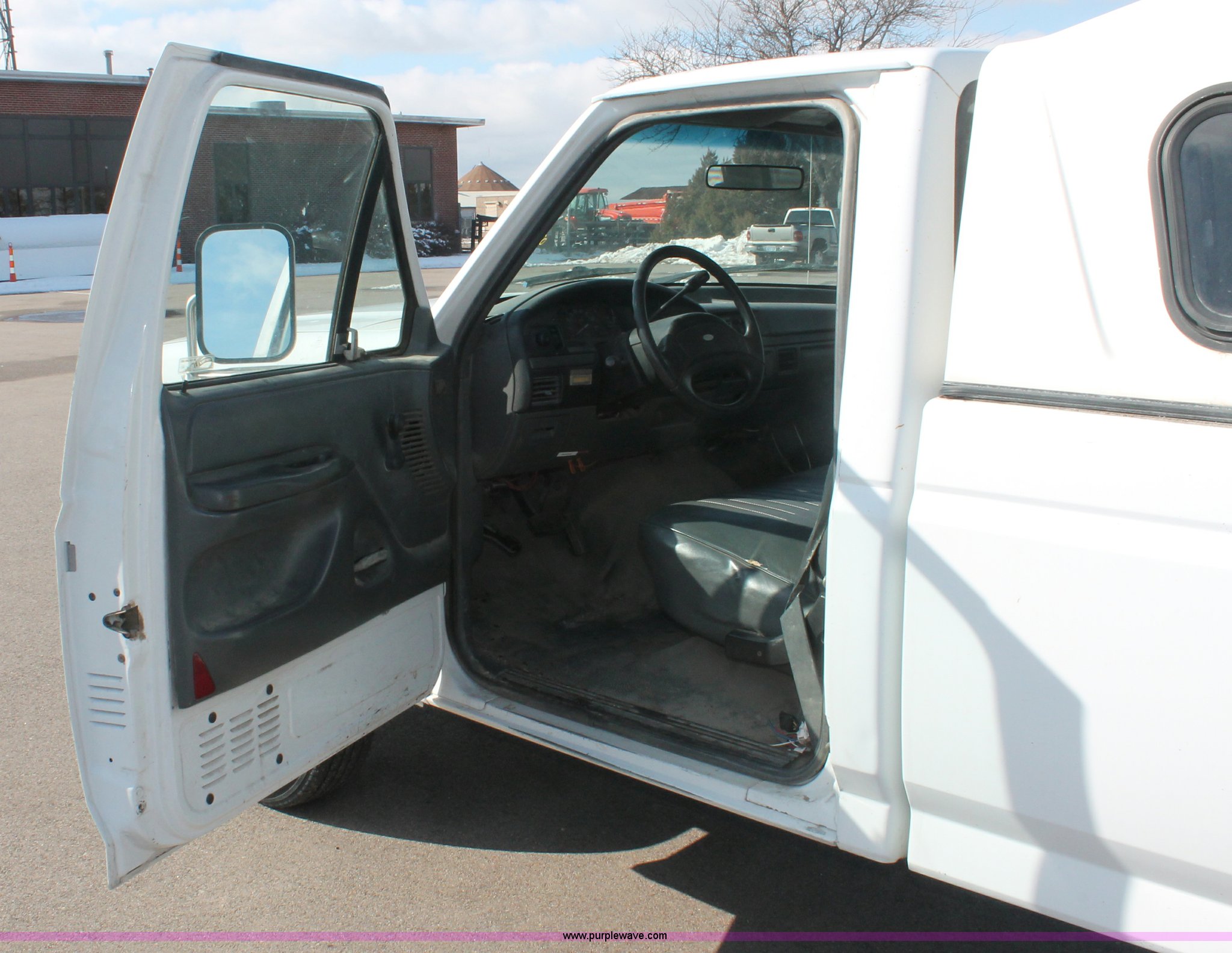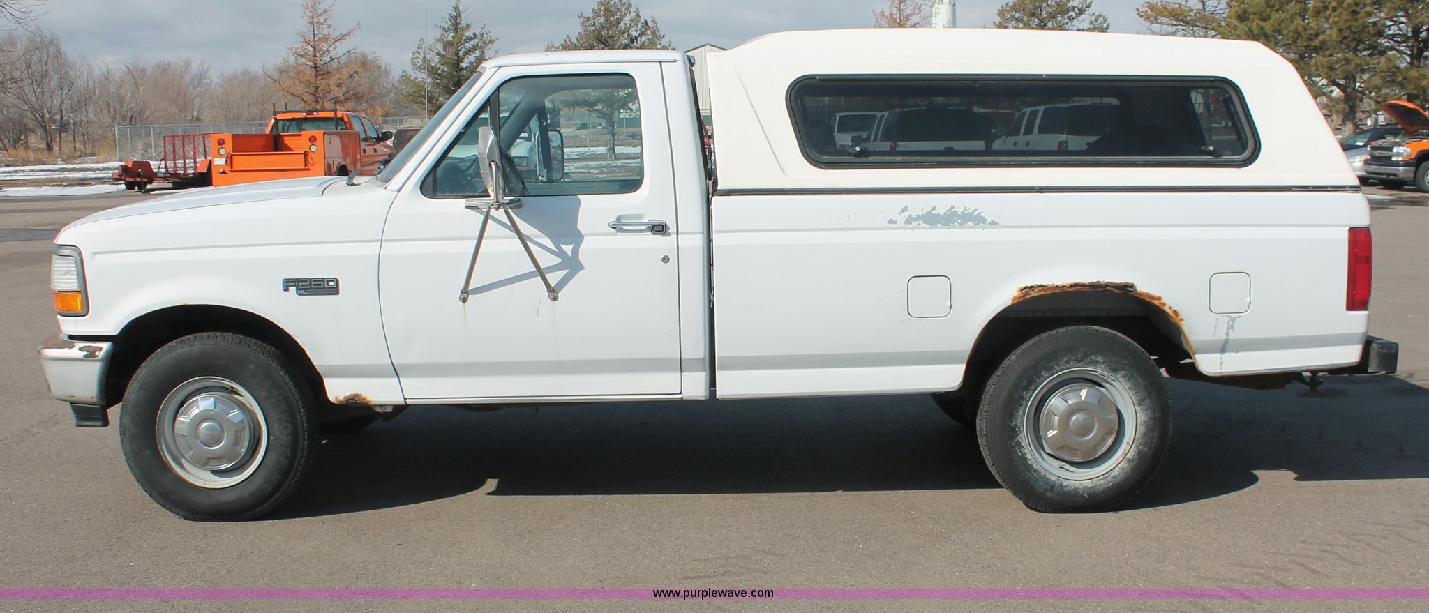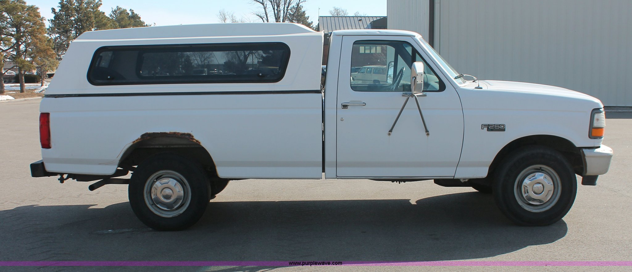 Purple Wave is selling a used Passenger Vehicle in Kansas. This item is a 1993 Ford F250 XL pickup truck with the following: 165,427 miles on odometer, 4.9L L6 OHV 12V gas engine, Automatic transmission, AC and heat, AM/FM, Vinyl interior, Receiver hitch, Trailer wiring, 215/85R16 tires, Weak battery, Hail damage, Rust, Oil leaks, Paint faded and scratched, KDOT ID 073-6013