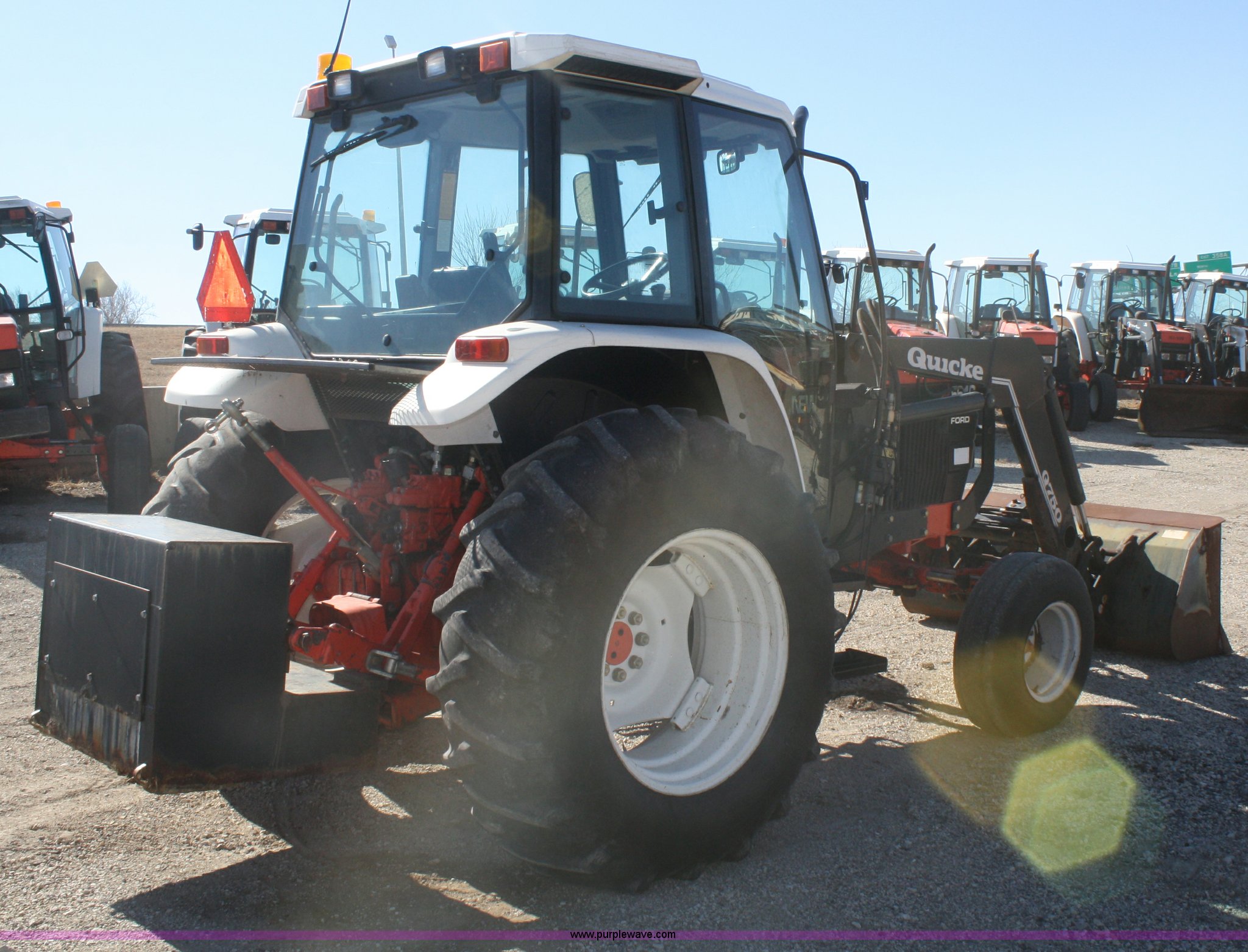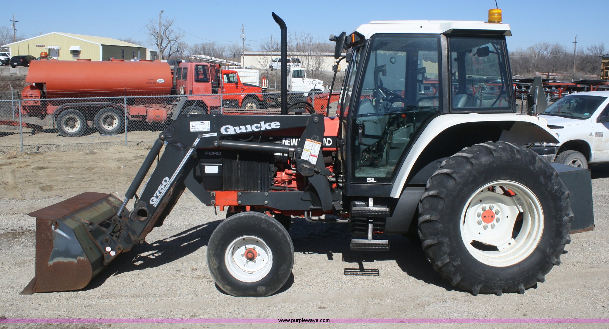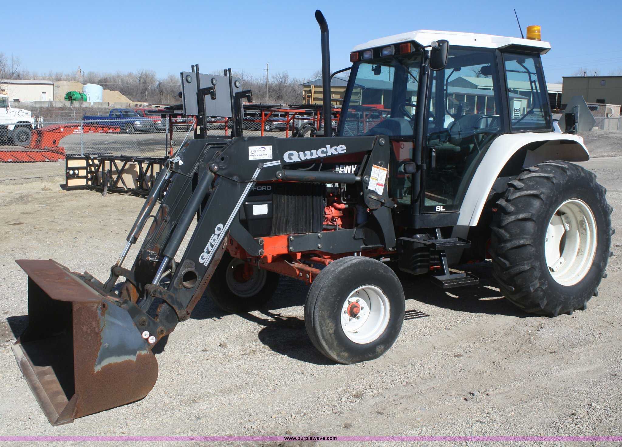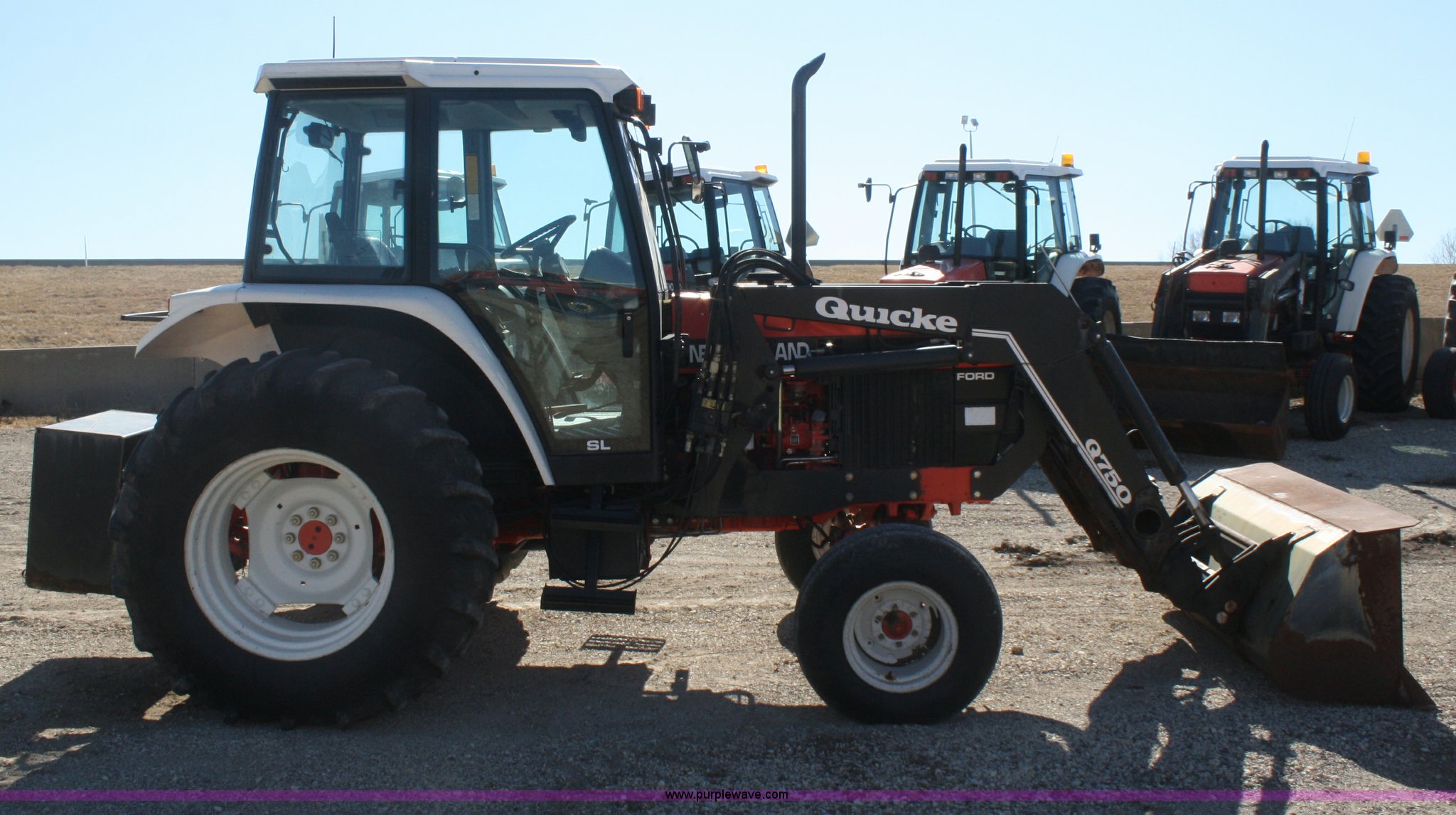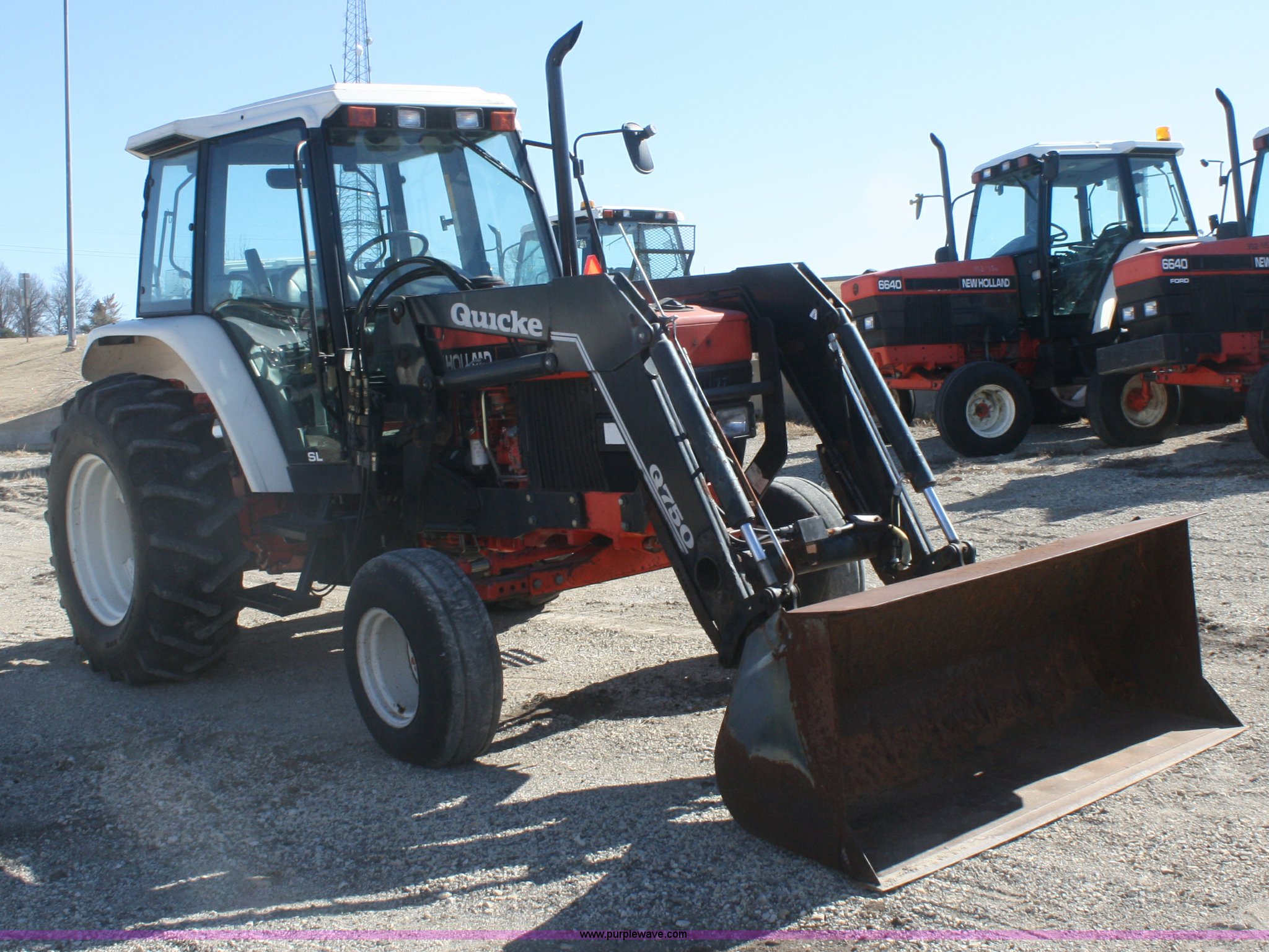 Purple Wave is selling a used Tractor in Kansas. This item is a 1997 New Holland 6640SL tractor with the following: 4,643 hours on meter, Four cylinder diesel engine, Synchro transmission, 12F-12R gears, AC and heat, AM/FM/cassette, Tilt steering wheel, Quick Q70 loader, 72" bucket, Joystick loader control, Three point, Draw bar, 540/1000 PTO, (4) rear hydraulic remotes, 11L-16 front tires, 18.4-30 rear tires, Loader will not dump, Counter weights are not included, Serial 087410B, KDOT ID 352-1137