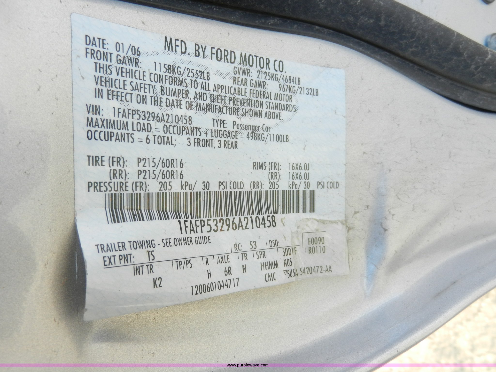 2006 Ford Taurus SE. 139,100 miles on odometer, 3.0L V6 OHV 12V FFV gas engine, Automatic transmission, AC and heat, Tilt, Cruise, AM/FM, Power windows, locks, and mirrors, Cloth interior, 215/60R16 tires, Oil leak at valve cover, Hail damage , Paint faded and scratched, KDOT ID 003-0046. 1FAFP53296A210458. View equipment video. Shipping quotes available. KDOT Topeka. 101 Gage Blvd. Topeka, KS 66604