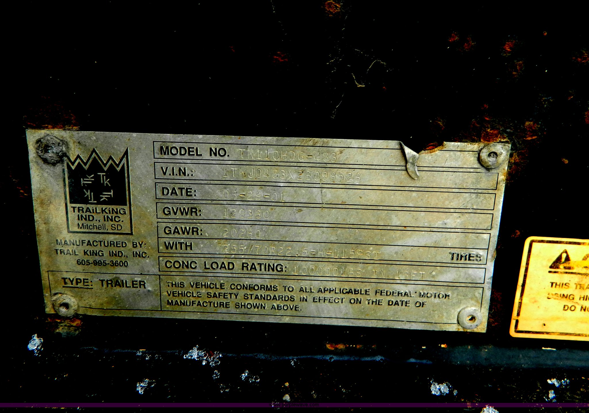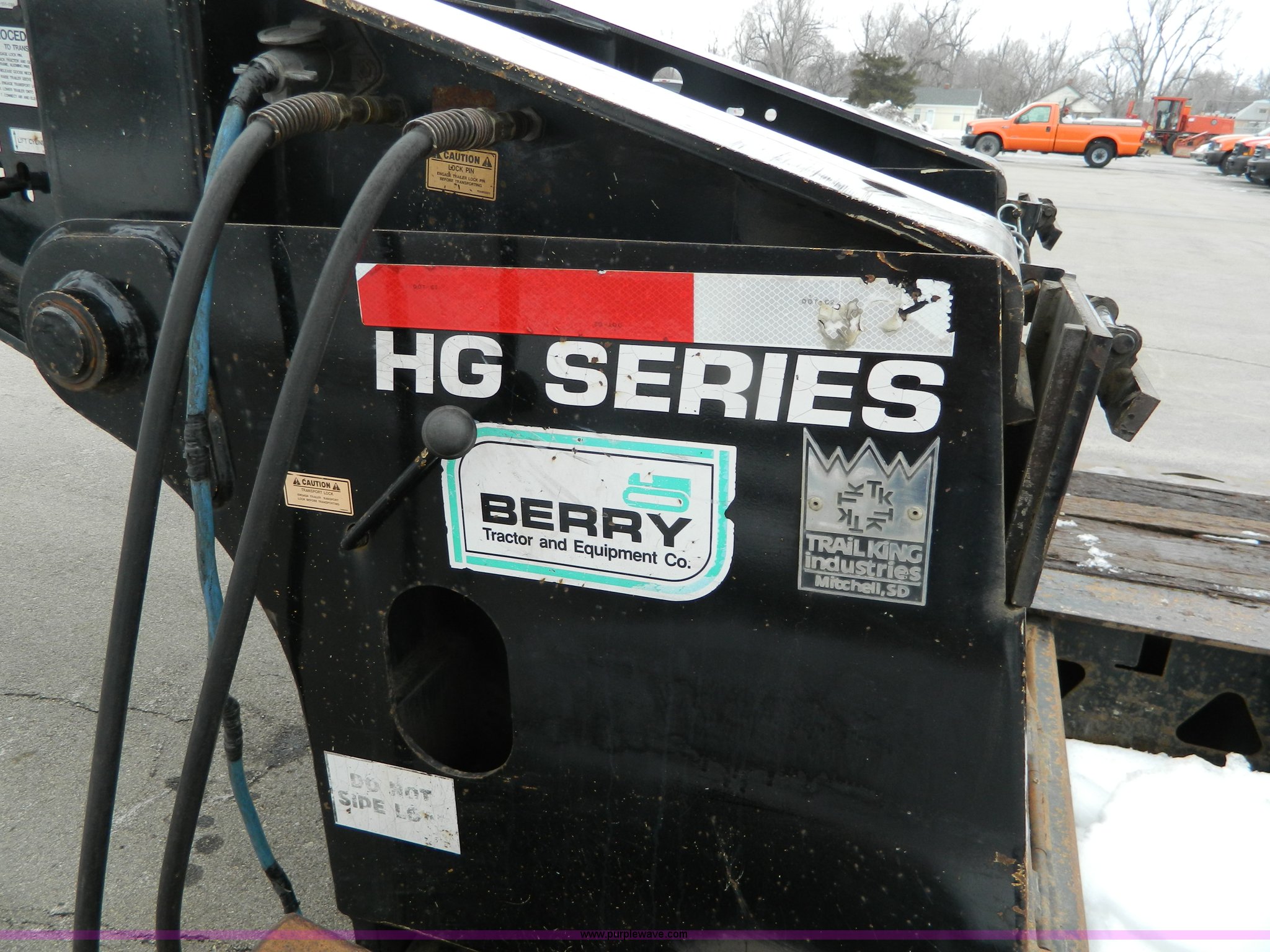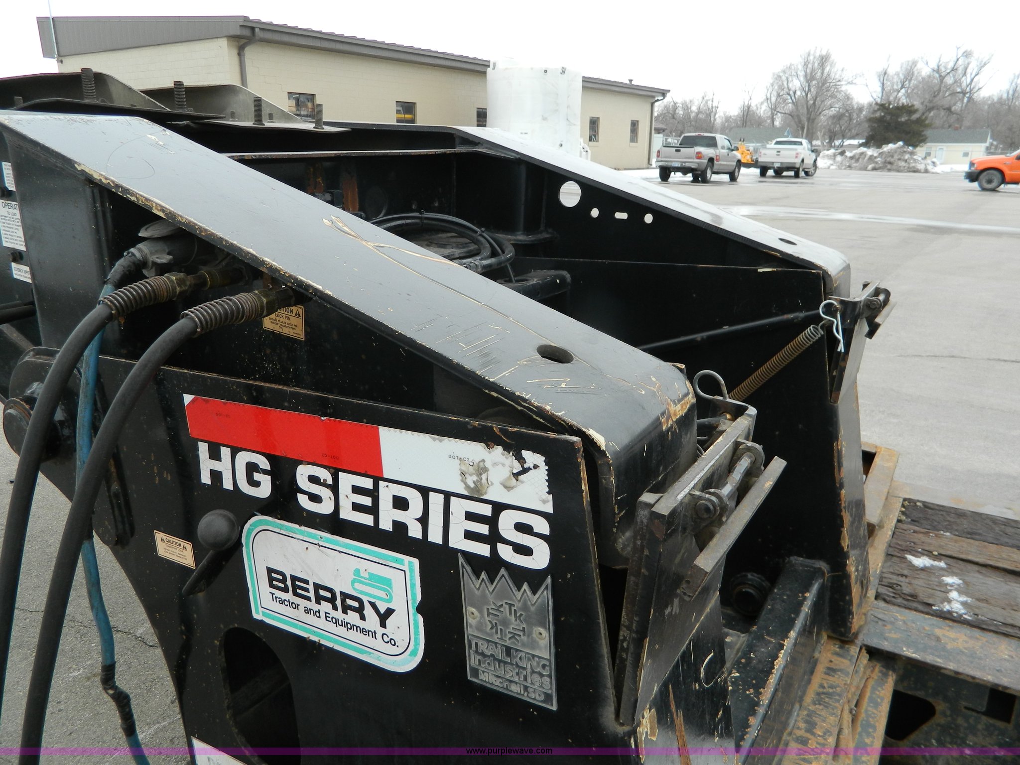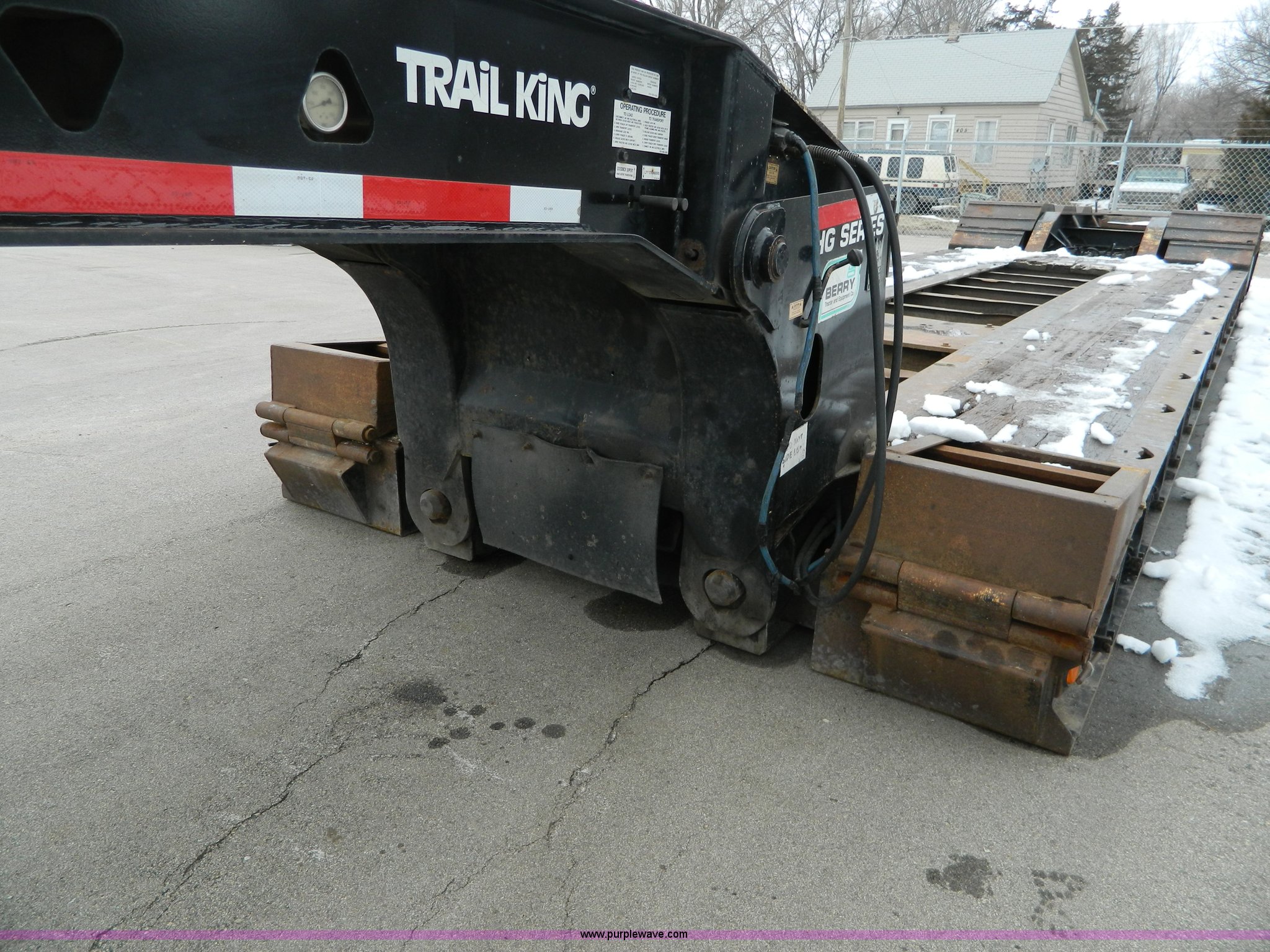Purple Wave is selling a used Equip. Trailer in Kansas. This item is a 2002 Trail King TK110HDG-483 triple axle lowboy trailer with the following: 24'L x 102"W main deck, 12'L upper deck, 10'L neck, 2'L x 20"W folding ramps, 12"W side folding extensions, 10,000 lbs operating capacity, Removable gooseneck, Dump valve, Treated plate wheel covers, Parker hydraulic fittings, D-ring tie downs, Recently replaced brakes, 255/70R22.5 tires, KDOT ID 778-2011