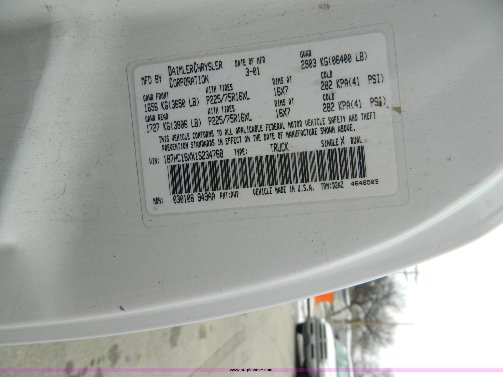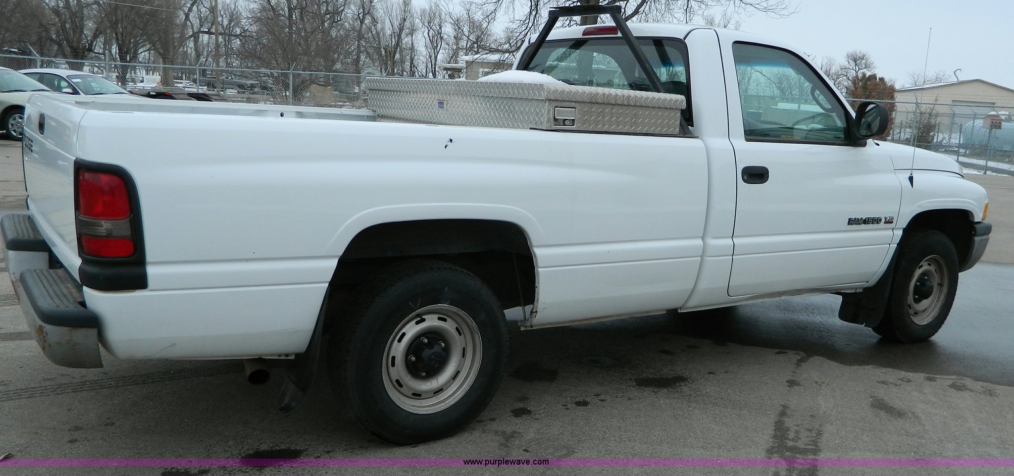 Purple Wave is selling a used Passenger Vehicle in Kansas. This item is a 2001 Dodge Ram 1500 pickup truck with the following: 151,696 miles on odometer, 3.9L V6 OHV 12V gas engine, Automatic transmission, AC and heat, Tilt, Cruise, AM/FM, Manual windows and locks, Vinyl interior, Rawson Koenig cross bed toolbox, 225/75R16 tires, Paint faded and scratched, KDOT ID 051-2071