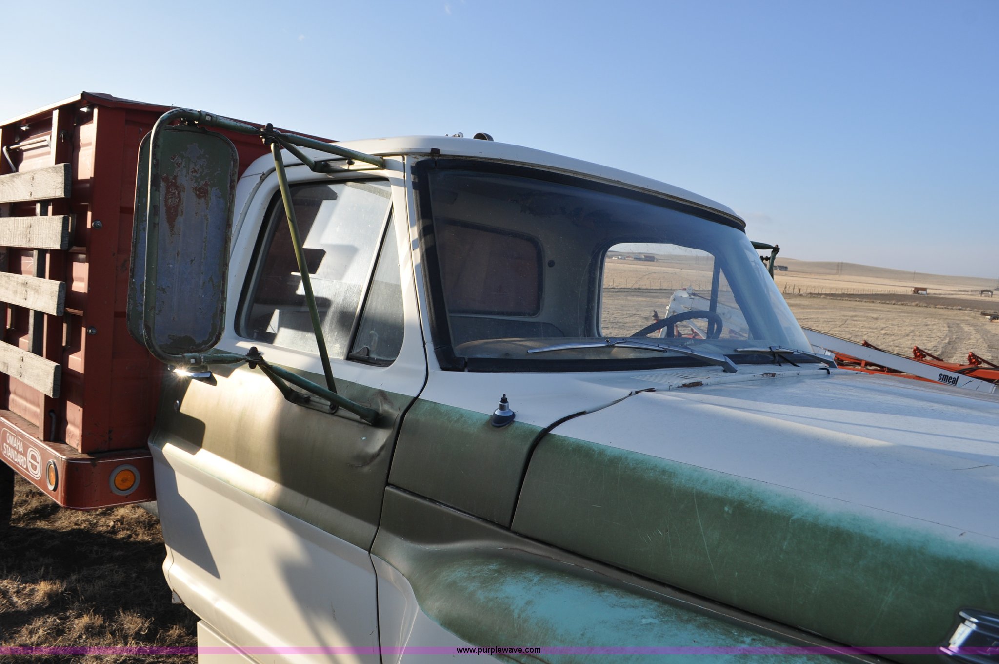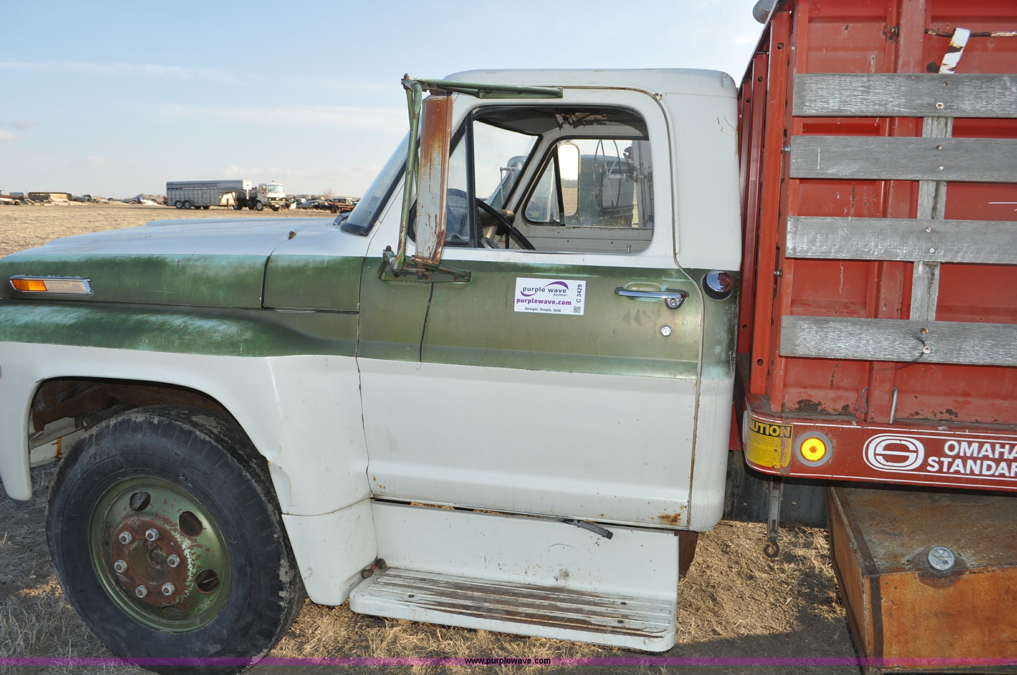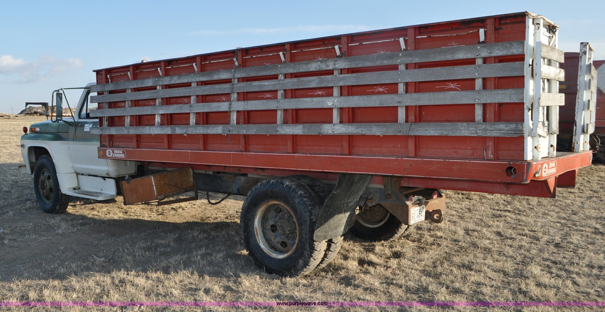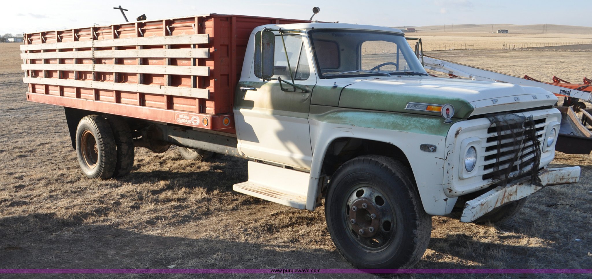 Purple Wave is selling a used Grain Truck in Nebraska. This item is a 1970 Ford F600 grain truck with the following: 80,178 miles on odometer, Ford 330 CID V8 gas engine, Manual transmission, Heat, Manual windows and locks, Omaha Standard grain box, 18'L x 94"W, 40"H sides, Stock racks, Hoist, Wood floor, Pintle hitch, 9.00-20 tires, No battery, Bent drive shaft, Body damage, GVWR 19,500 lbs, Unknown running condition, No keys
