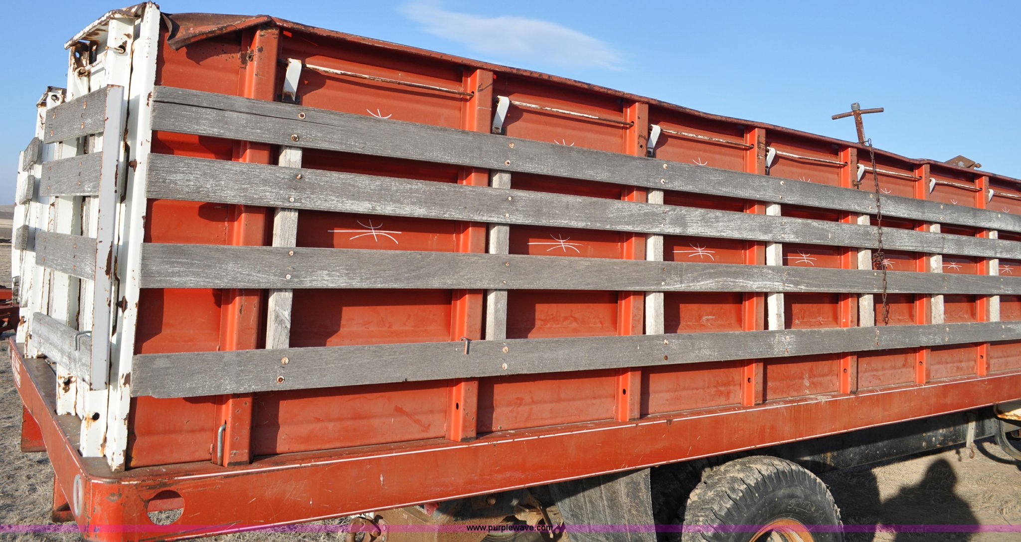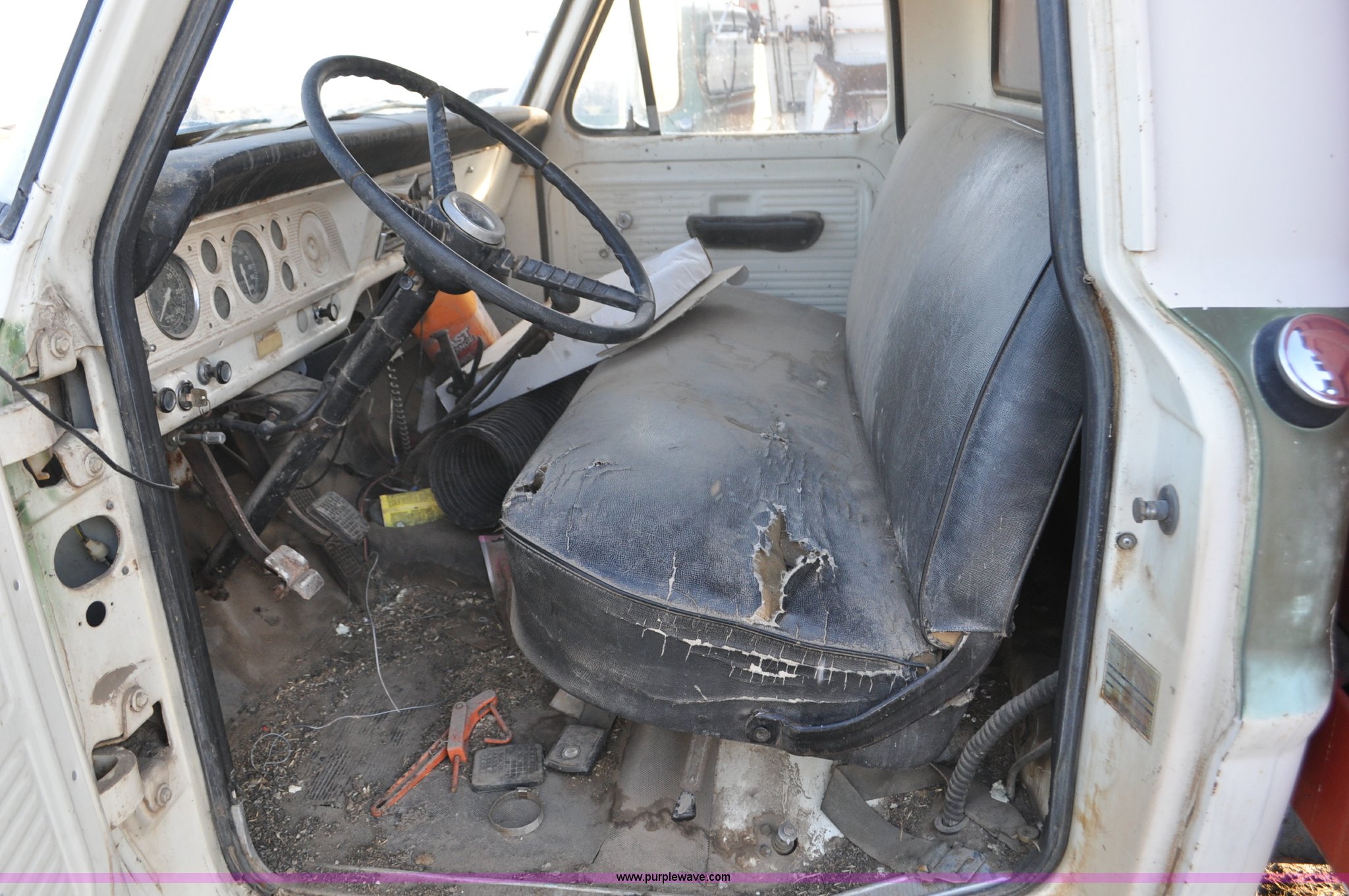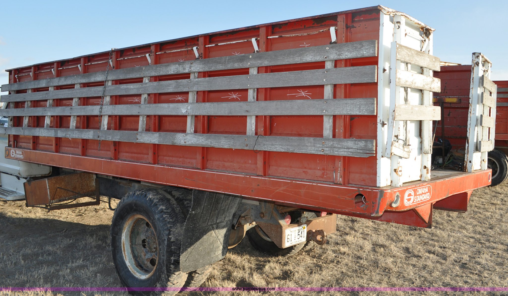 Purple Wave is selling a used Grain Truck in Nebraska. This item is a 1970 Ford F600 grain truck with the following: 80,178 miles on odometer, Ford 330 CID V8 gas engine, Manual transmission, Heat, Manual windows and locks, Omaha Standard grain box, 18'L x 94"W, 40"H sides, Stock racks, Hoist, Wood floor, Pintle hitch, 9.00-20 tires, No battery, Bent drive shaft, Body damage, GVWR 19,500 lbs, Unknown running condition, No keys