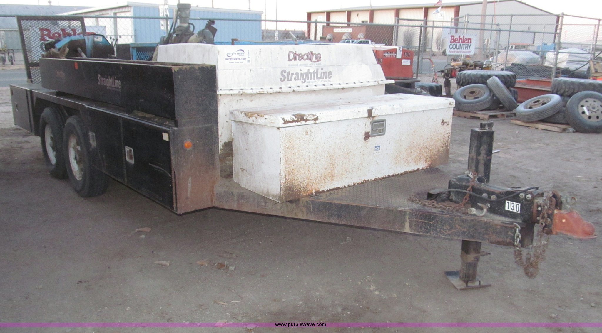 1991 Straightline Directline DL805 directional trenchless drilling system. Ford four cylinder gas engine, Hydraulic power unit, 300 gallon tank, 50' of hydraulic hose, Power unit frame contains fuel tank, FMC 608 hydraulic pump Leaks, 115'L x 1.5" diameter drill stem 5'L sections, 9" and 12" back reamers, 3.5" boring bit, 1 1/2" to 1 3/4" adapter, Pull back, 300 gallon water tank Seam leaks, Shop built tandem axle trailer Rawson Koenig front mounted saddle box, Side storage compartments, Top storage compartment, LT235/85R16 tires, Operator's manual available, Serial 01087, EIN 130. 01D0S1610L0000020. Shipping quotes available. TL Sund Constructors Inc.. 707 N. Ontario. Lexington, NE 68850