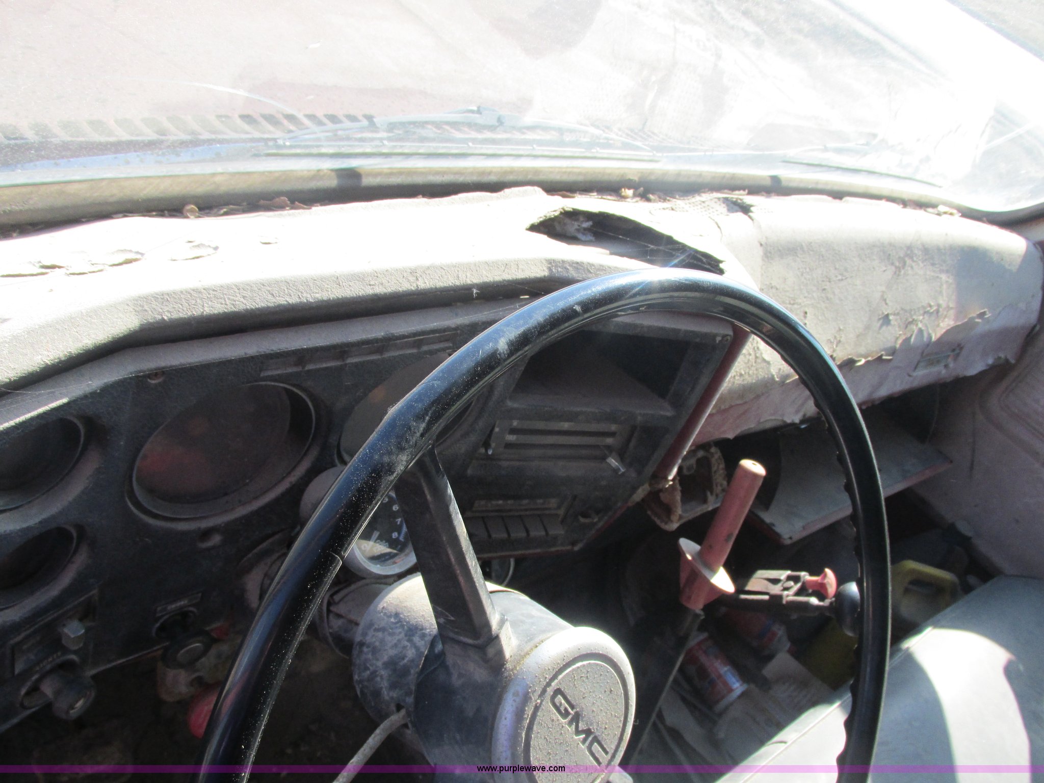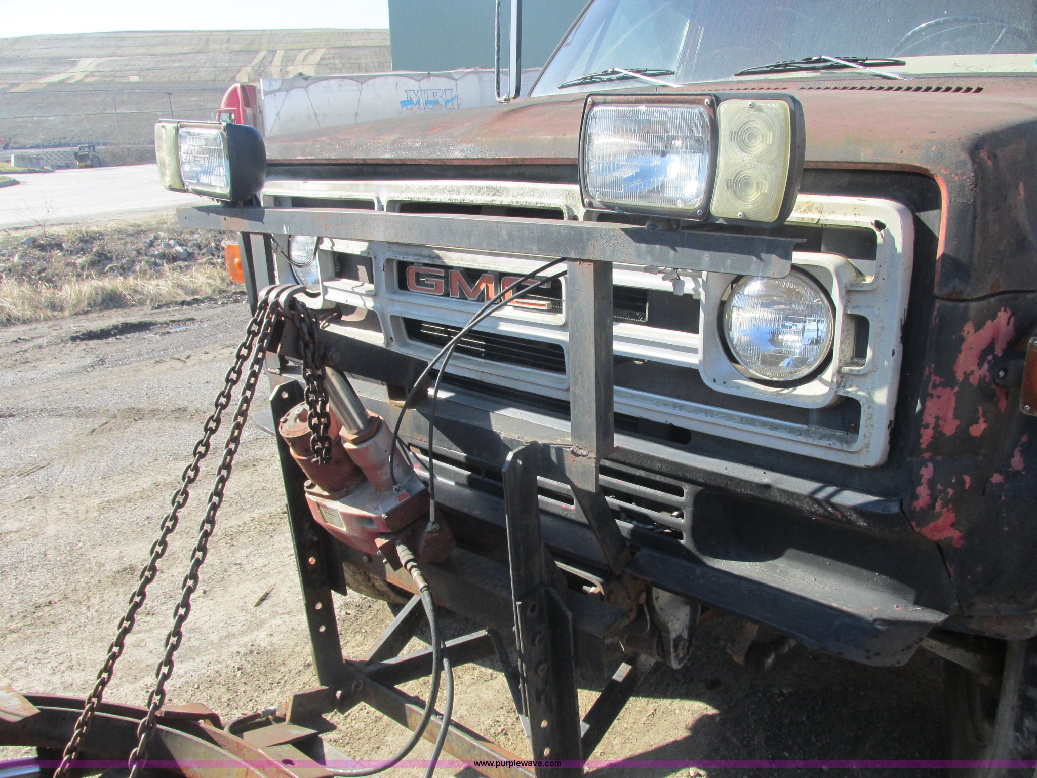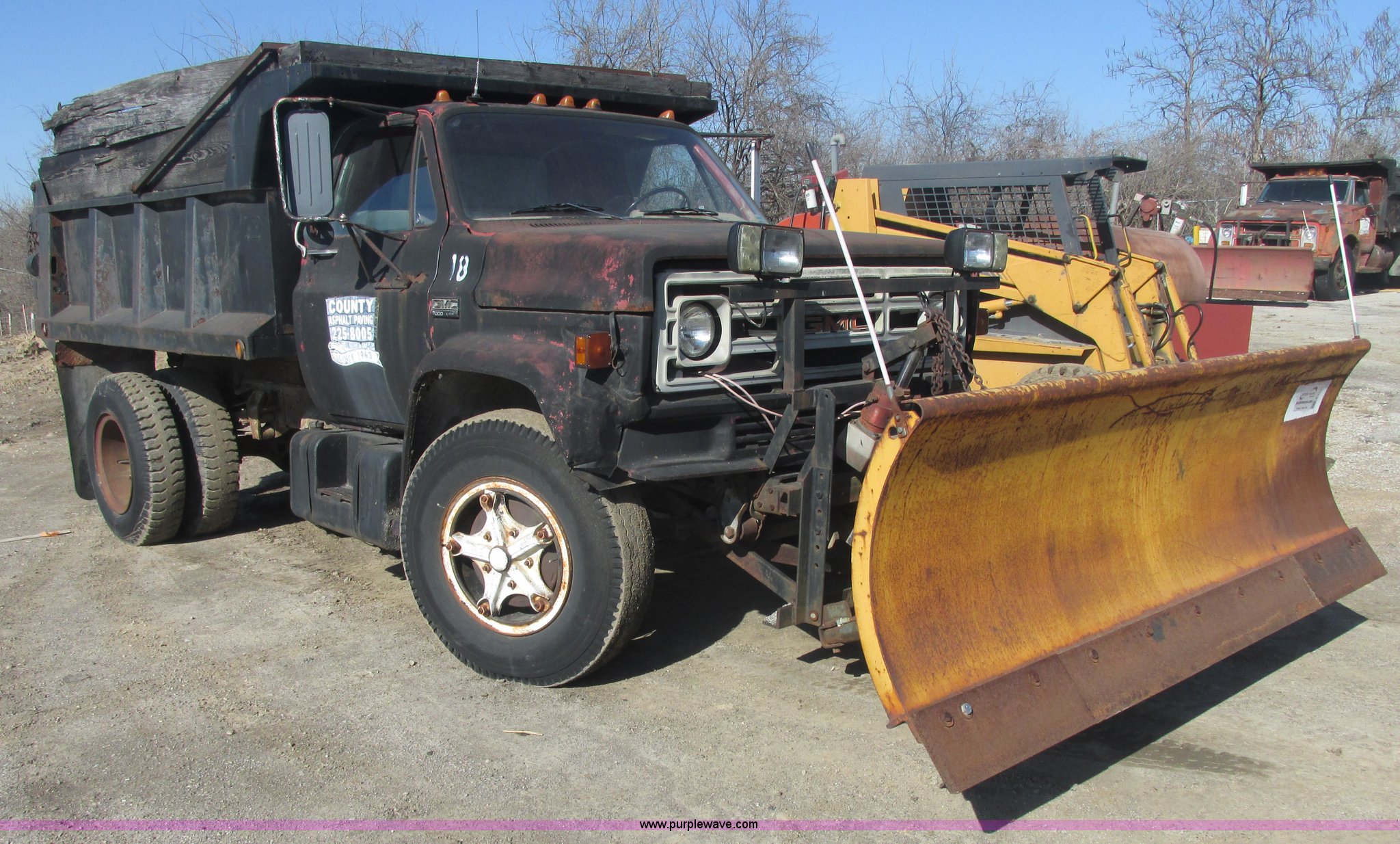 Purple Wave is selling a used Construction Dump Truck in Missouri. This item is a 1979 GMC 7000 dump truck with the following: 40,213 miles on odometer, 366 CID gas engine, Five speed manual transmission, Two speed rear end, Heat, Western 9' snow plow, In cab controls, 10' dump bed, 50 gallon fuel tank, Pintle hitch, Roll over tarp, PTO, Spring suspension, Hydraulic brakes, 10.00-20 tires, Recently replaced muffler, Interior/exterior cosmetic damage, Rust, Dash pad broken, Dents, Paint fading and peeling, Broken marker light, PTO noisy