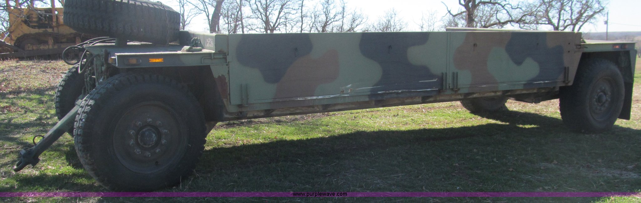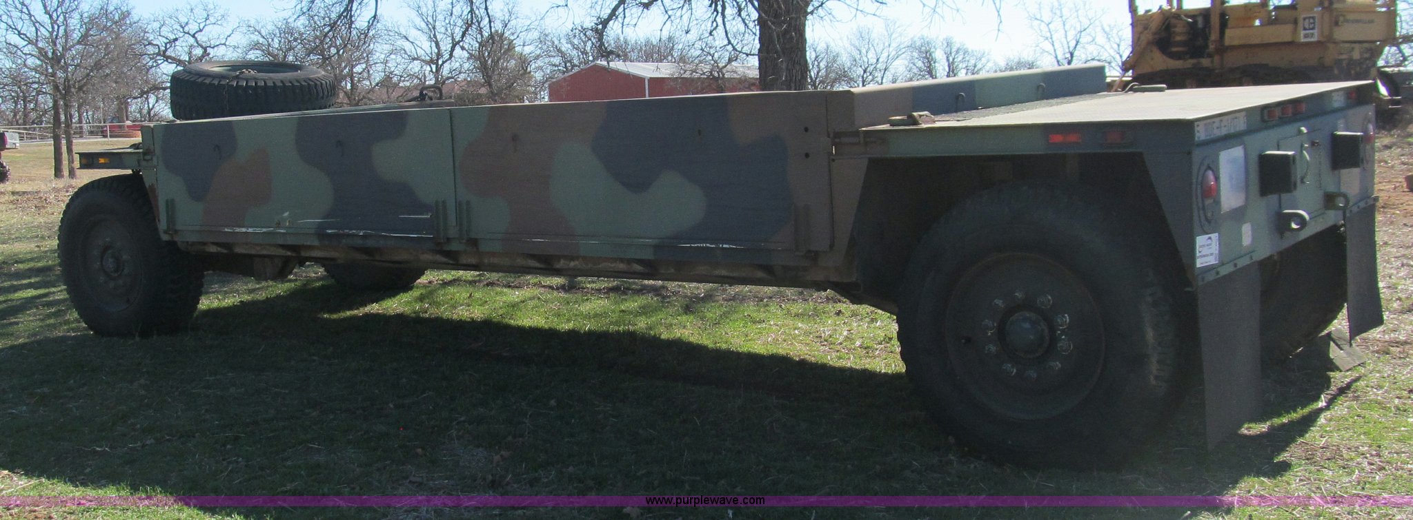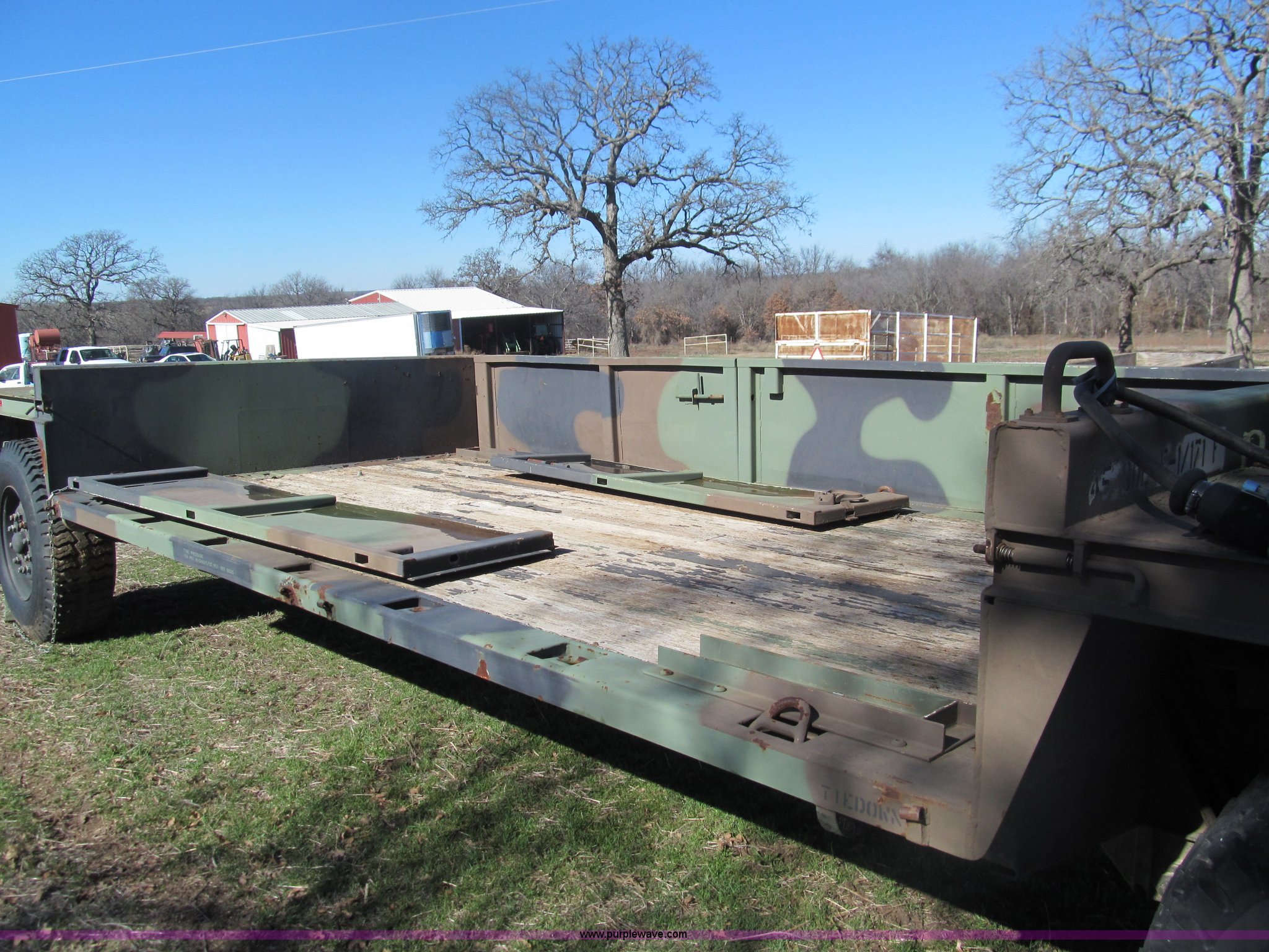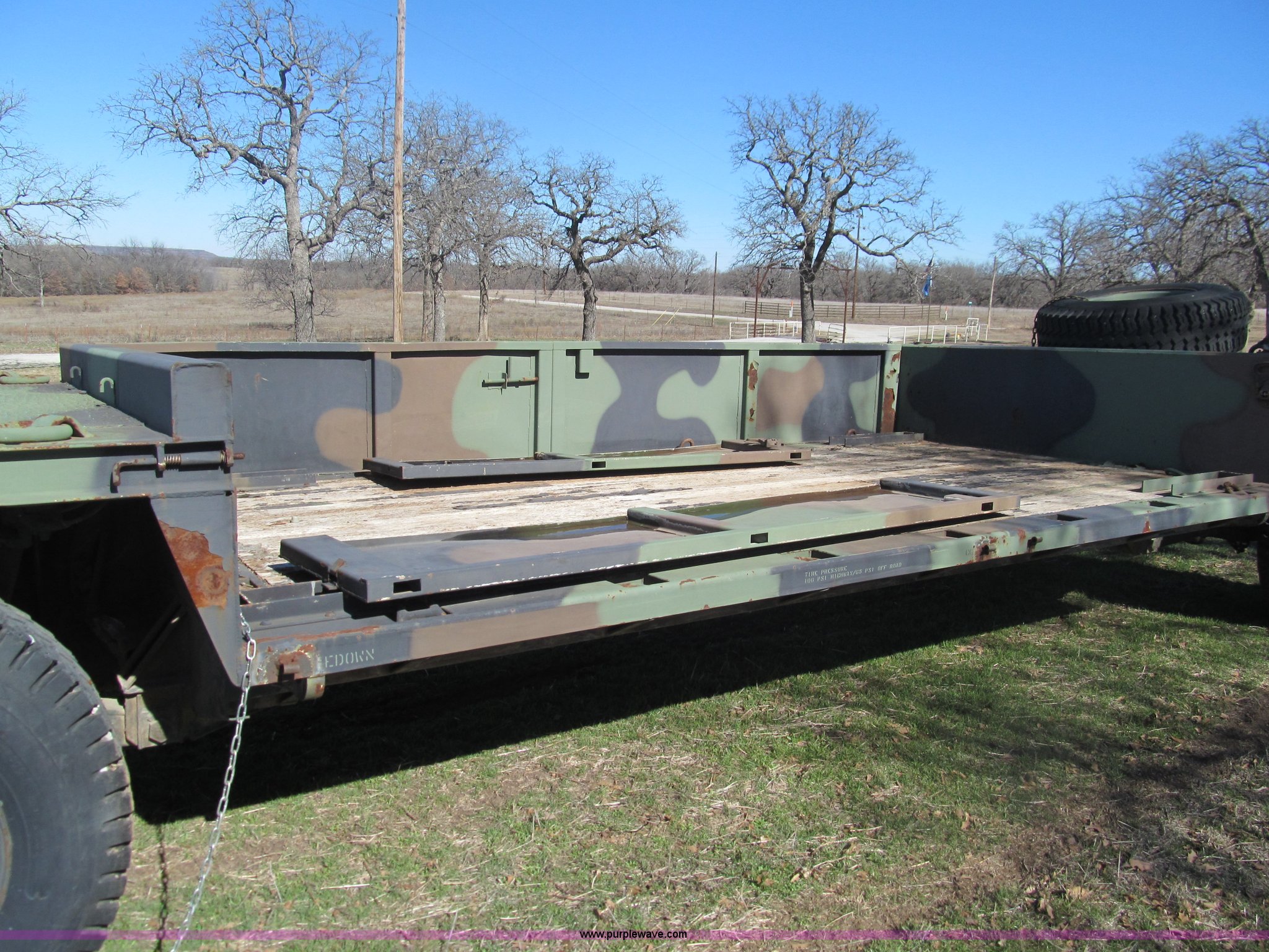 Purple Wave is selling a used Car or Utility Trailer in Oklahoma. This item is a 2002 Hemat M989A1 trailer with the following: 22'L x 8'W, Pintle hitch, Removable sides fold down, 14.9' inside wooden bed, Tie downs, Tarp hooks, Air bag lift, Air brakes, 15-22 tires, Serial 98255