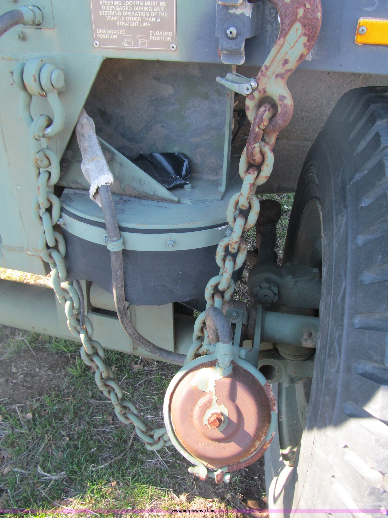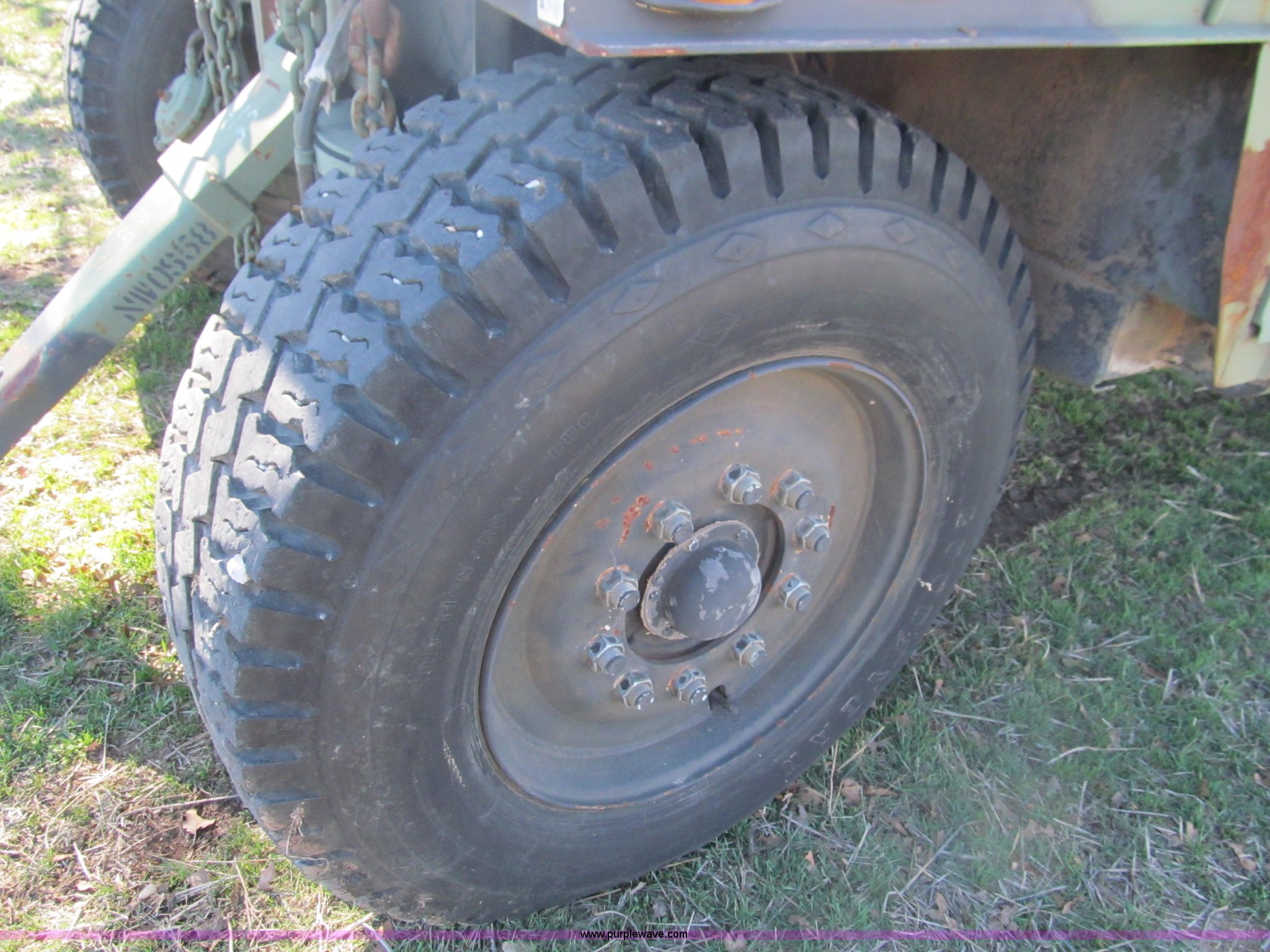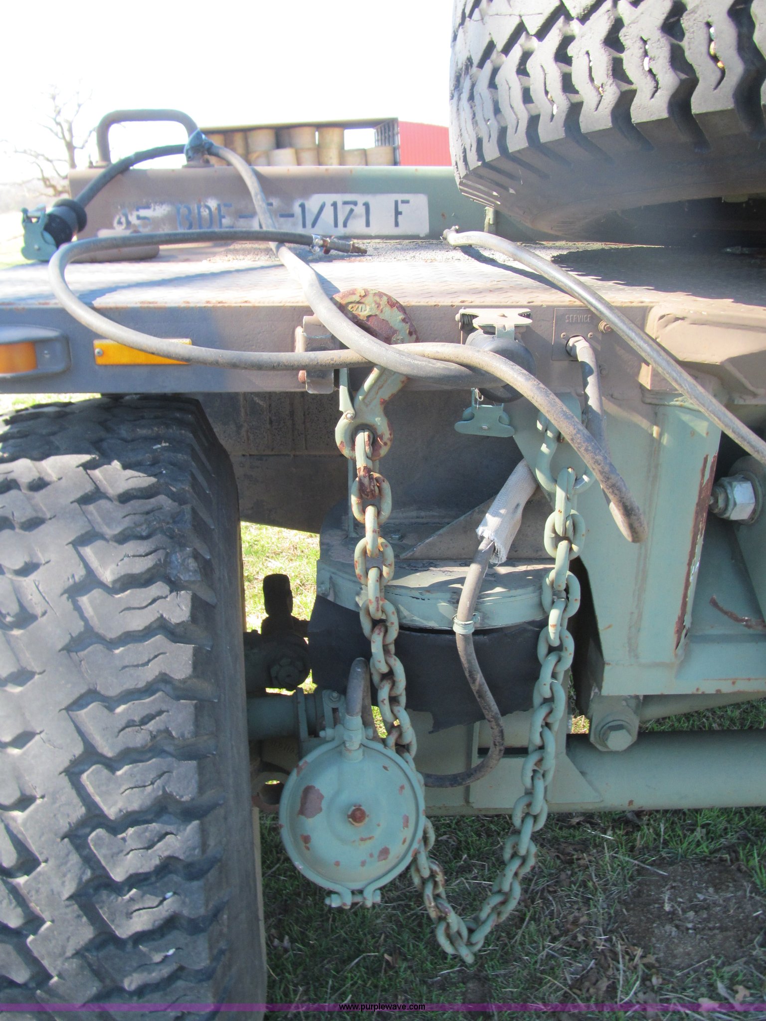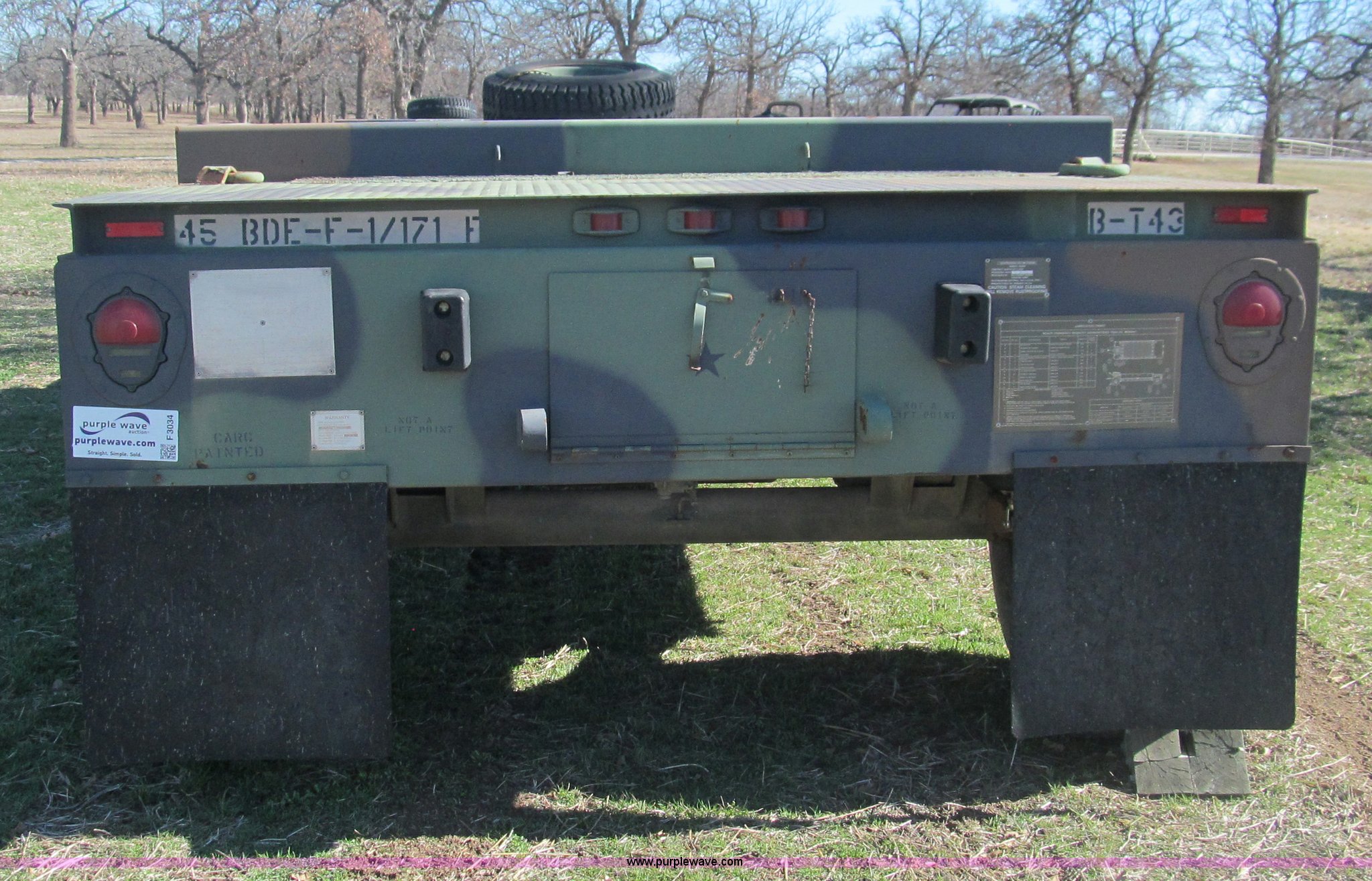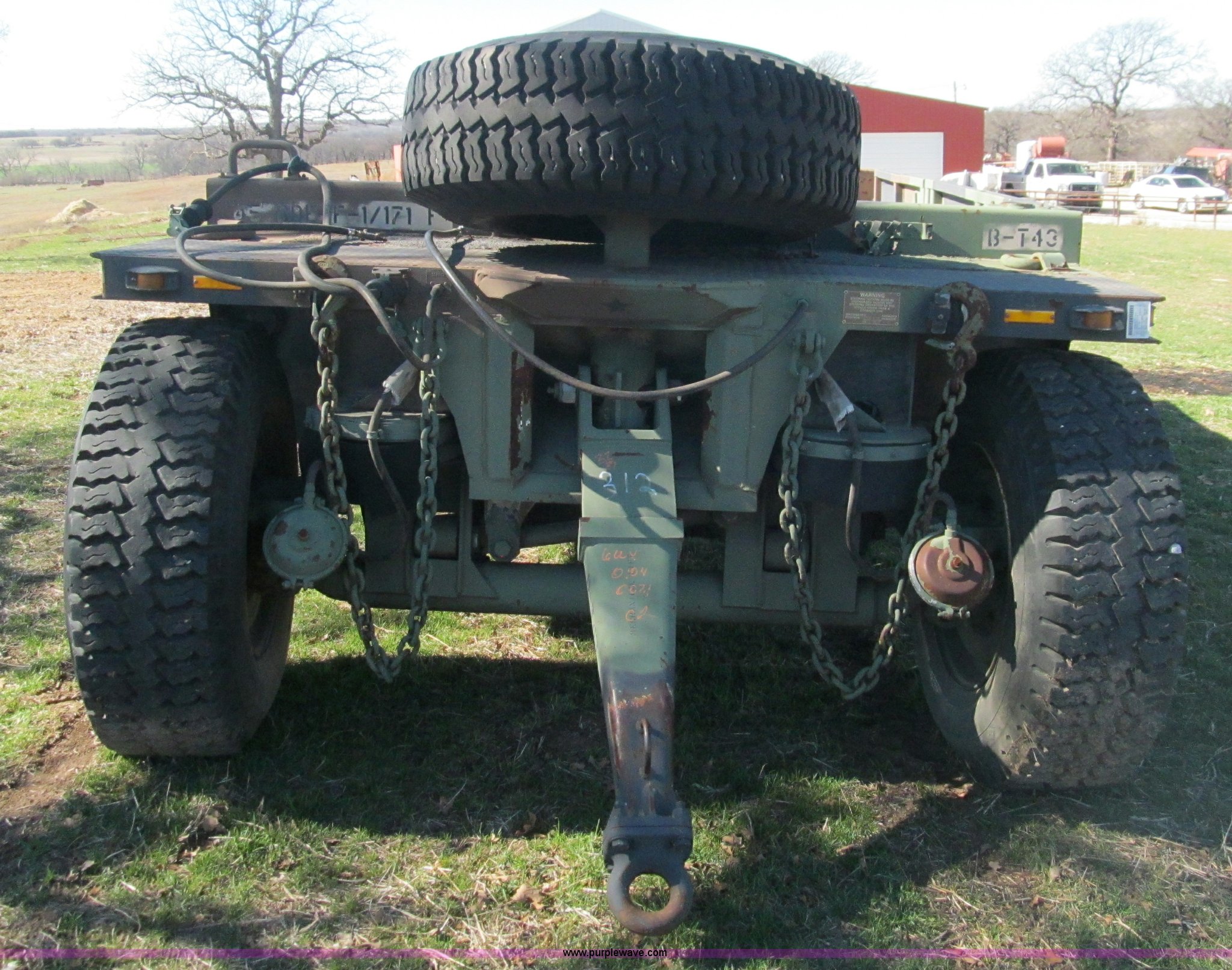 Purple Wave is selling a used Car or Utility Trailer in Oklahoma. This item is a 2002 Hemat M989A1 trailer with the following: 22'L x 8'W, Pintle hitch, Removable sides fold down, 14.9' inside wooden bed, Tie downs, Tarp hooks, Air bag lift, Air brakes, 15-22 tires, Serial 98255