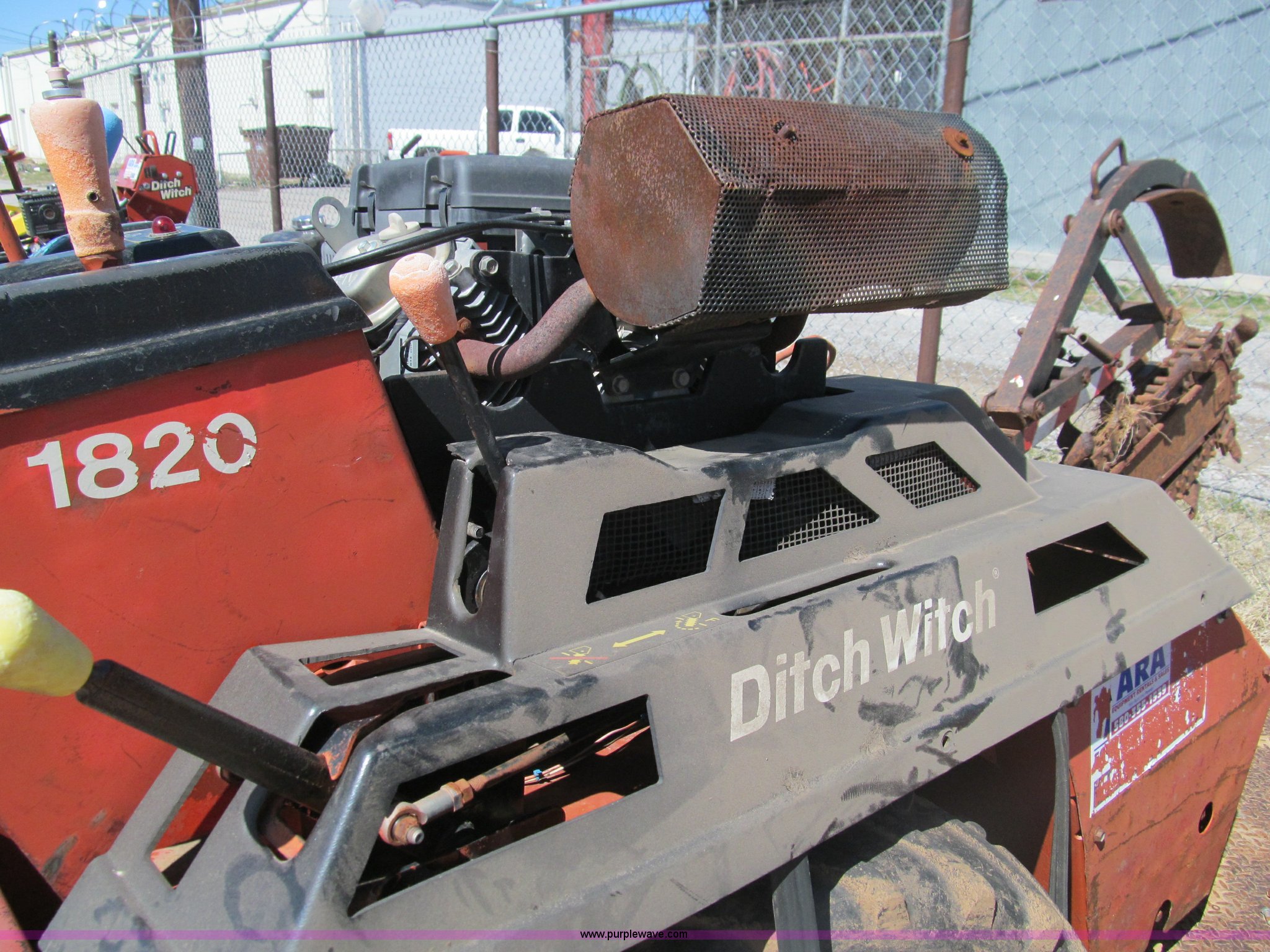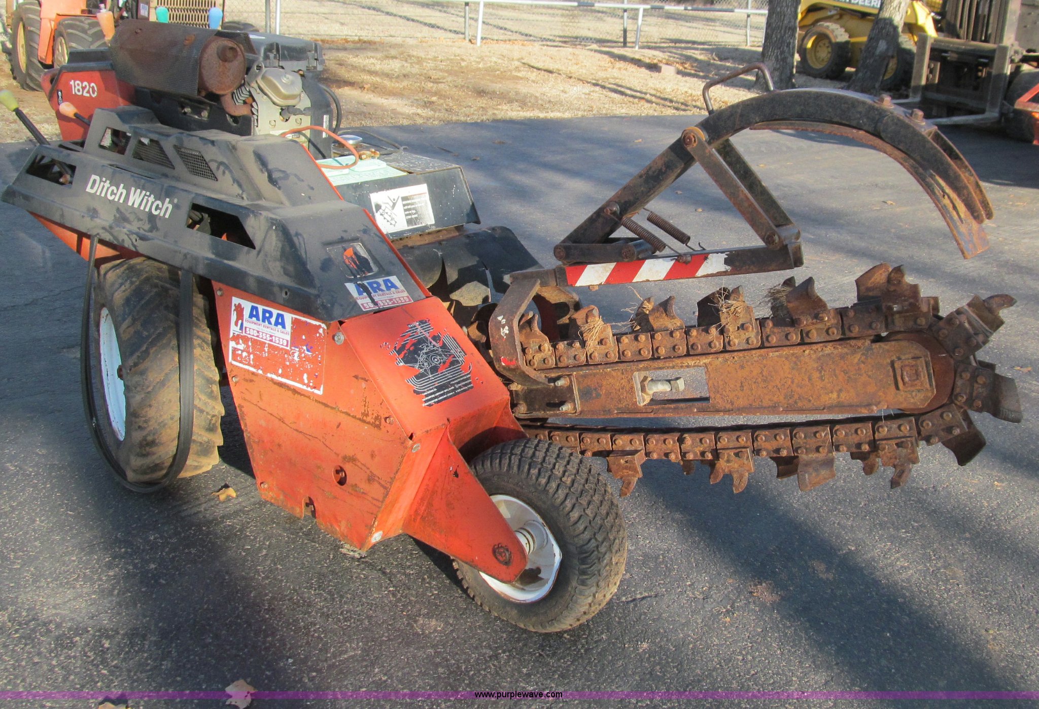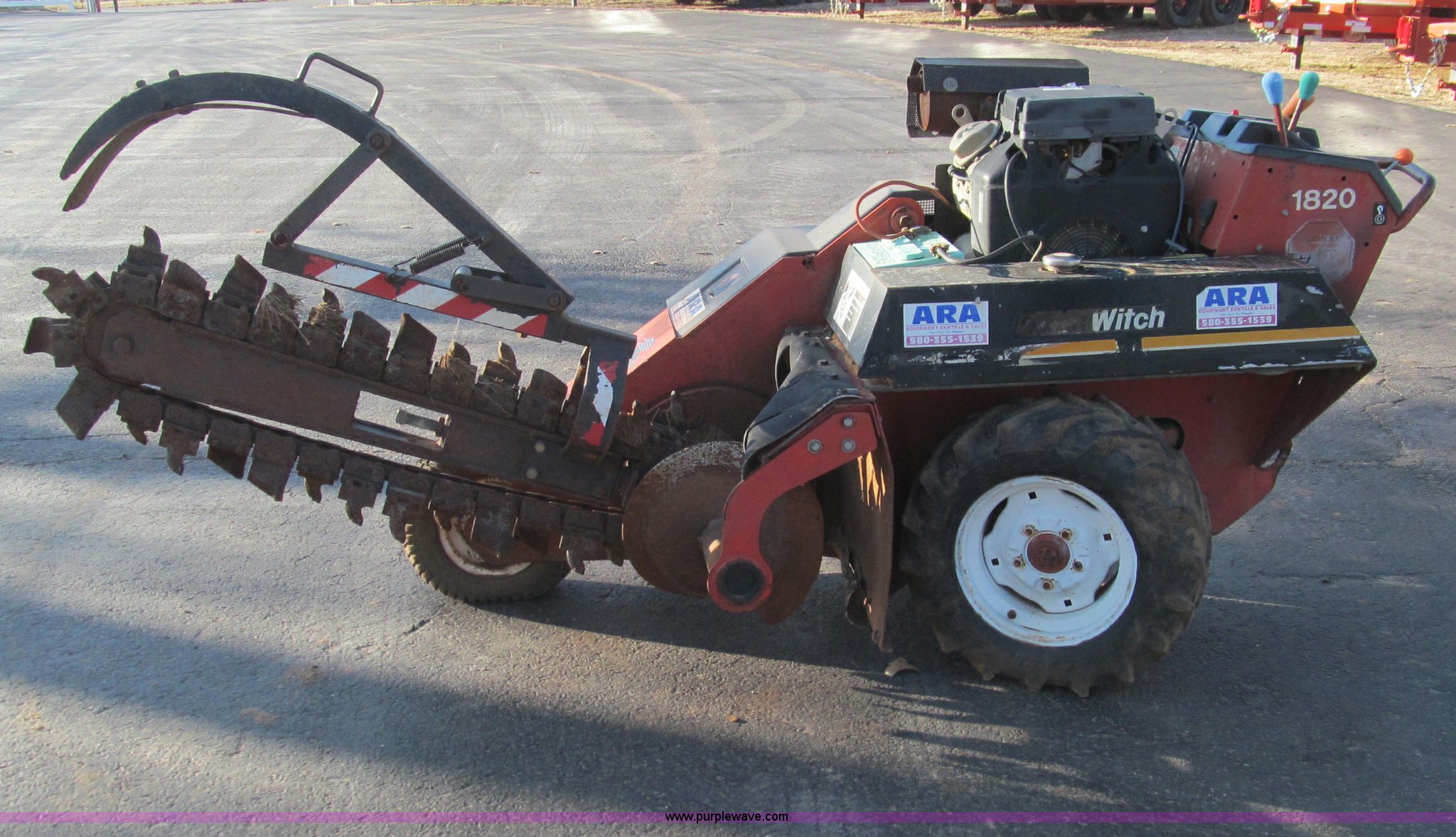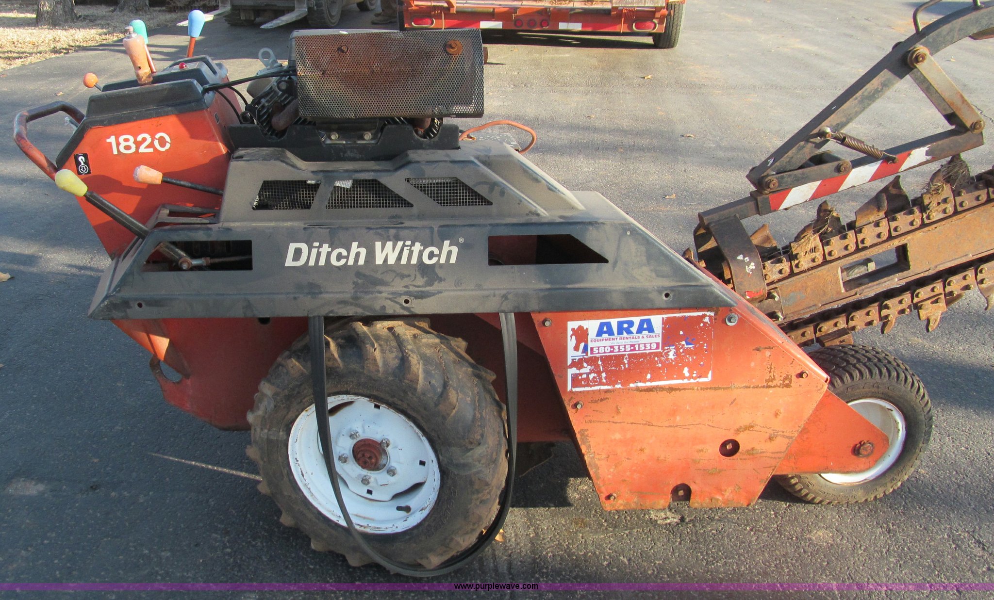 Purple Wave is selling a used Trencher or Rock Saw in Oklahoma. This item is a Ditch Witch 1820 walk along trencher with the following: 1,453 hours on meter, Honda GX610 air cooled gas engine, 17.5 Flywheel HP, 23 x 8.5-12 NHS tires, Trailer is not included, Serial 1M2210