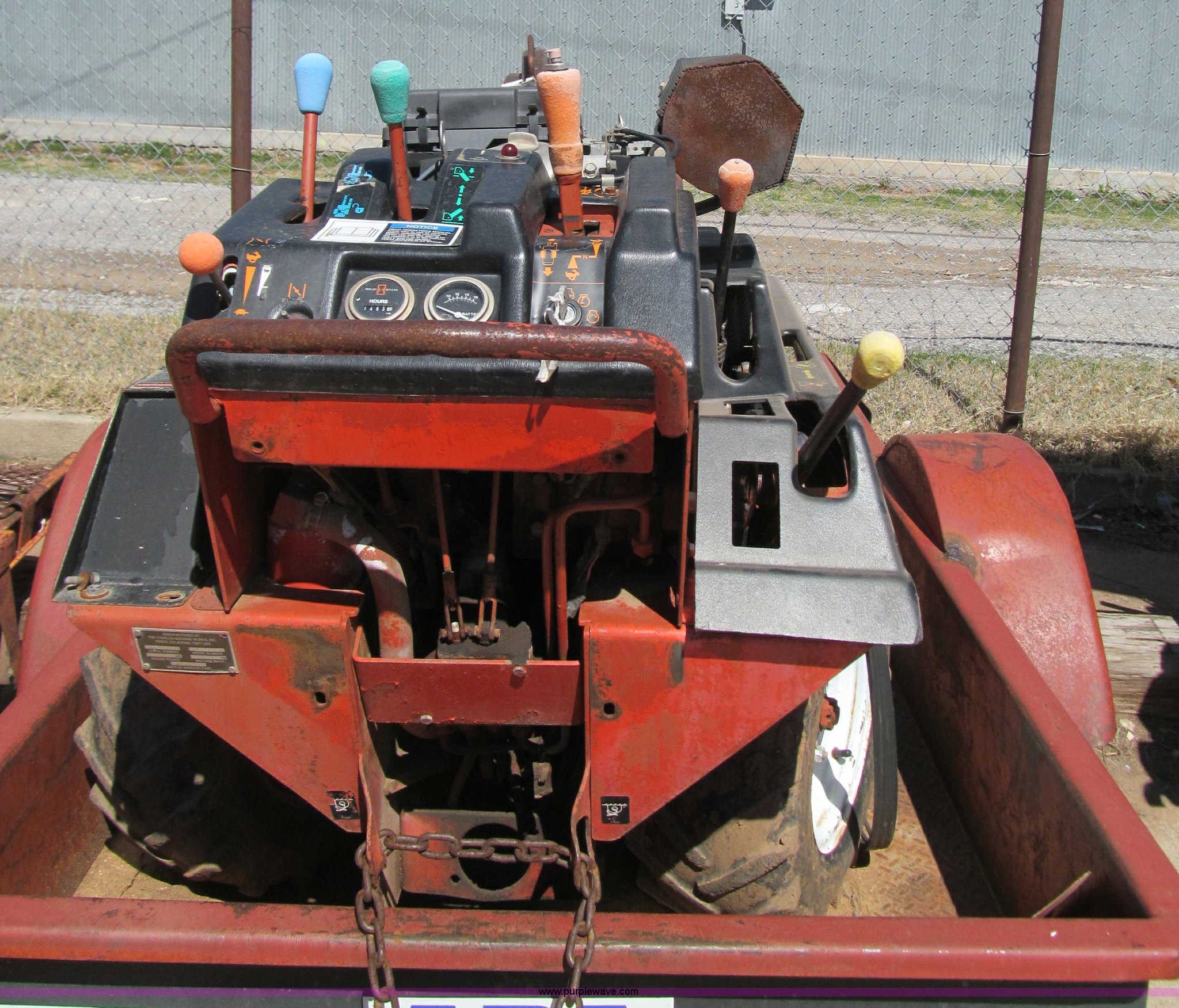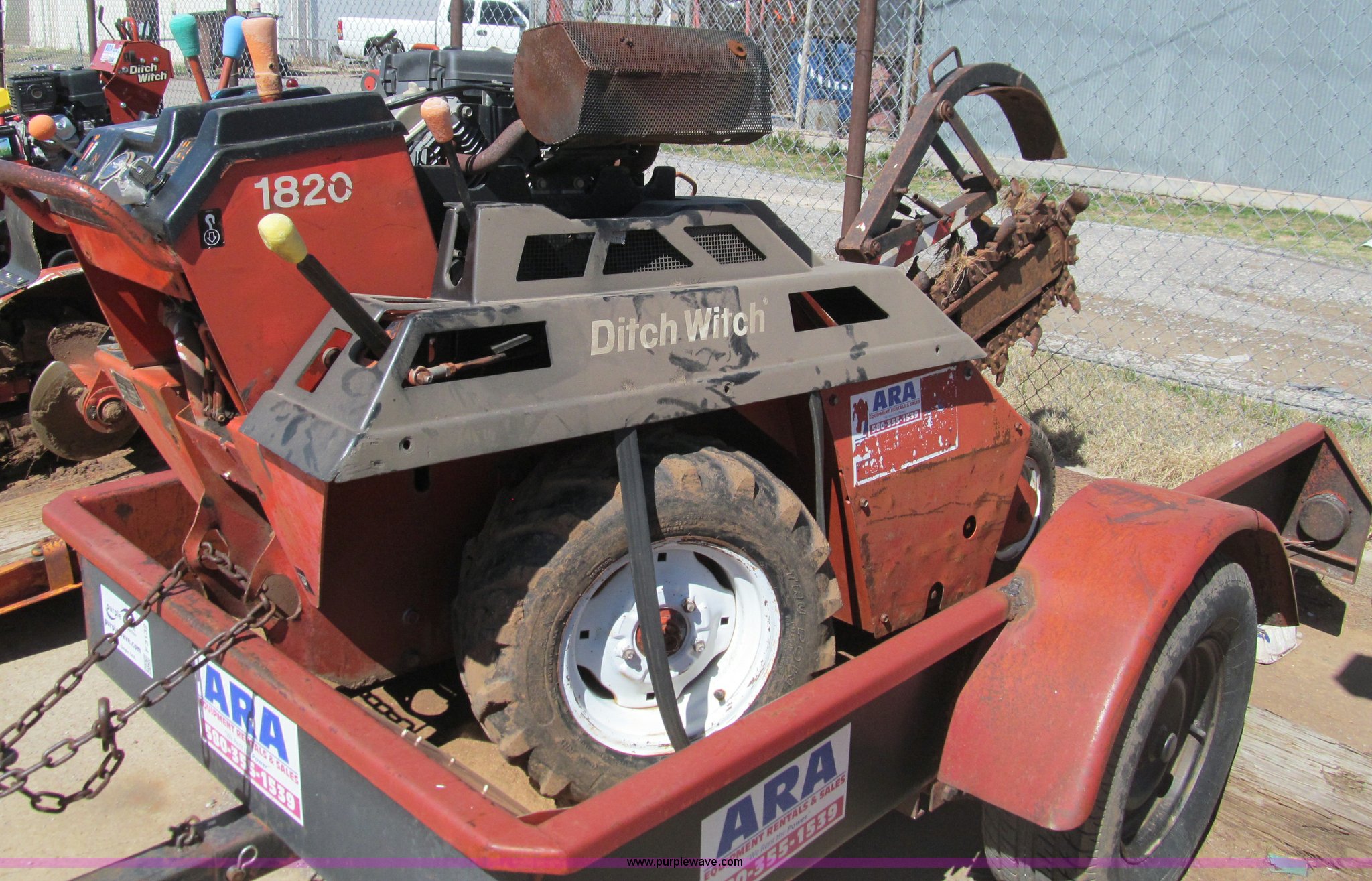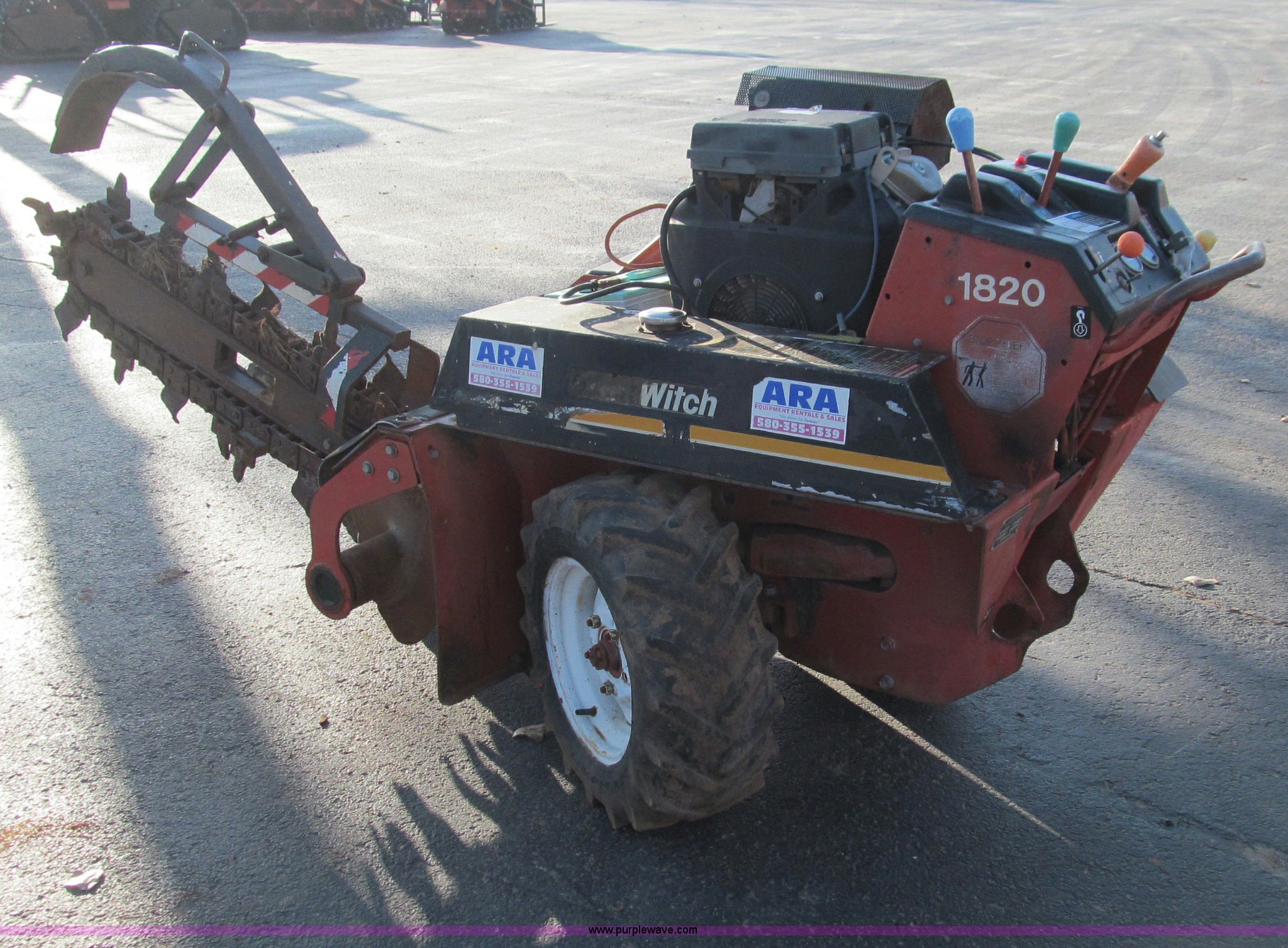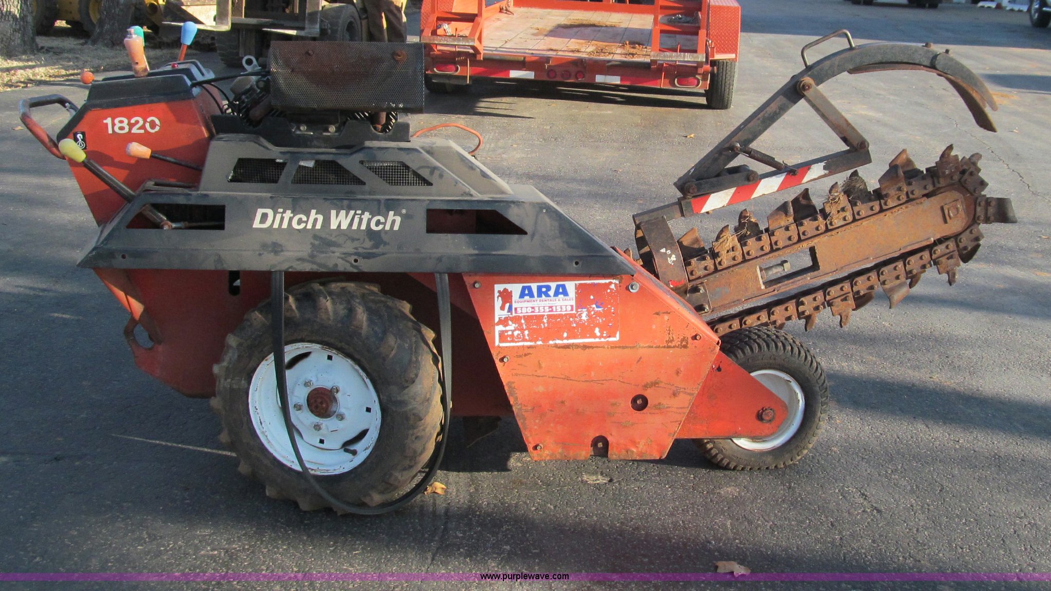 Purple Wave is selling a used Trencher or Rock Saw in Oklahoma. This item is a Ditch Witch 1820 walk along trencher with the following: 1,453 hours on meter, Honda GX610 air cooled gas engine, 17.5 Flywheel HP, 23 x 8.5-12 NHS tires, Trailer is not included, Serial 1M2210