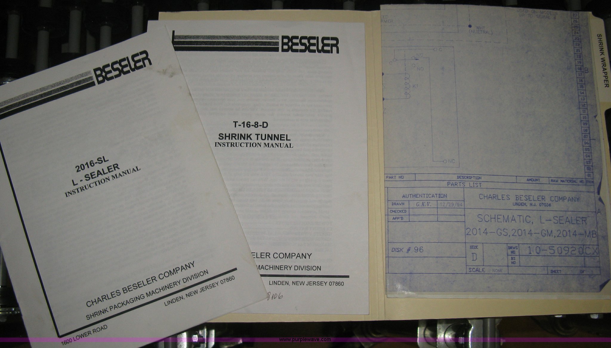 Purple Wave is selling a used Other Industrial or Business in Kansas. This item is a Beseler T-16-8 shrink wrap tunnel with the following: Beseler 2016-MTB-SL sealer station/wrap table, 20" x 16" sealer area, Accordion style roller table, Adjustable length 5' to 17', Casters, Hot knife, Magnetic hold down, 115V, Instruction manuals, Schematic