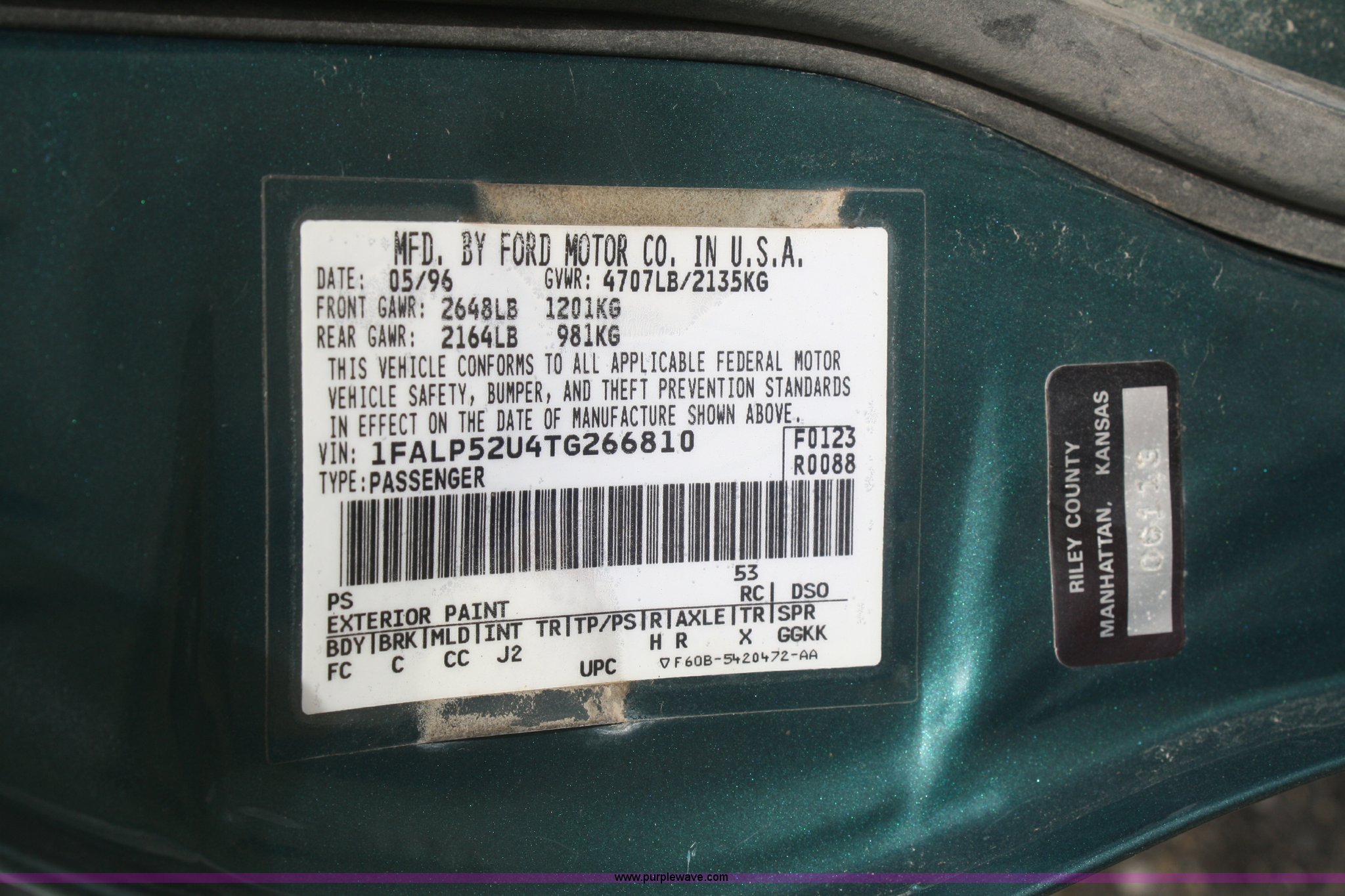 1996 Ford Taurus GL. 146,396 miles on odometer, 3.0L V6 OHV 12V gas engine, Automatic transmission, AC and heat, Tilt, Cruise, AM/FM/cassette, Power windows, locks, and mirrors, Cloth interior, 205/65R15 tires, Paint peeling. Seller is a government entity who will be assigning and distributing the title. Please contact the seller for distribution questions. 1FALP52U4TG266810. Shipping quotes available. Riley County Public Works. 6215 Tuttle Creek Blvd. Manhattan, KS 66503