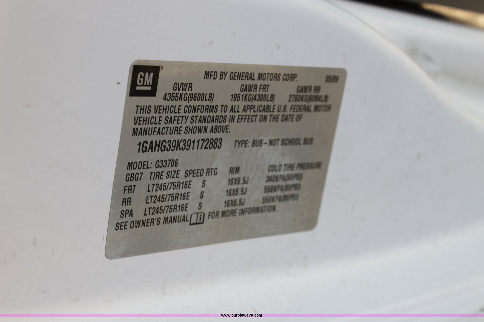 2009 Chevrolet Express 3500 Extended van. 174,931 miles on odometer, 6.0L V8 OHV 16V gas engine, Automatic transmission, AC and heat, Tilt, Cruise, AM/FM, Power windows and locks, Stabilitrak, 245/75R16 tires, Interior/exterior cosmetic damage, Dead battery, Unit# 3748. 1GAHG39K391172883. Shipping quotes available. Sedgwick County Fleet. Rose Hill, KS 67133