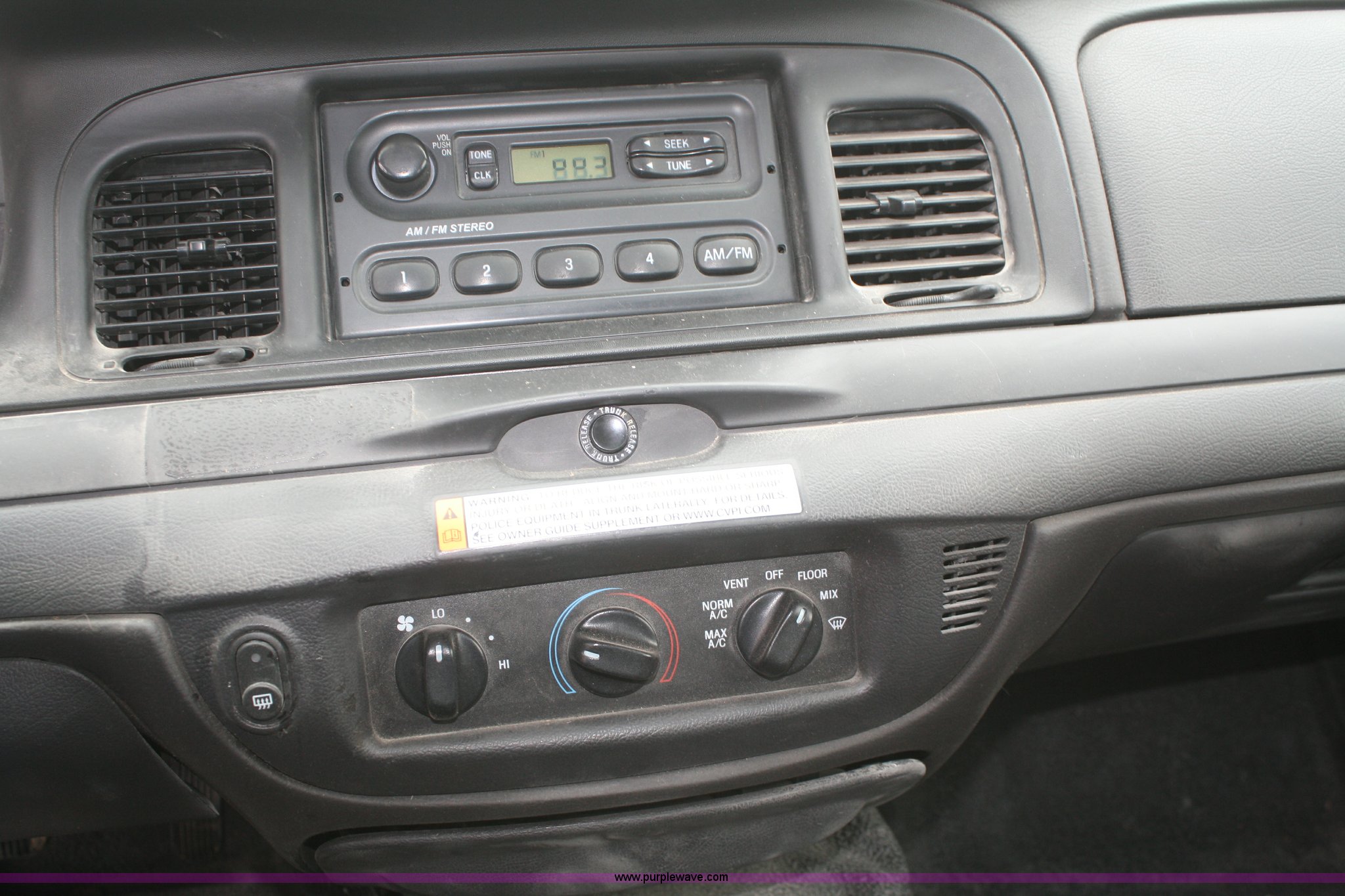 Purple Wave is selling a used Passenger Vehicle in Kansas. This item is a 2010 Ford Crown Victoria Police Interceptor with the following: 108,613 miles on odometer, 4.6L V8 SOHC 16V FFV gas engine, Automatic transmission, AC and heat, Tilt, Cruise, AM/FM, Power windows, locks, mirrors, and seats, Cloth interior, 235/55R17 tires