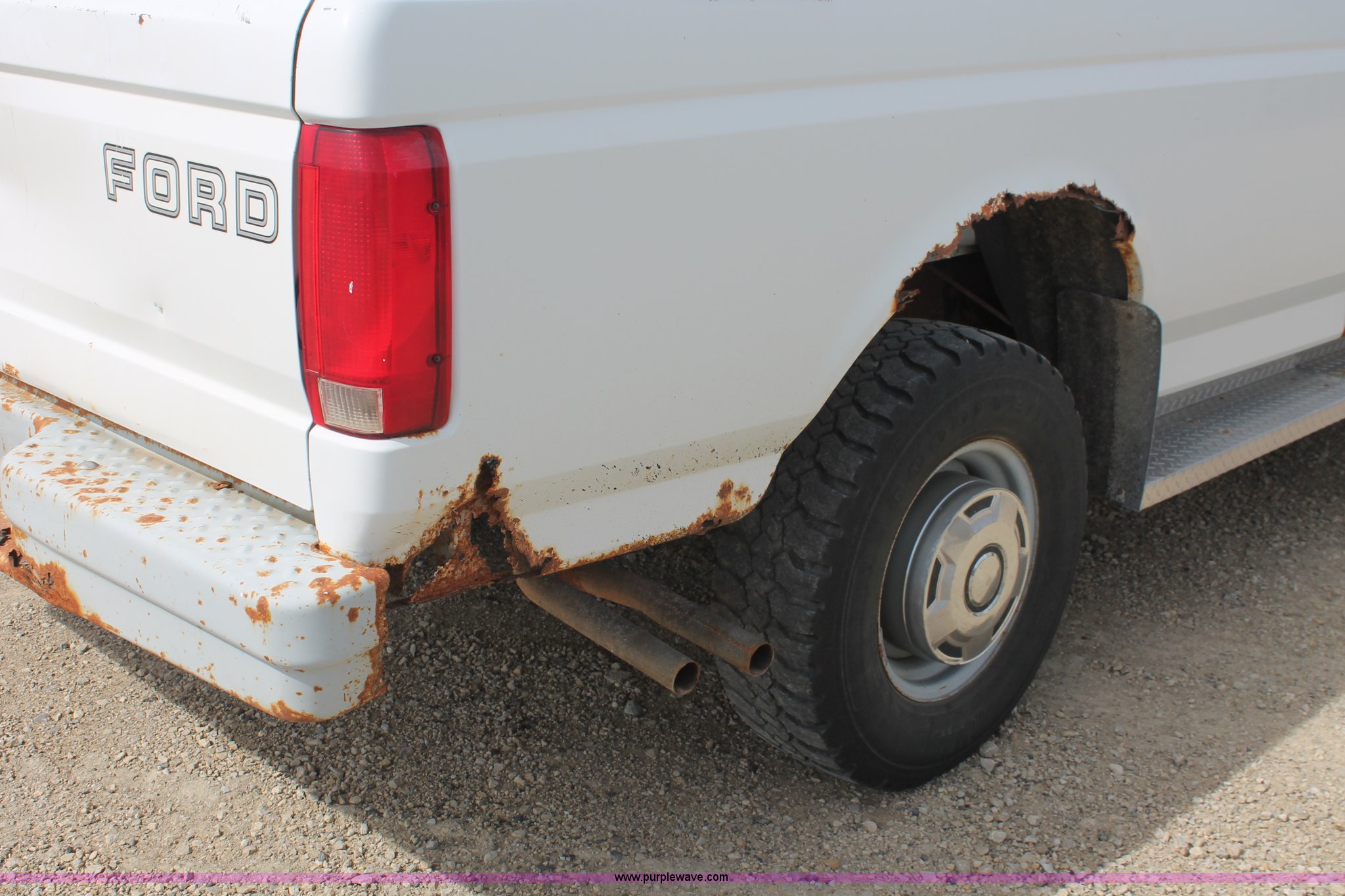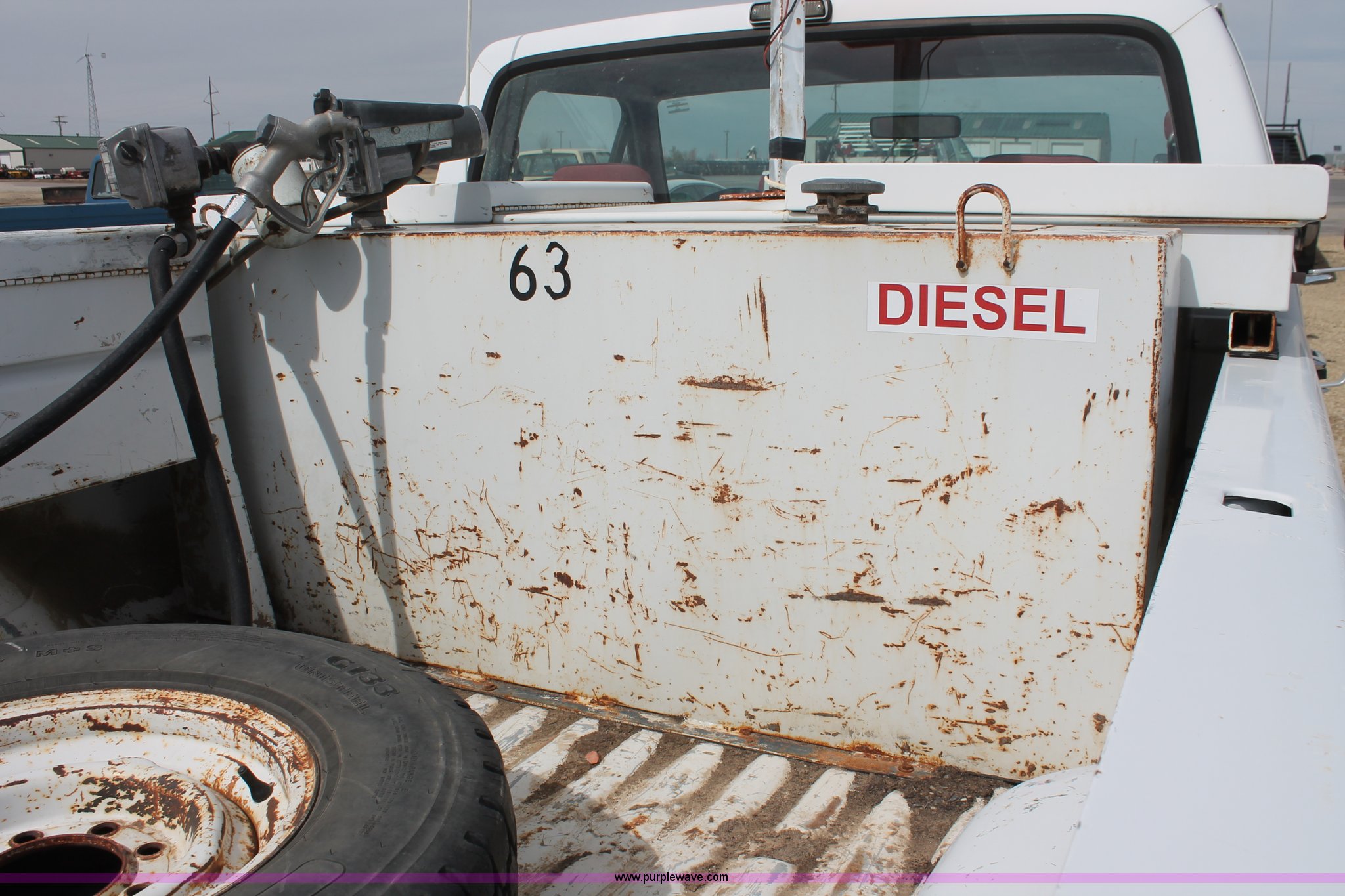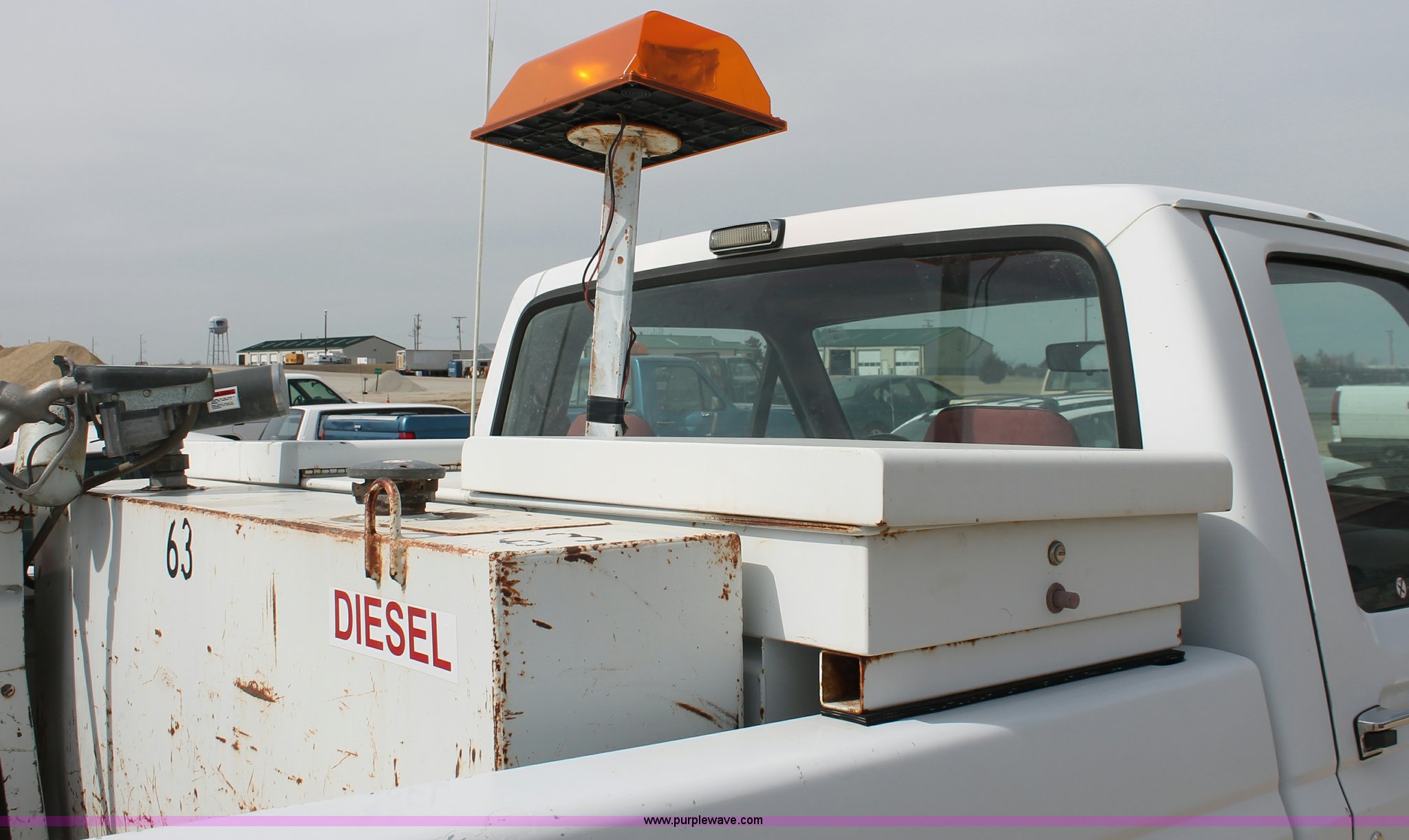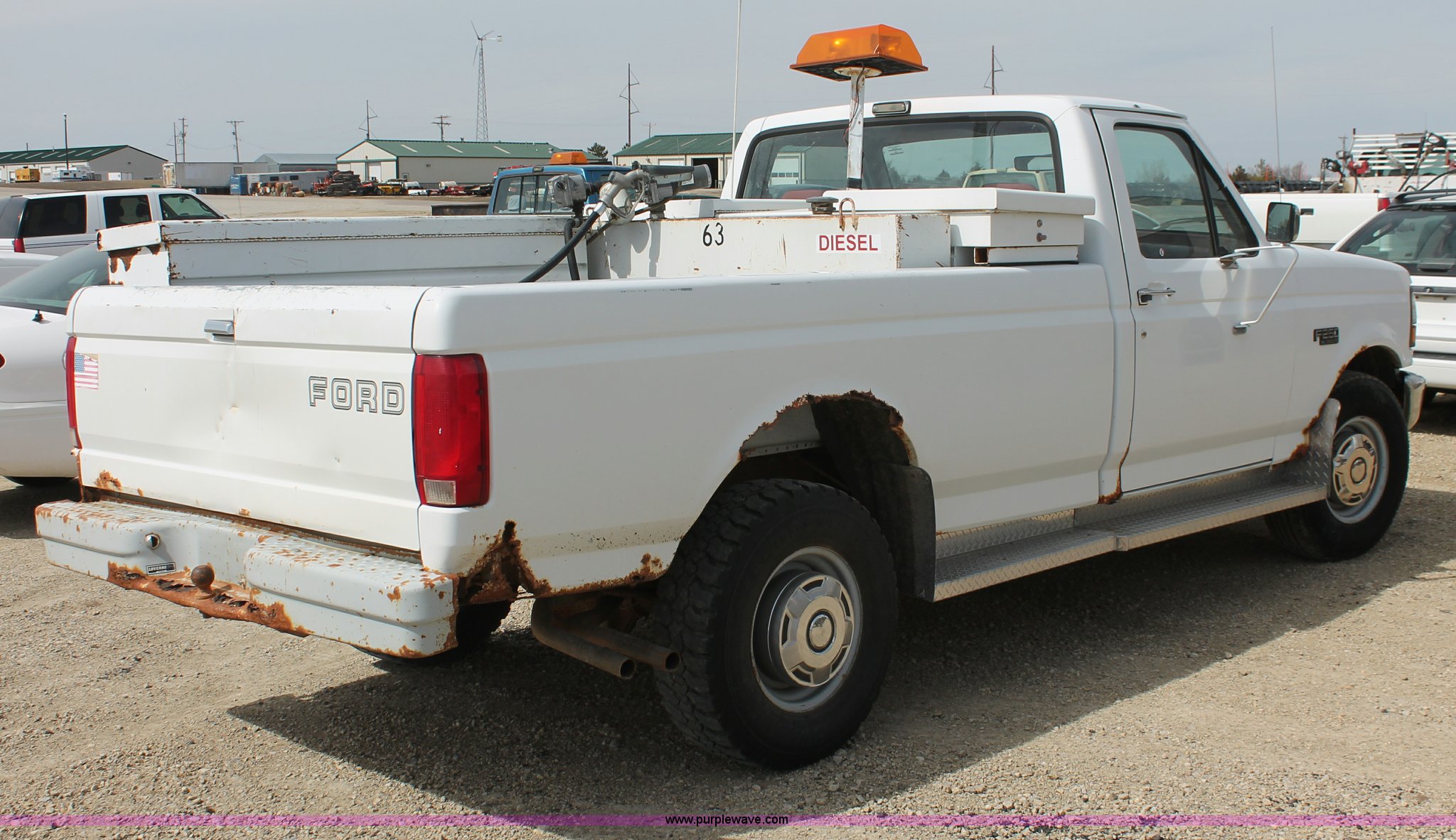 Purple Wave is selling a used Passenger Vehicle in Kansas. This item is a 1993 Ford F250 XL pickup truck with the following: 137,971 miles on odometer, 5.8L V8 OHV 16V gas engine, Five speed manual transmission, AC and heat, AM/FM, Manual windows and locks, Vinyl interior, Long bed, Toolboxes, 105 gallon transfer fuel tank, Electric pump and meter, 235/85R16 tires, Rust