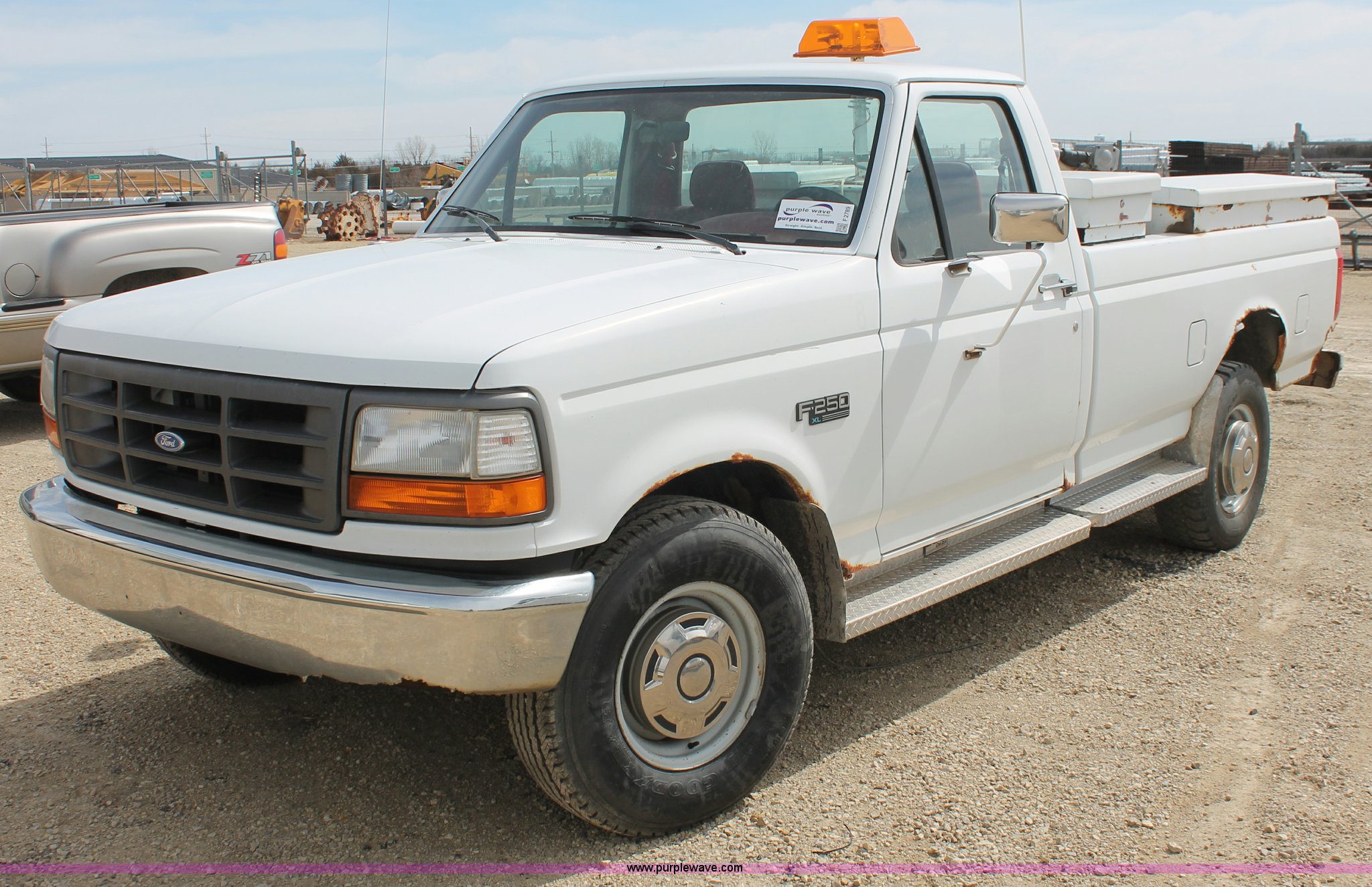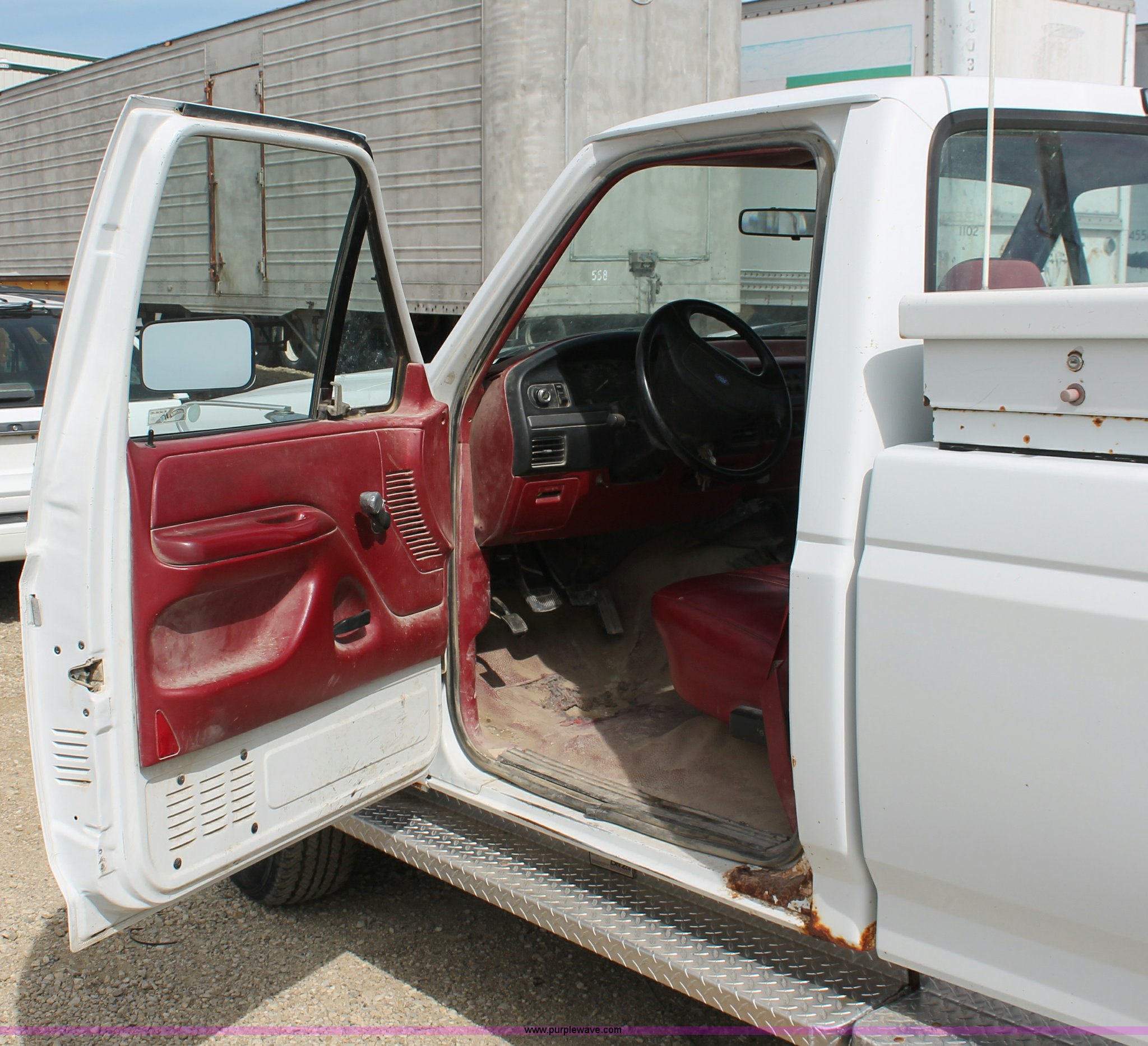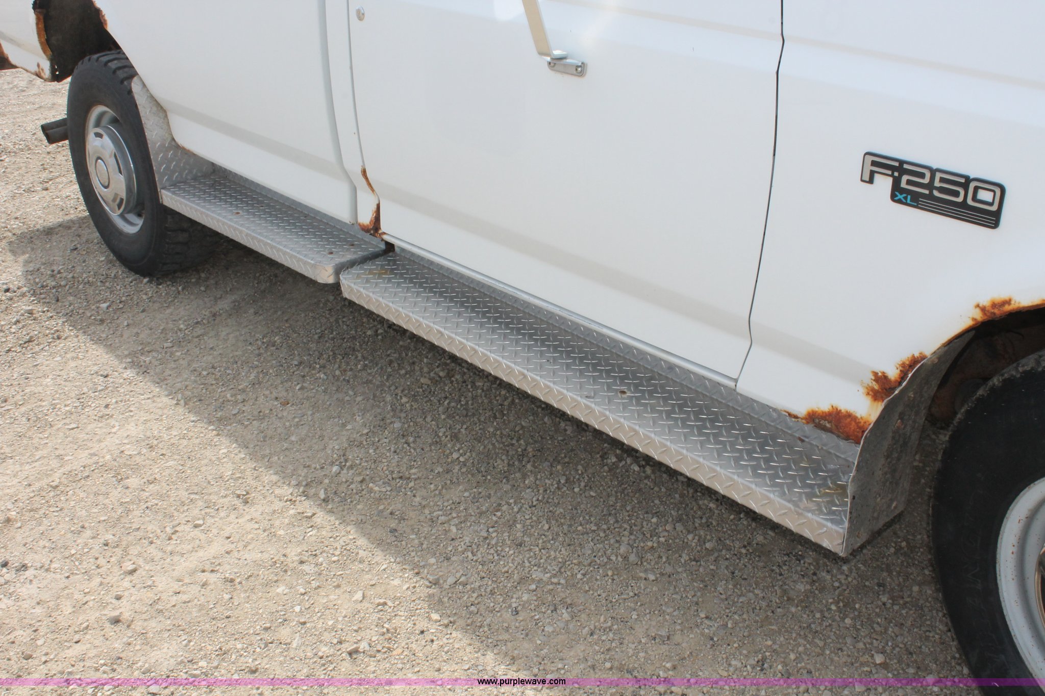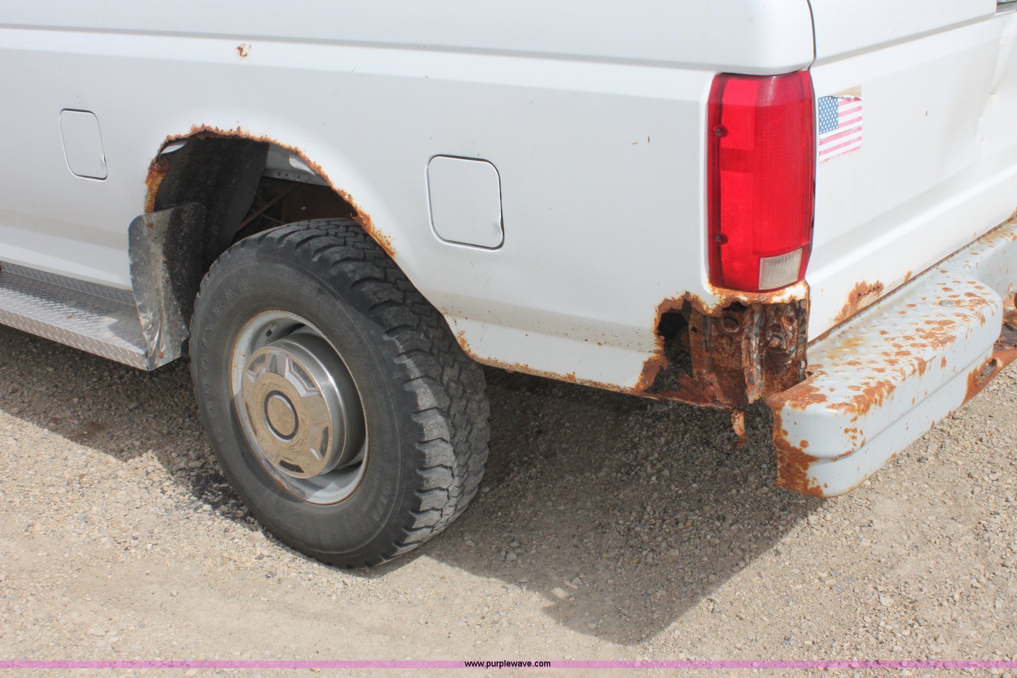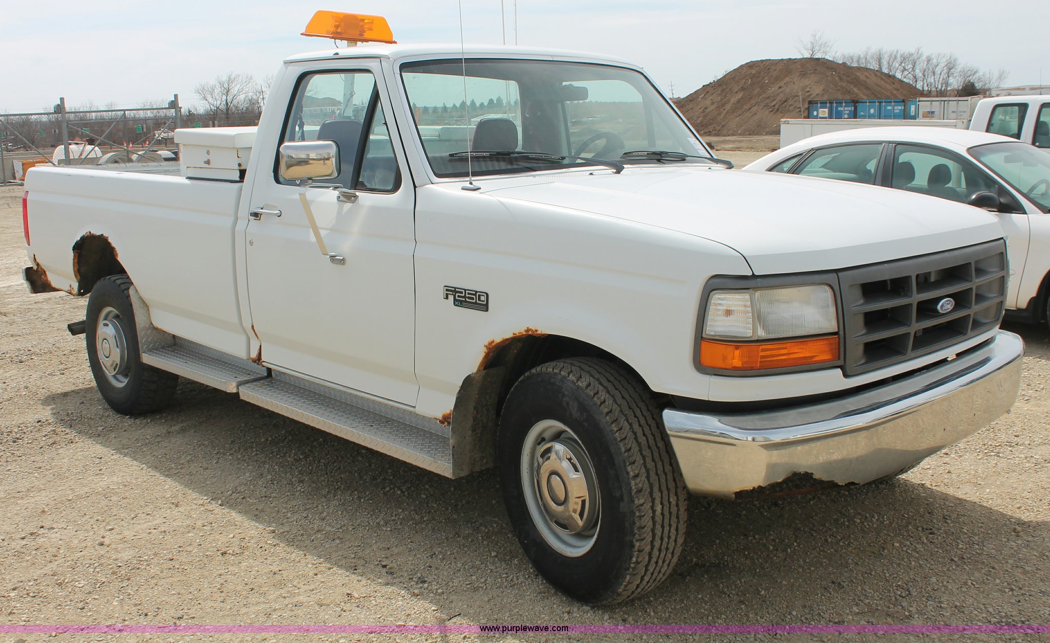 Purple Wave is selling a used Passenger Vehicle in Kansas. This item is a 1993 Ford F250 XL pickup truck with the following: 137,971 miles on odometer, 5.8L V8 OHV 16V gas engine, Five speed manual transmission, AC and heat, AM/FM, Manual windows and locks, Vinyl interior, Long bed, Toolboxes, 105 gallon transfer fuel tank, Electric pump and meter, 235/85R16 tires, Rust