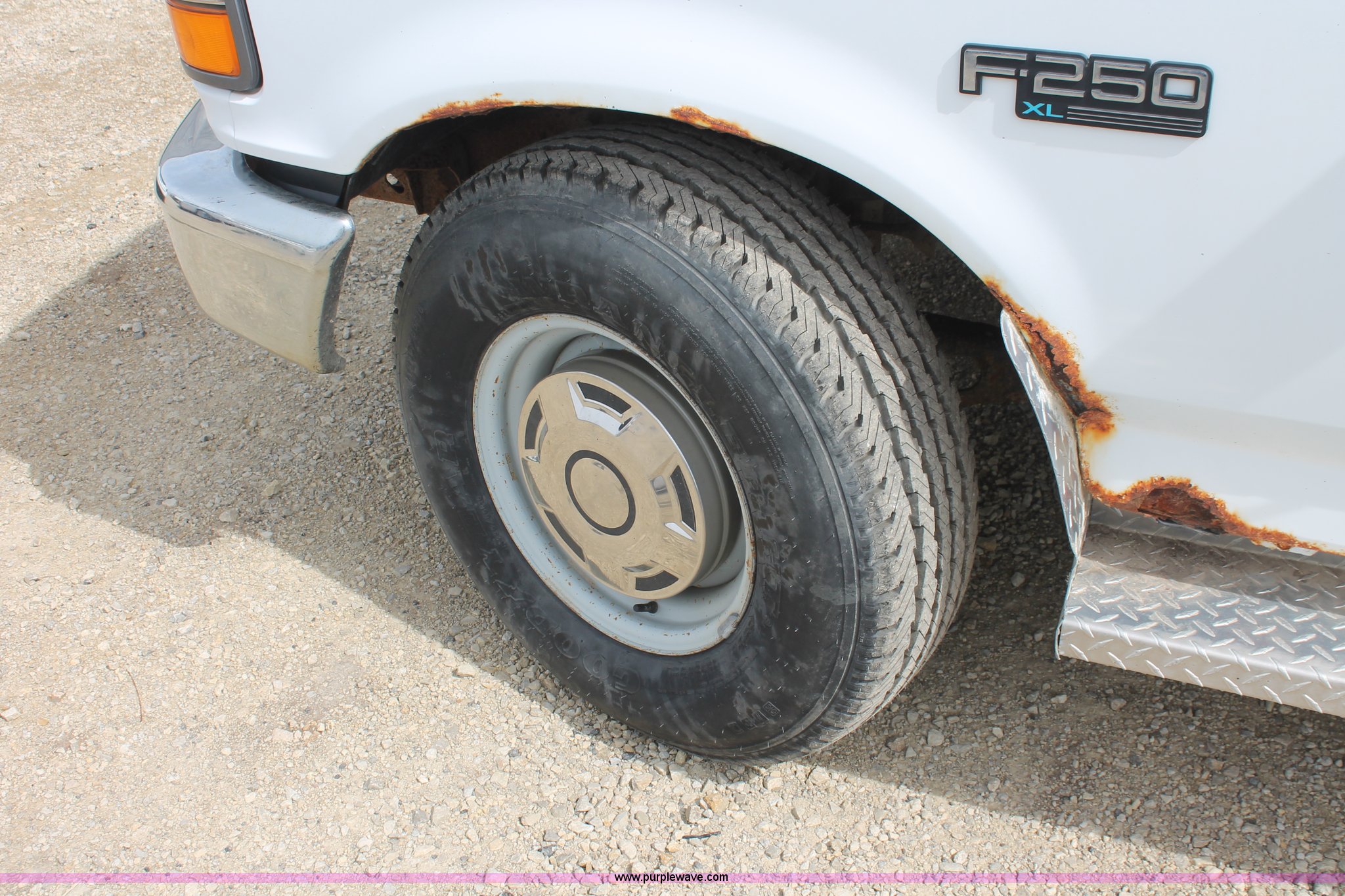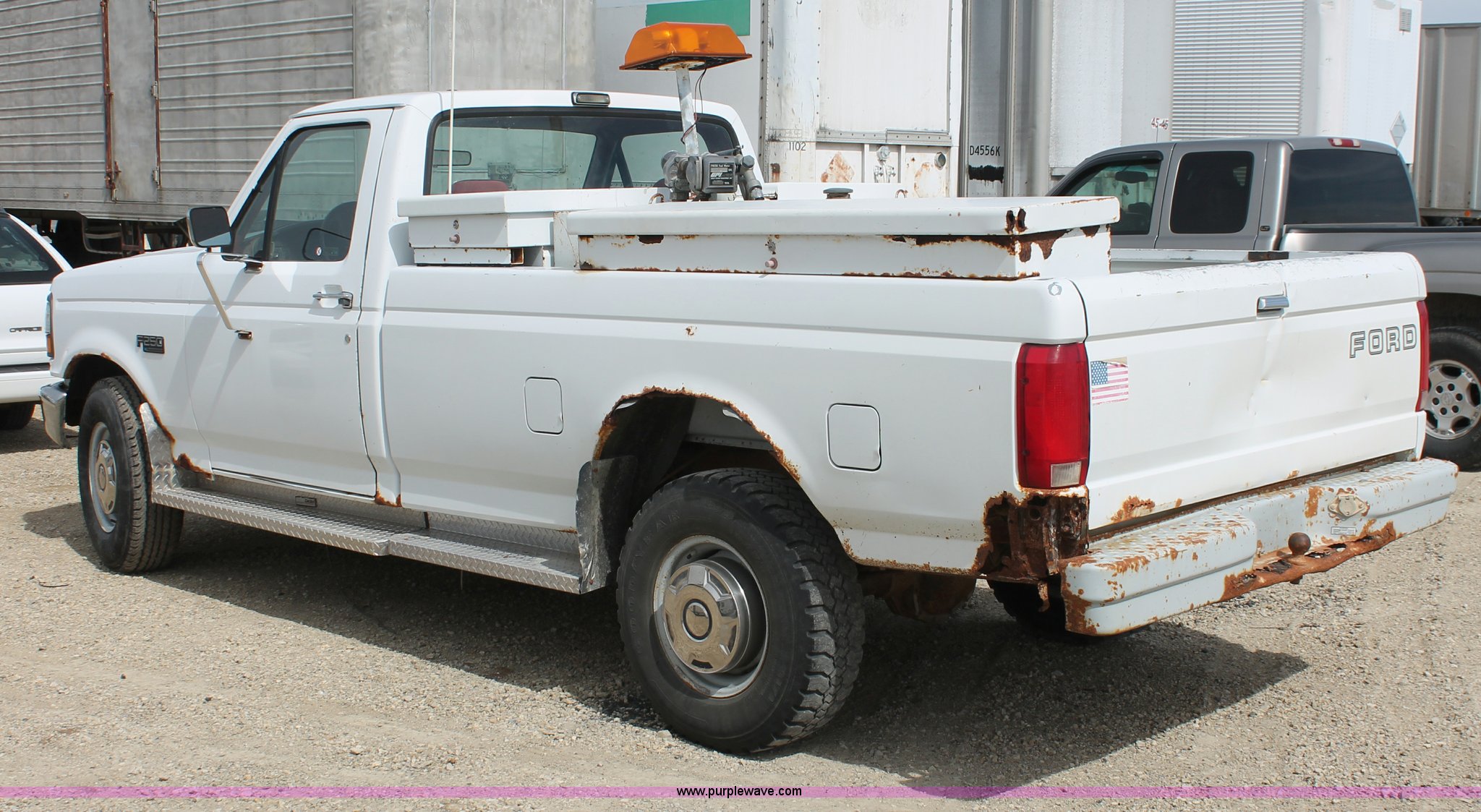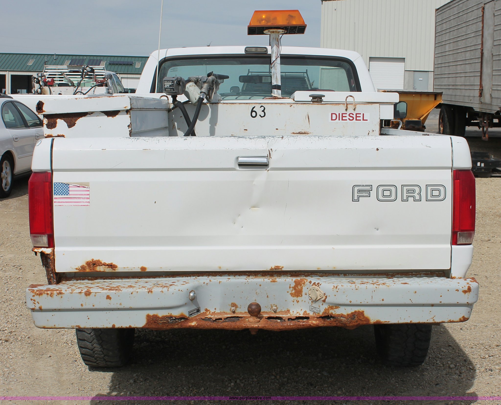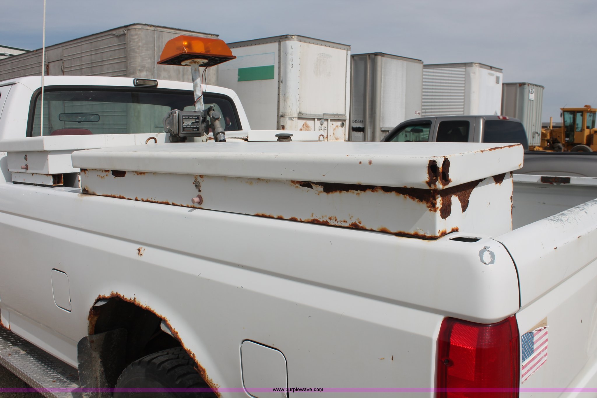 Purple Wave is selling a used Passenger Vehicle in Kansas. This item is a 1993 Ford F250 XL pickup truck with the following: 137,971 miles on odometer, 5.8L V8 OHV 16V gas engine, Five speed manual transmission, AC and heat, AM/FM, Manual windows and locks, Vinyl interior, Long bed, Toolboxes, 105 gallon transfer fuel tank, Electric pump and meter, 235/85R16 tires, Rust