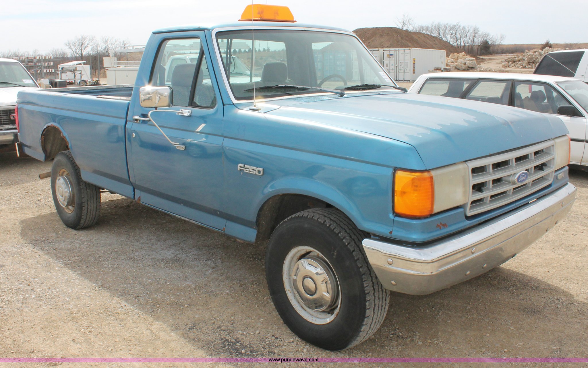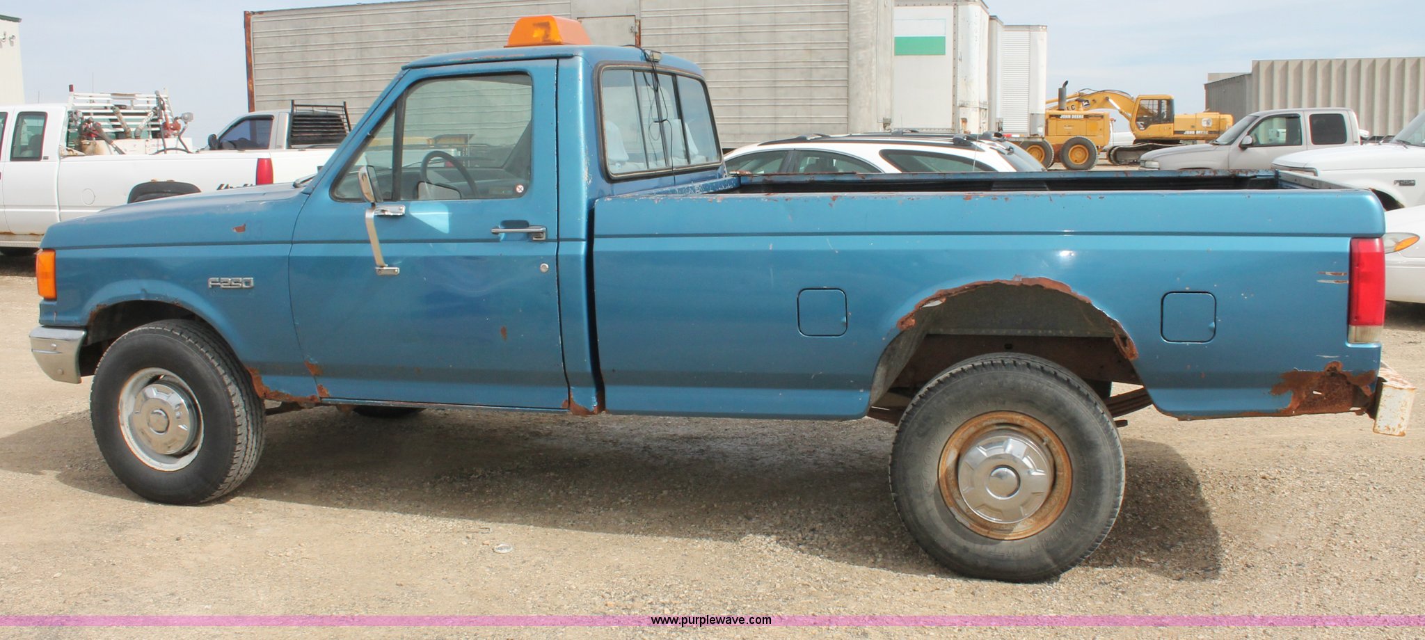 Purple Wave is selling a used Passenger Vehicle in Kansas. This item is a 1990 Ford F250 pickup truck with the following: 189,620 miles on odometer, 4.9L L6 OHV 12V gas engine, Five speed manual transmission, Heat, AM/FM, Manual windows and locks, Cloth interior, Long bed, 235/85R16 tires, Dead battery, Rust