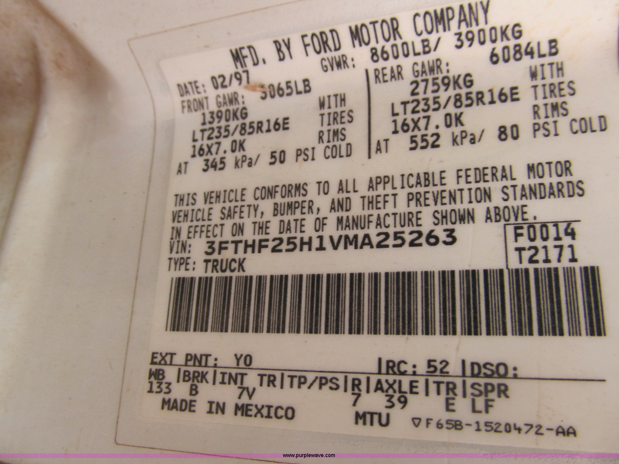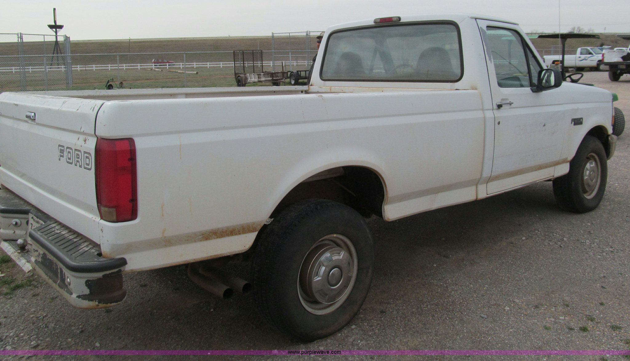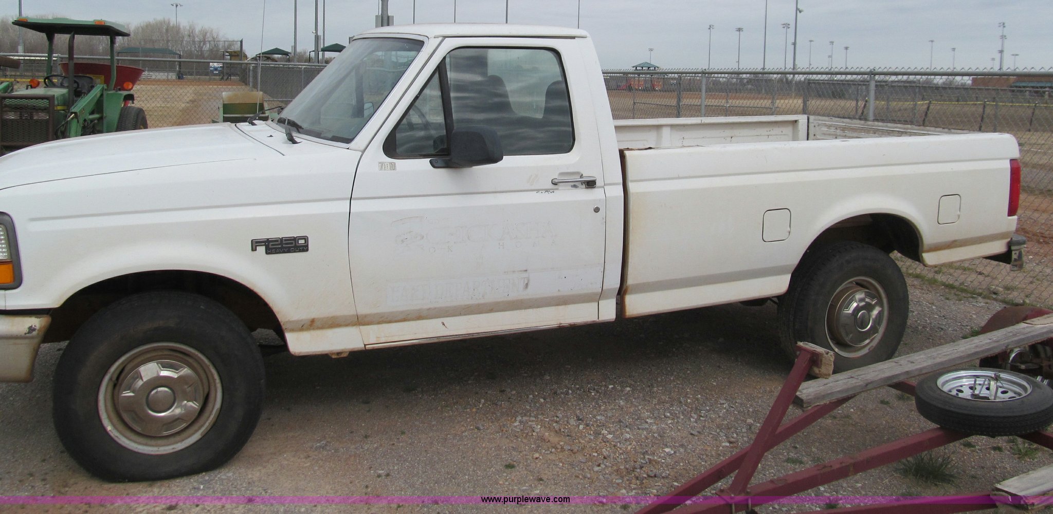Purple Wave is selling a used Passenger Vehicle in Oklahoma. This item is a 1997 Ford F250 pickup truck with the following: 95,632 miles on odometer, 5.8L V8 OHV 16V gas engine, Automatic transmission, AC and heat, AM/FM, Manual windows and locks, Cloth interior, Long bed, LT245/75R16 tires, Interior cosmetic damage, Vehicle will not start