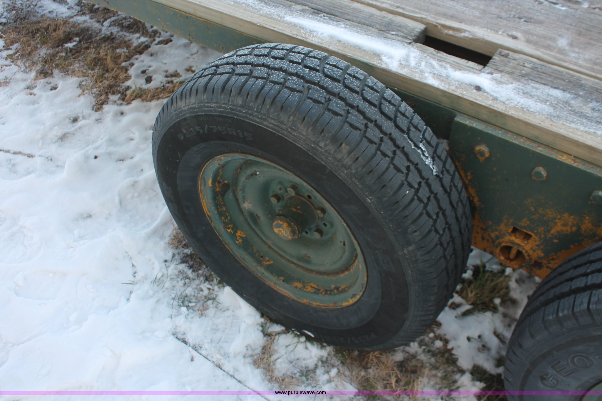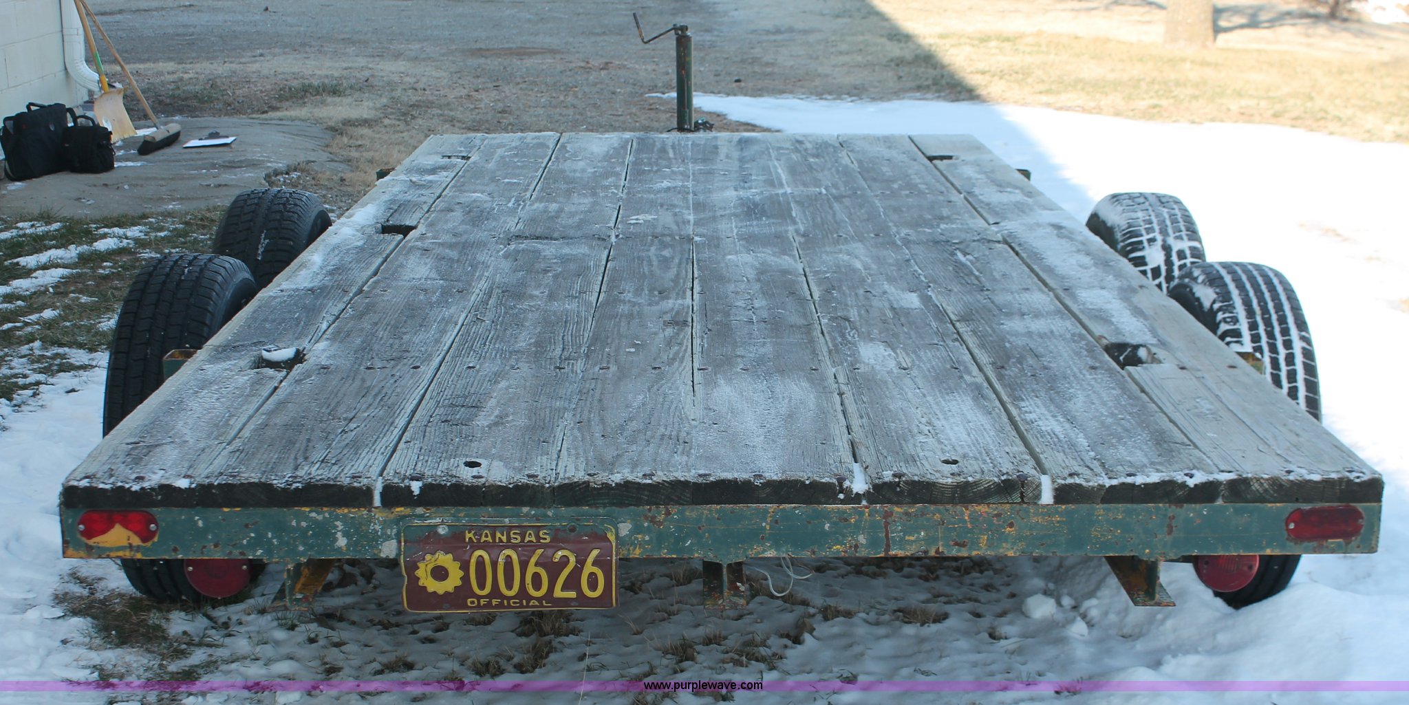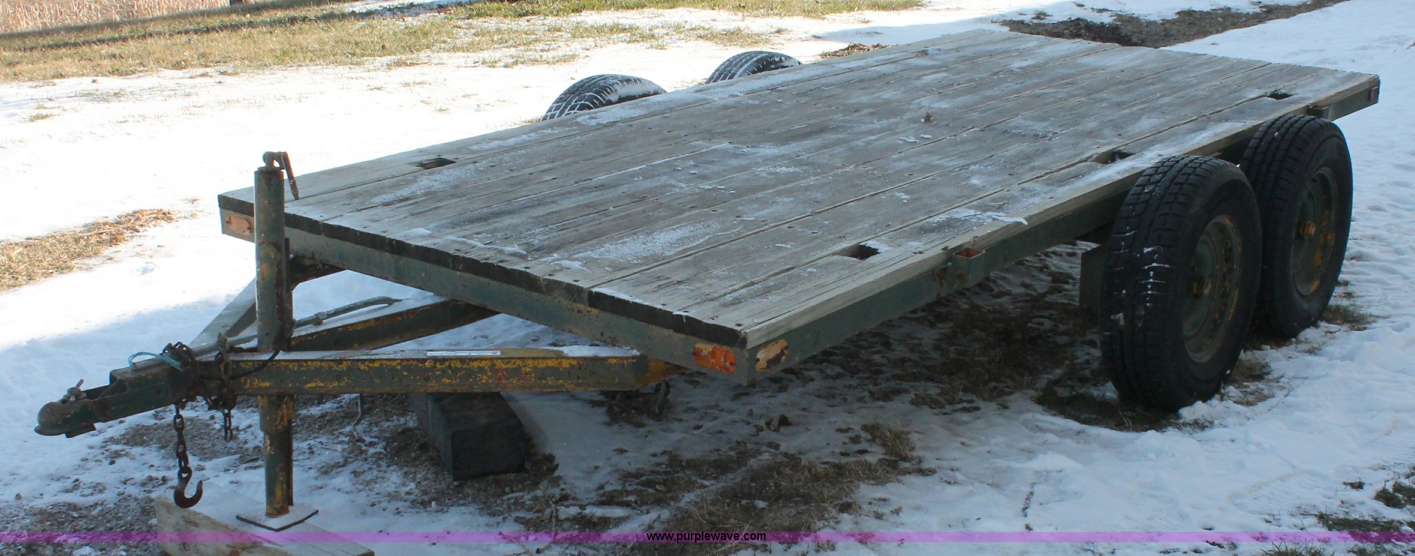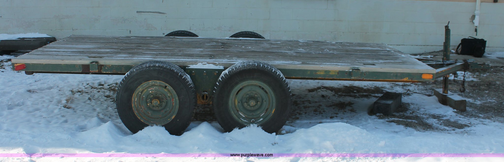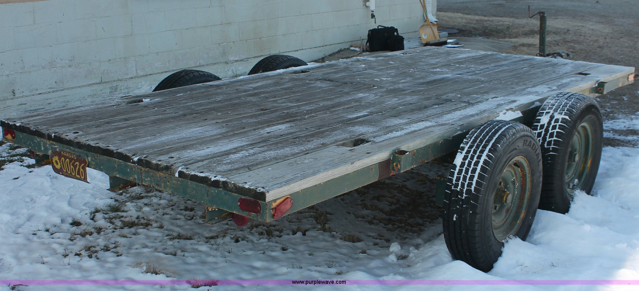 Purple Wave is selling a used Car or Utility Trailer in Kansas. This item is a 1994 shop built tandem axle trailer with the following: 160"L x 72"W deck, 40"L neck, 200" overall length, 2" x 10" wood deck, Steel frame, Recessed clevis tie downs, 2" ball, Six prong wiring, P235/75R15 tires, Serial 115281