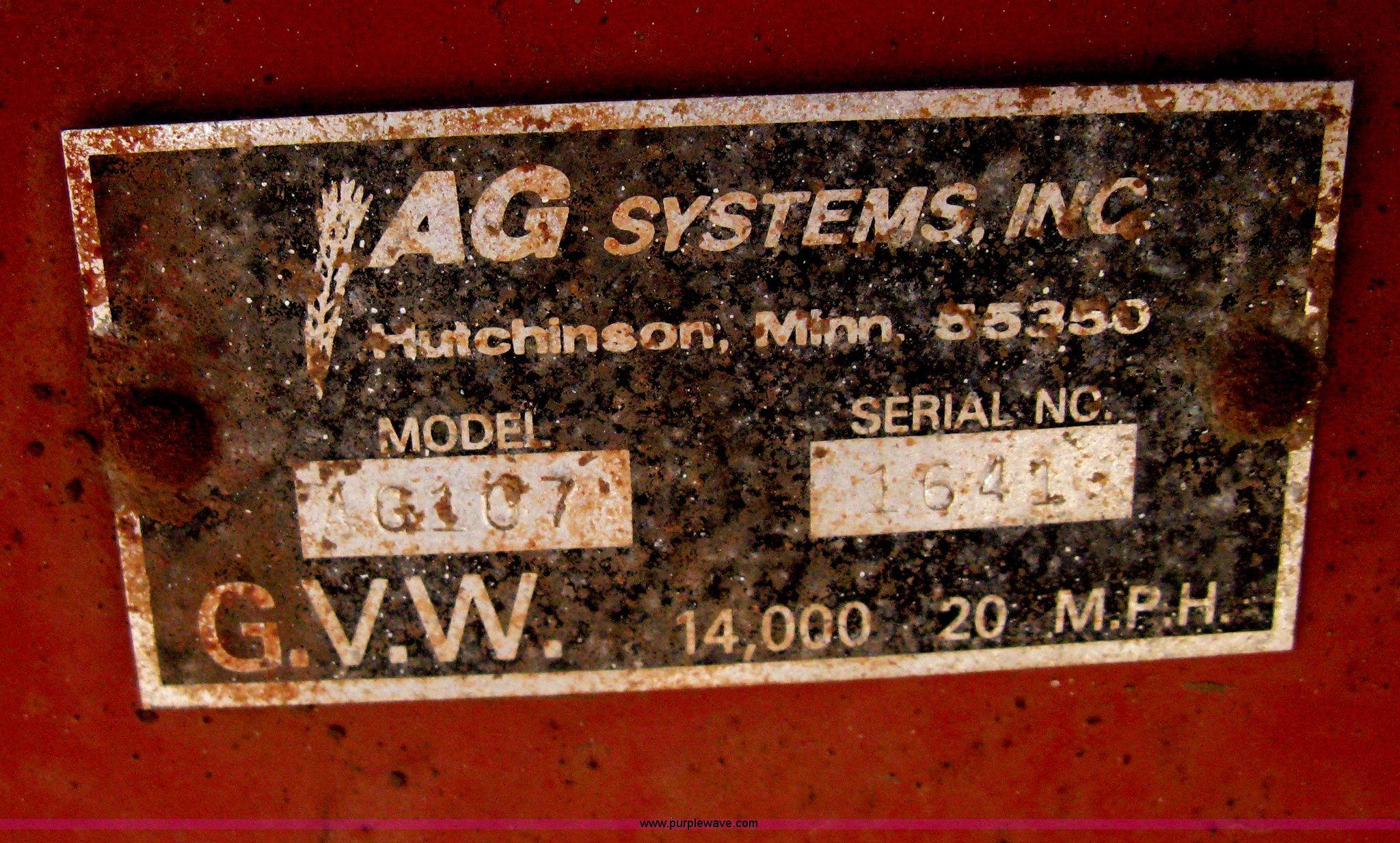 Anhydrous ammonia tank. 1,000 gallon capacity, AG system running gear Model G107, Serial 1641, Pin hitch, 11L-15 tires, six lug, Missing lug nuts, Tank failed inspection. Shipping quotes available. Farmers Cooperative Elevator, Co.. 202 S Sante Fe. Pretty Prairie , KS 67570