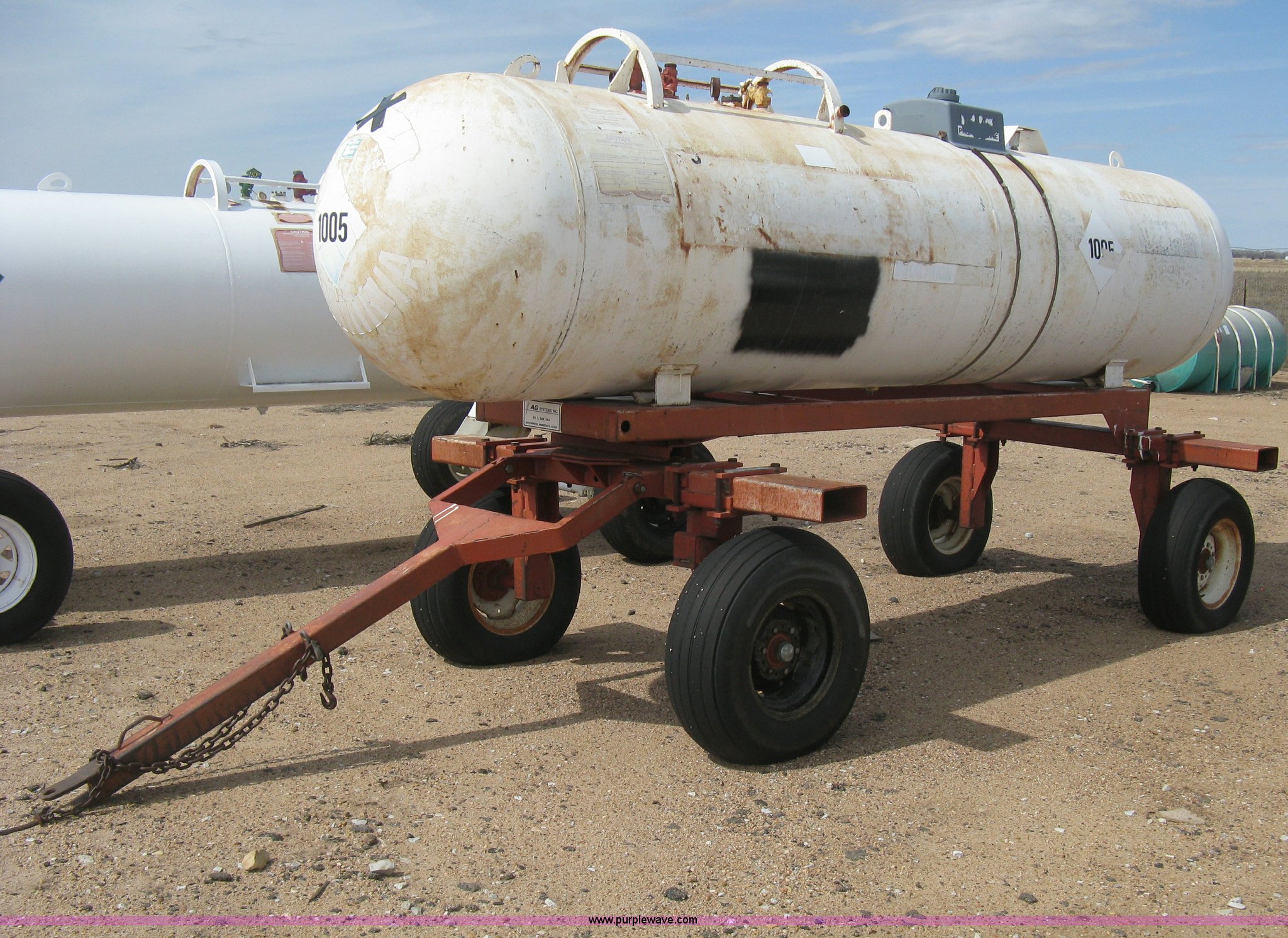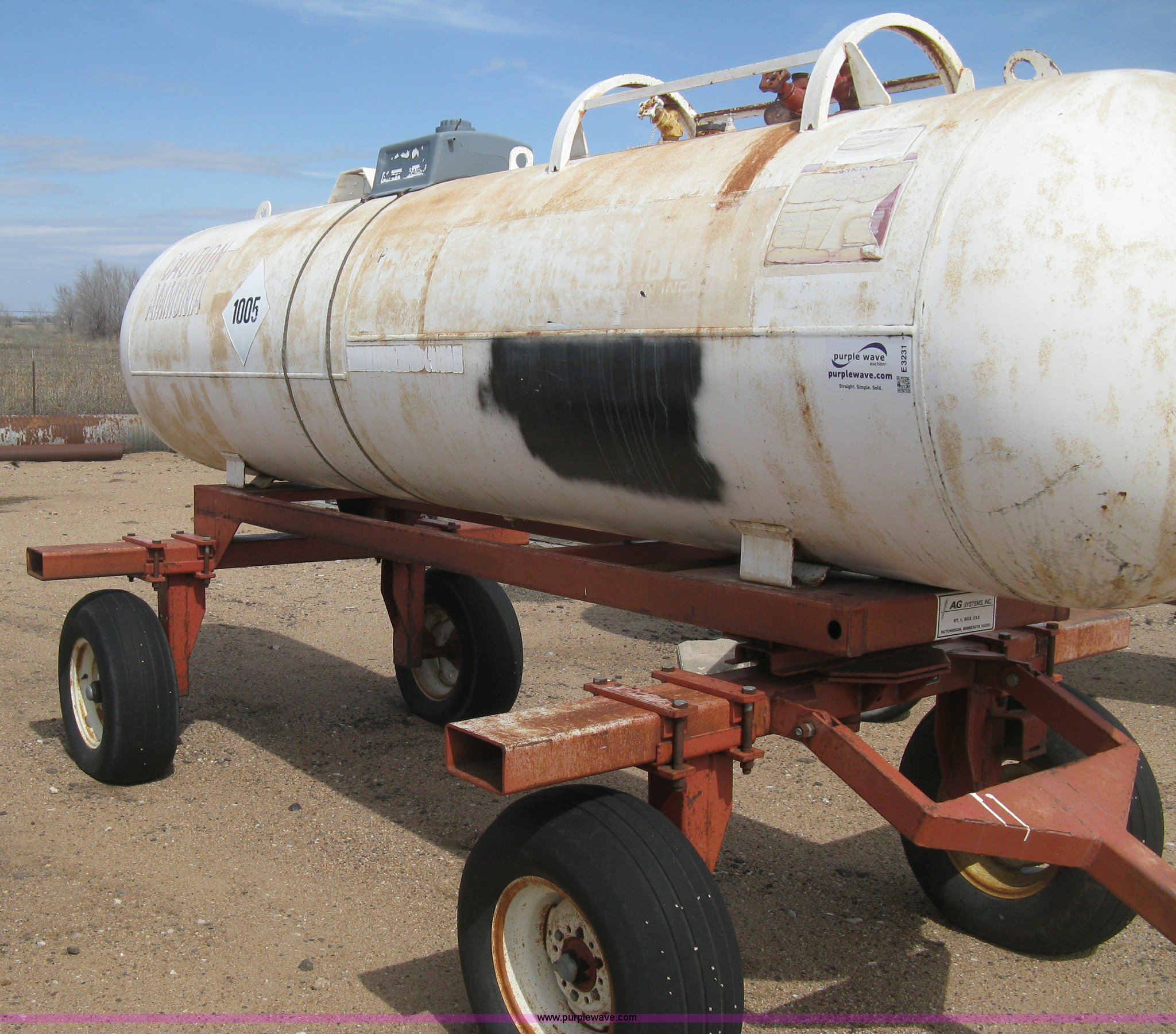 Purple Wave is selling a used Applicator Attach. in Kansas. This item is a Anhydrous ammonia tank with the following: 1,000 gallon capacity, Ag Systems running gear, Model G107, Serial 1669, Pin hitch, 11L-15 tires, six lug, Tank failed inspection