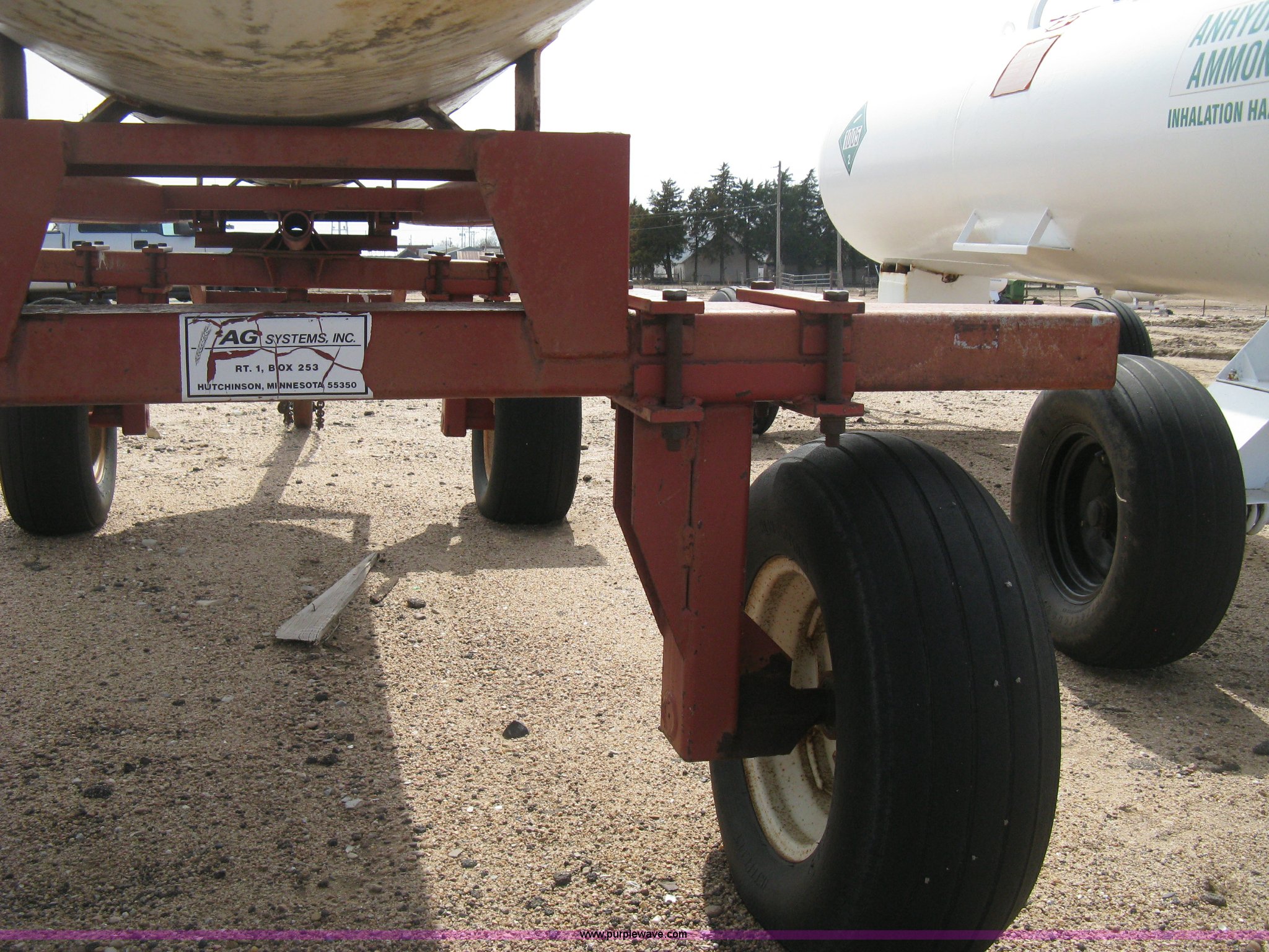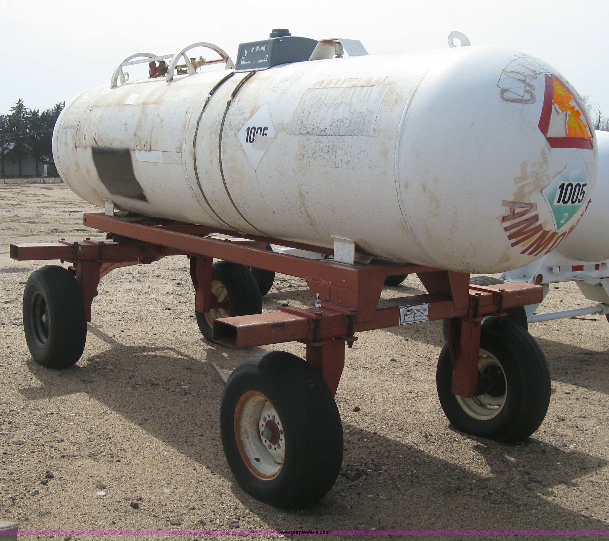 Anhydrous ammonia tank. 1,000 gallon capacity, Ag Systems running gear Model G107, Serial 1669, Pin hitch, 11L-15 tires, six lug, Tank failed inspection. Shipping quotes available. Farmers Cooperative Elevator, Co.. 202 S Sante Fe. Pretty Prairie , KS 67570