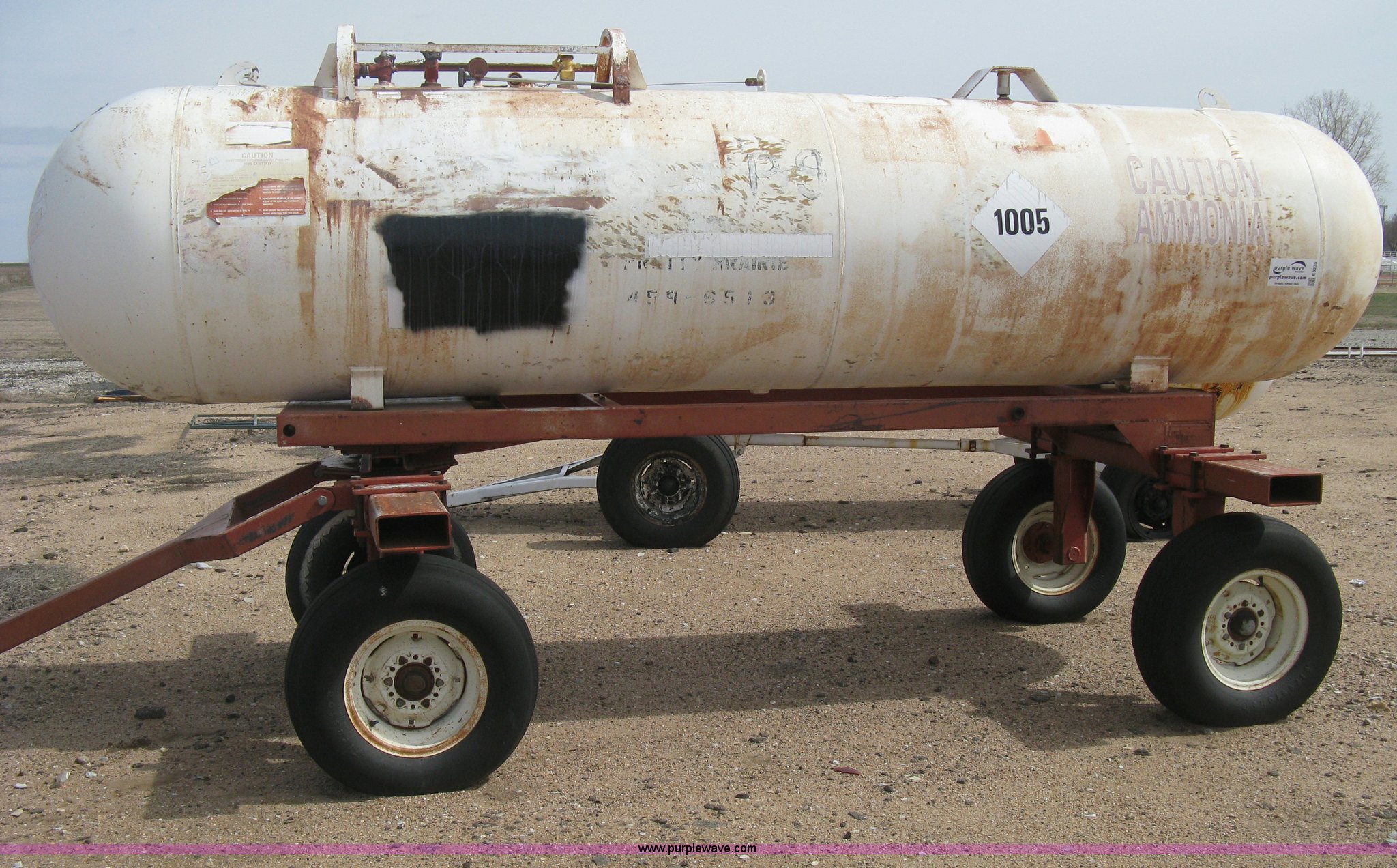 Anhydrous ammonia tank. 1,000 gallon capacity, Ag Systems running gear Model G107, Serial 1668, Pin hitch, 11L-15 tires, six lug, Tank failed inspection. Shipping quotes available. Farmers Cooperative Elevator, Co.. 202 S Sante Fe. Pretty Prairie , KS 67570