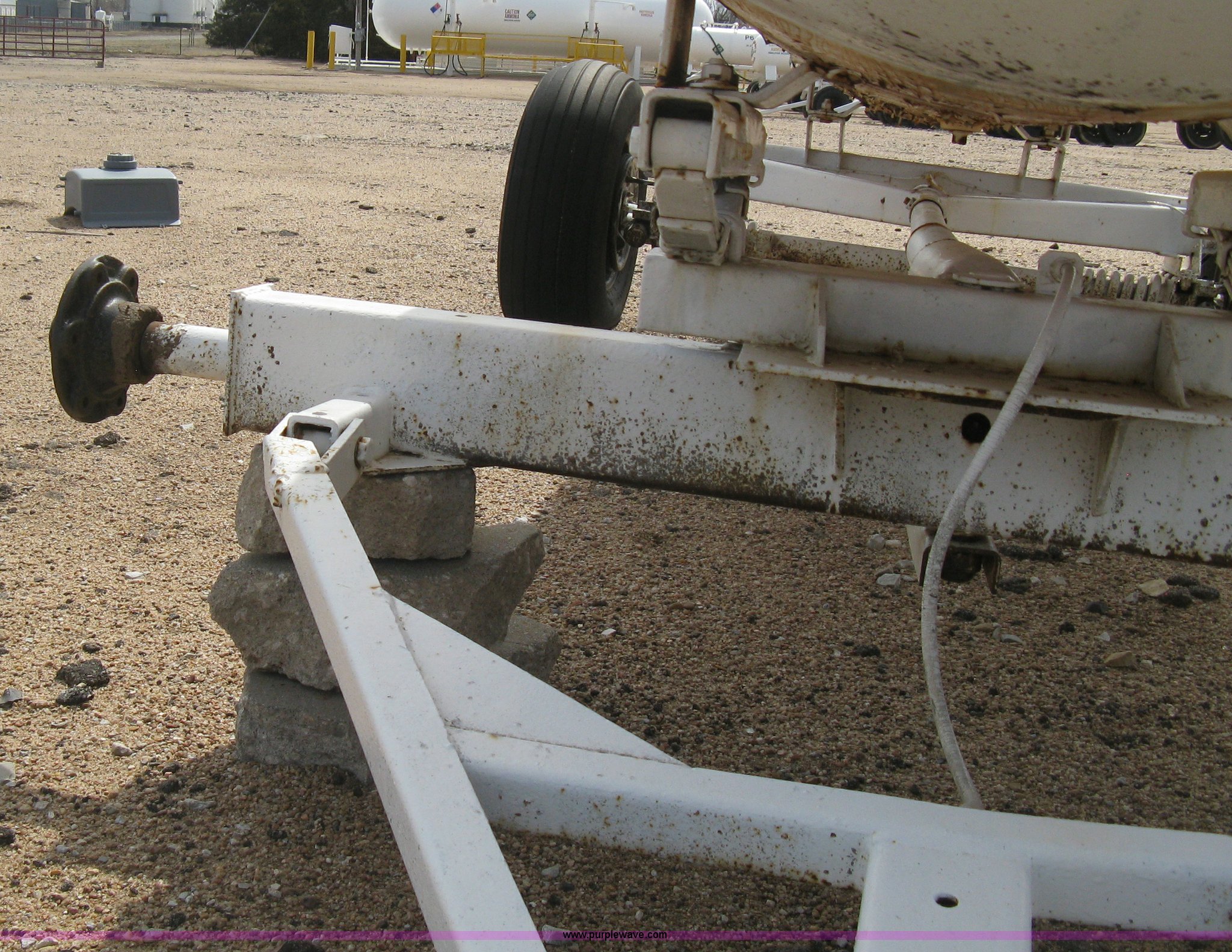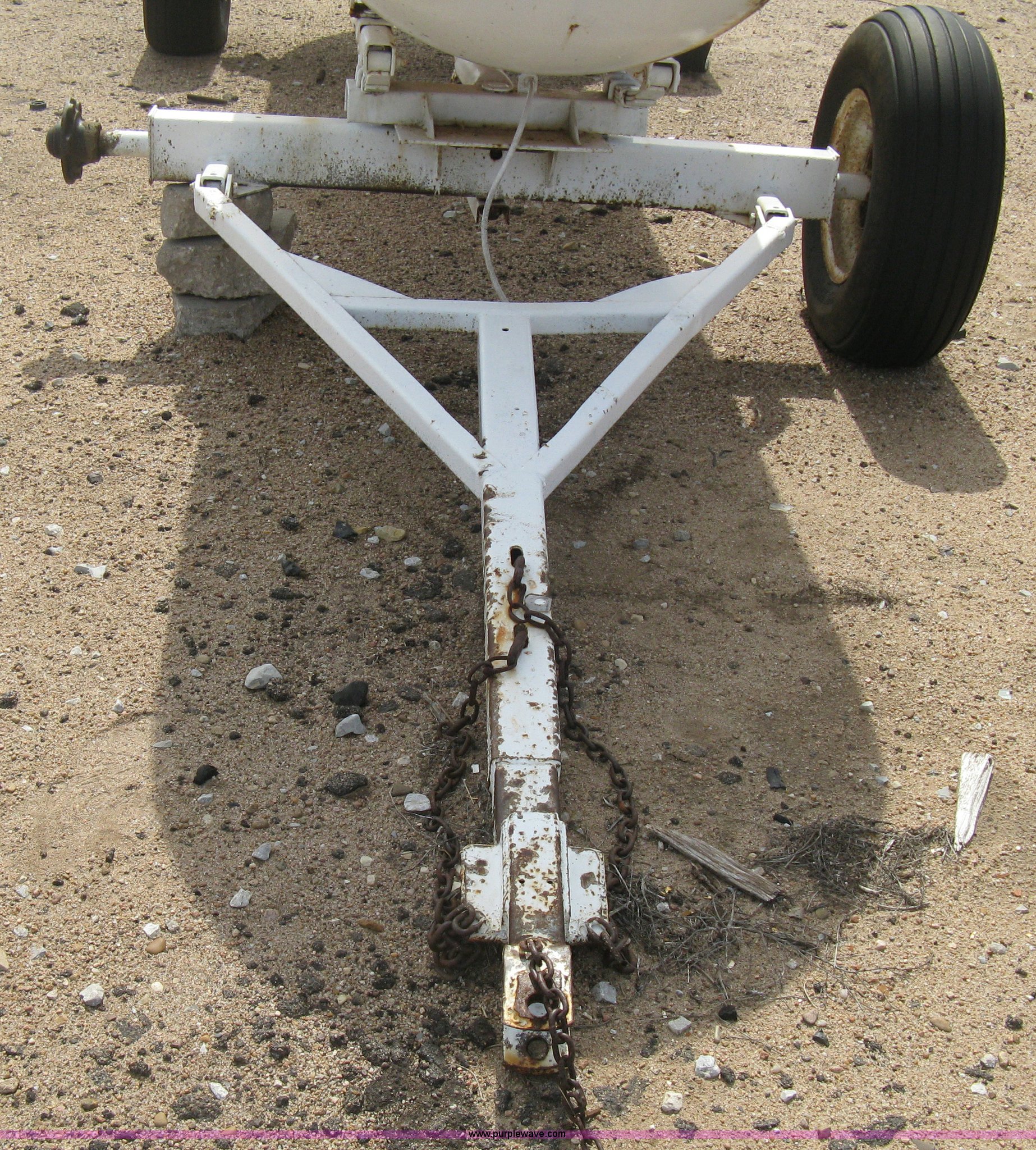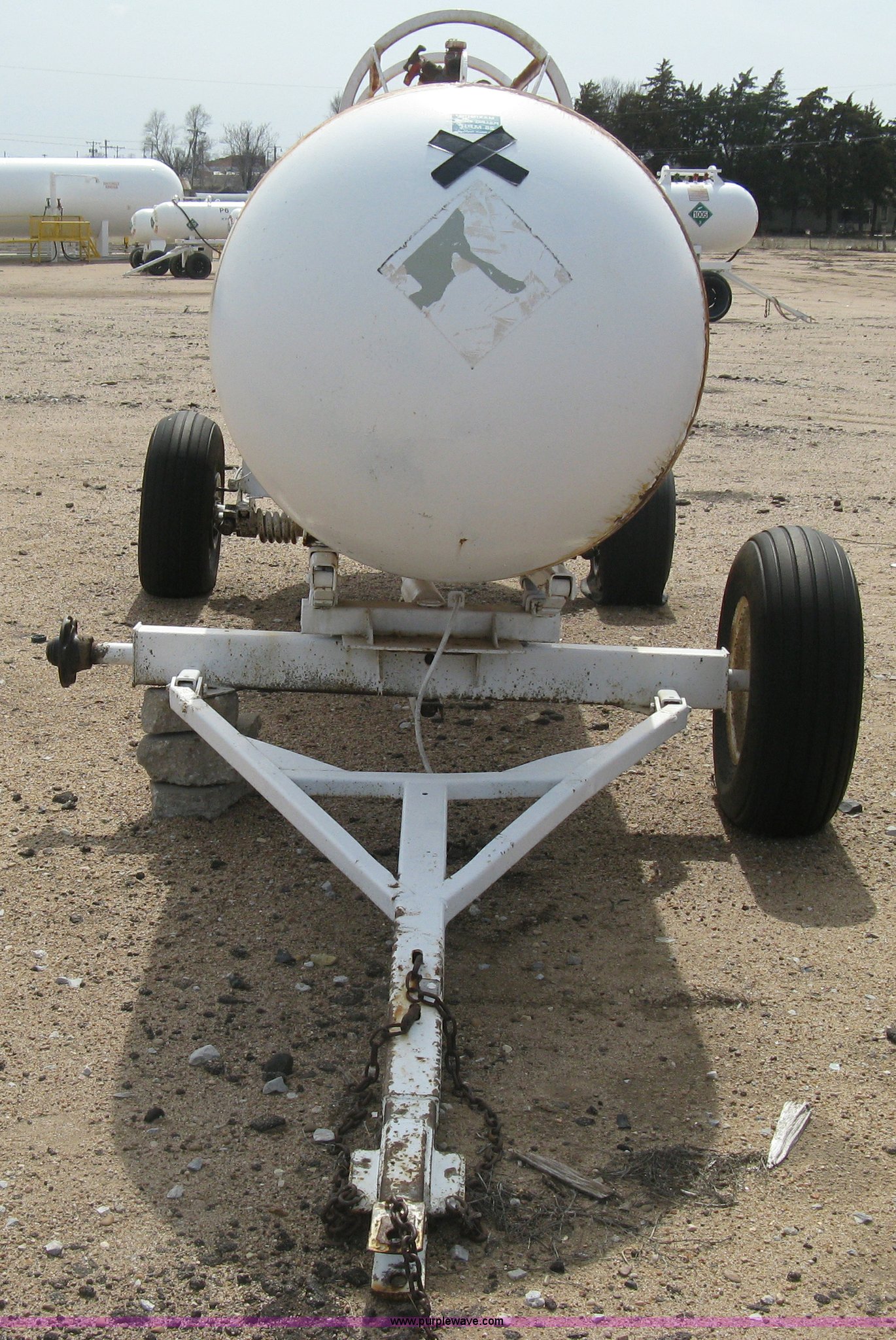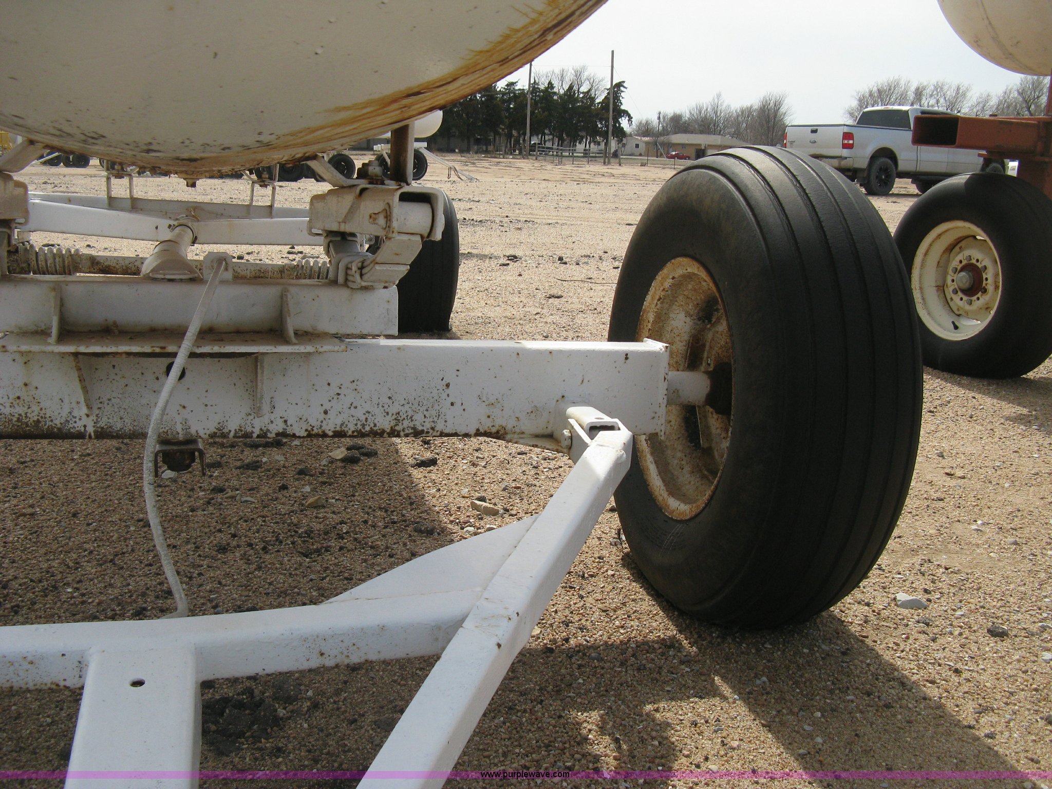 Purple Wave is selling a used Applicator Attach. in Kansas. This item is a Anhydrous ammonia tank with the following: 1,000 gallon capacity, Running gear, Pin hitch tongue, Rear pin hitch, (3) 11L-15 tires, six lug, One missing wheel, Tank failed inspection